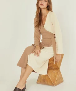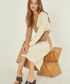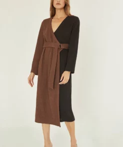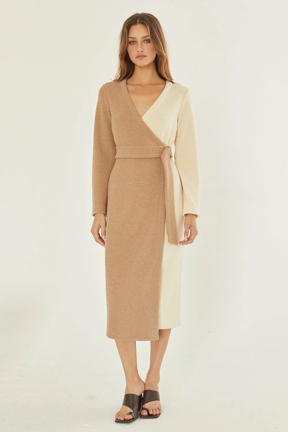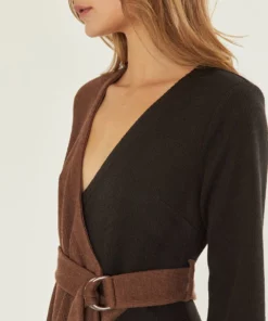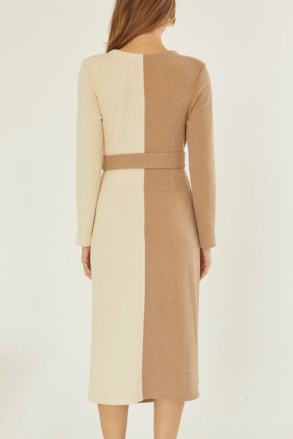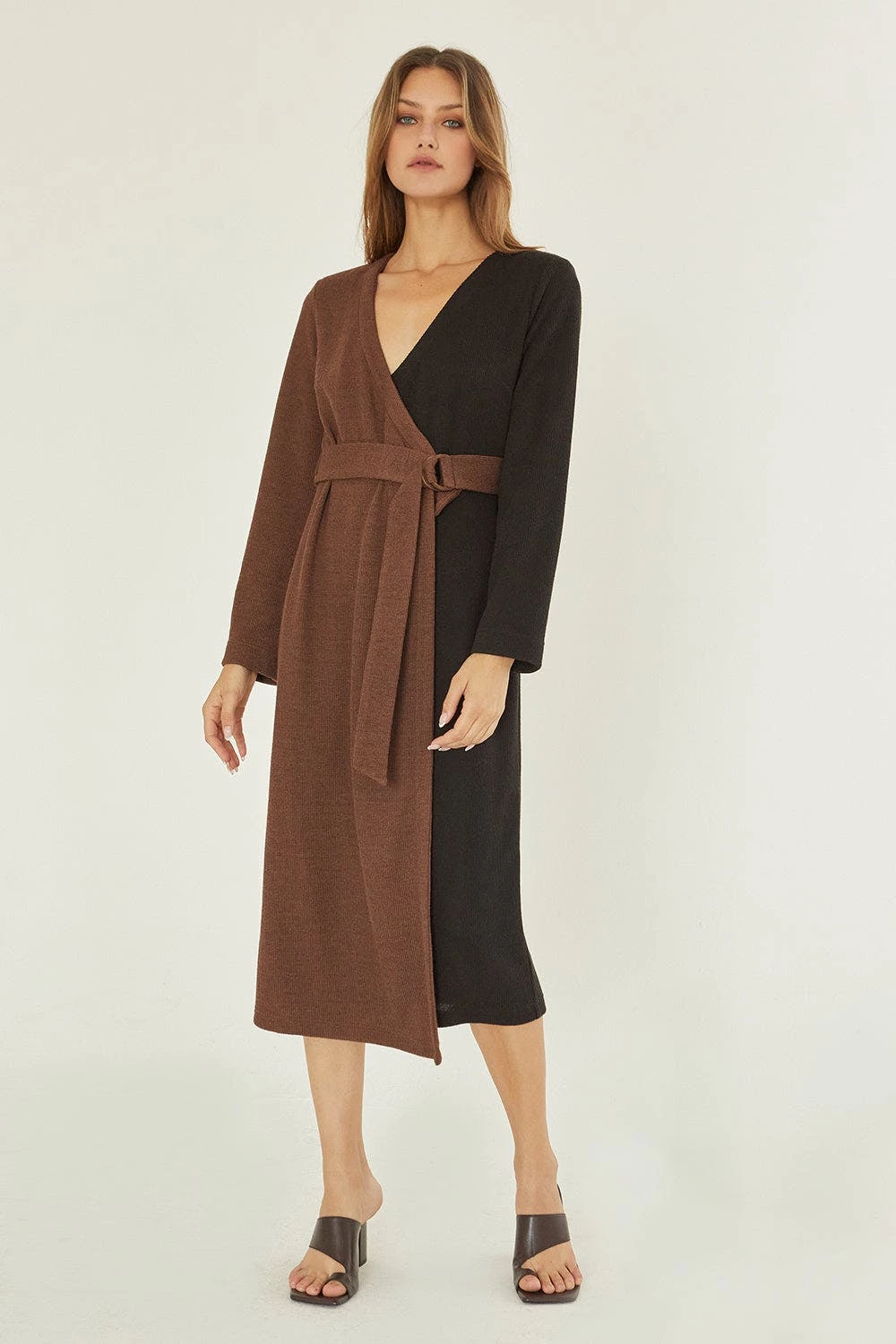 This ribbed knit midi dress features V-neckline, long sleeve, colorblock, front wrap over detail with tortoise D-ring waist belt closure.