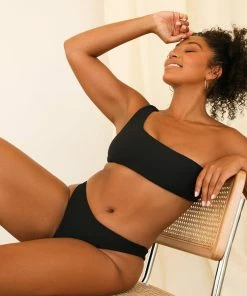 – Waffle fabric- Lined- One-Shoulder- Adjustable back ties- Elastic band