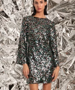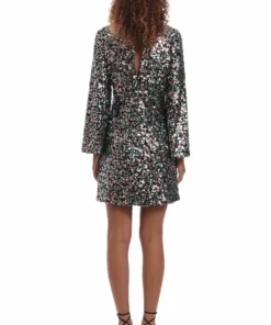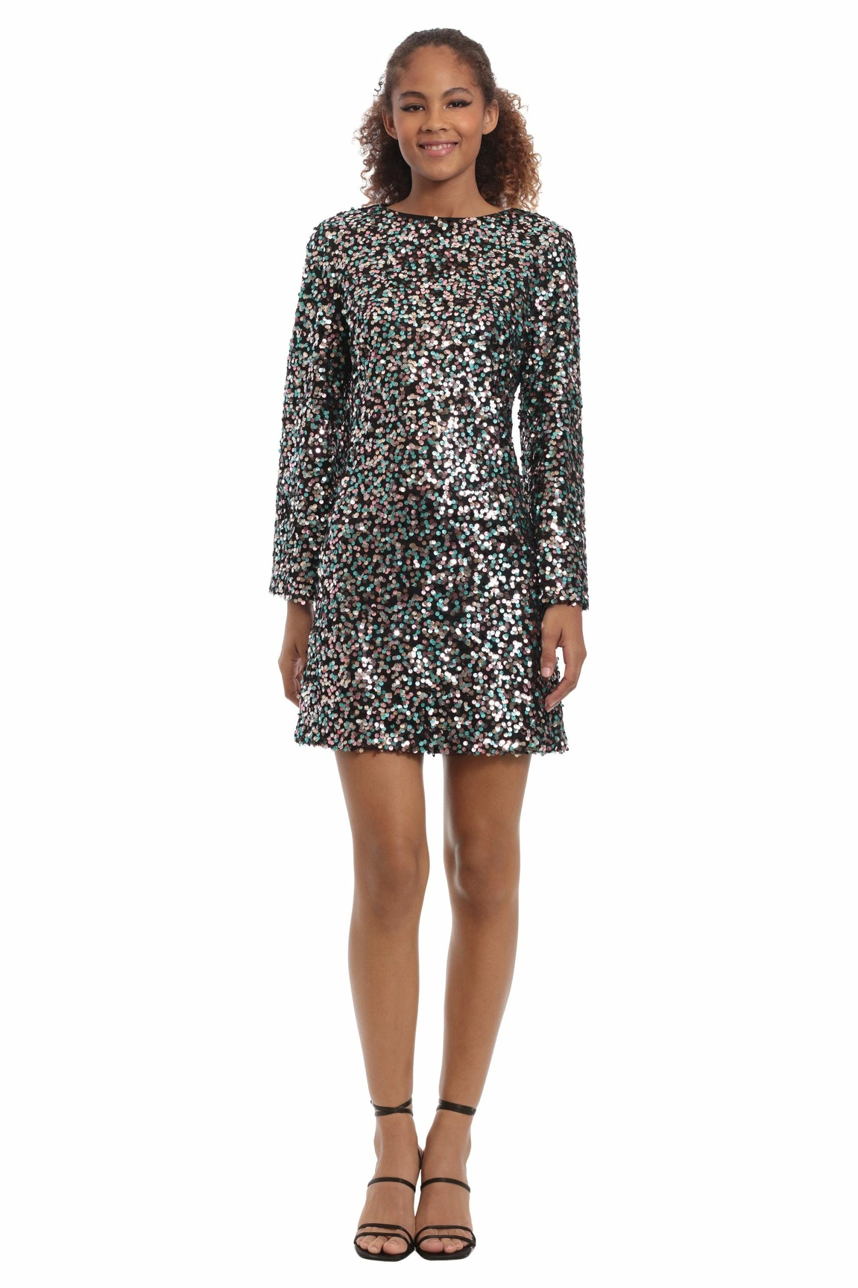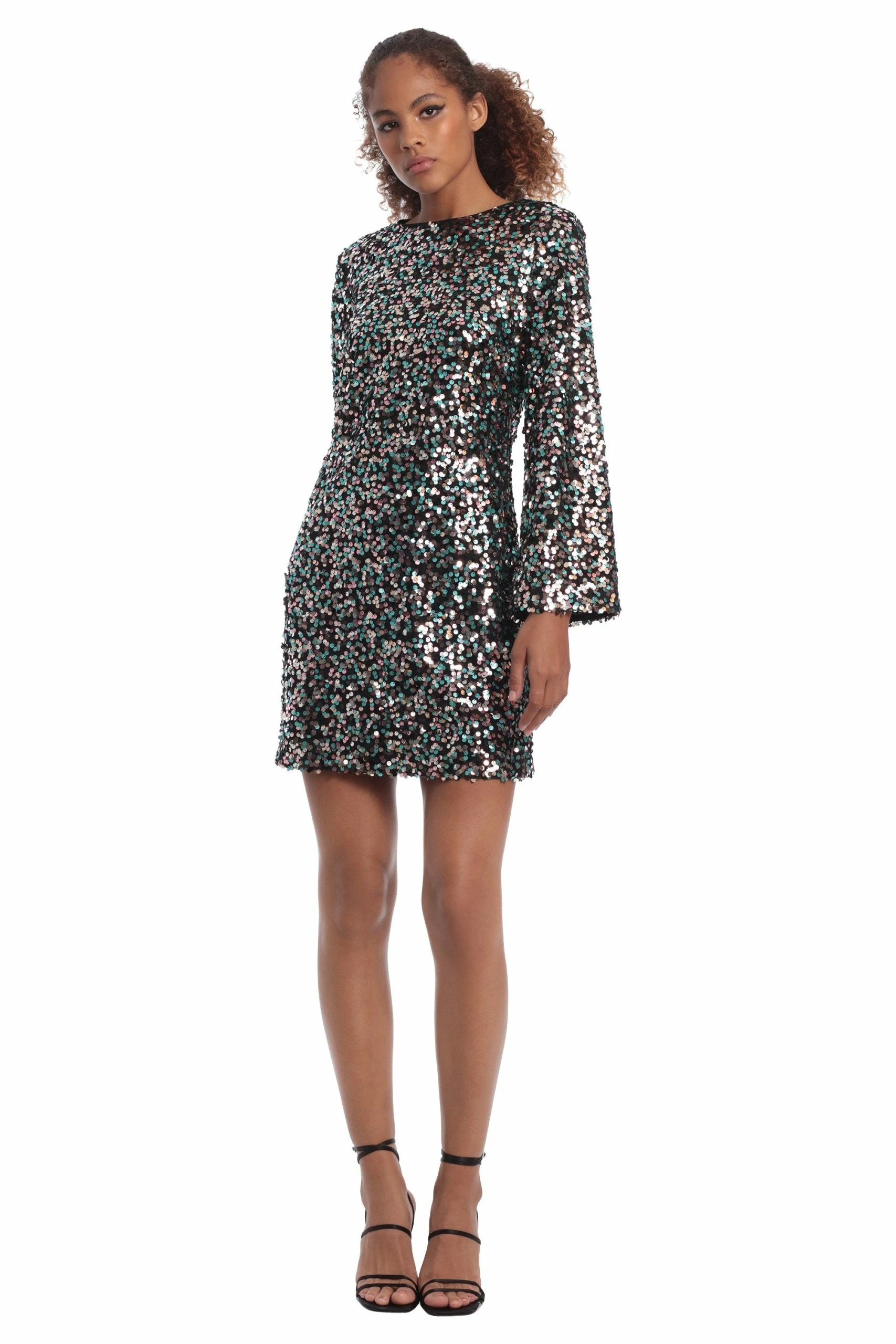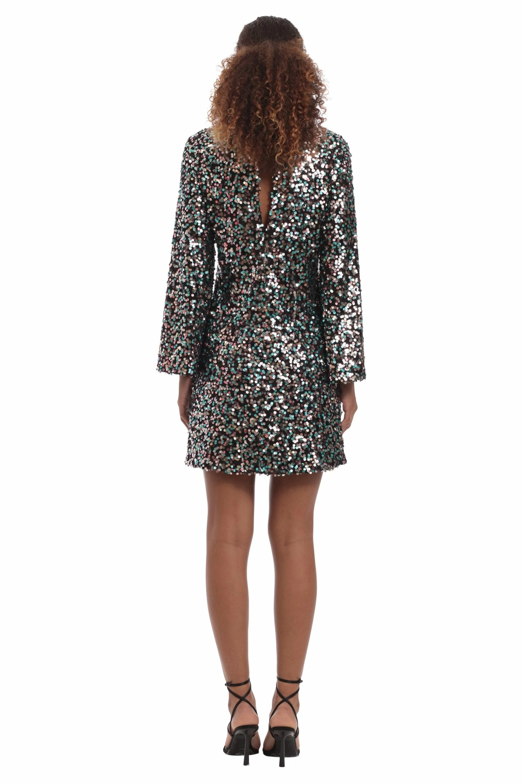 This studio 54 inspired mini is Rendelle. They love her flounced hem, large back keyhole cut out and shimmering multi colored sequins.