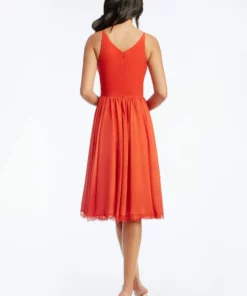 Offering textural contrast in a monochromatic palette, this versatile party dress in poppy pairs a fitted crepe bodice with a softly gathered chiffon skirt. Slender straps and a plunging neckline highlight luminous skin, while a scalloped lace hem makes a romantic finish.