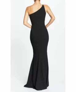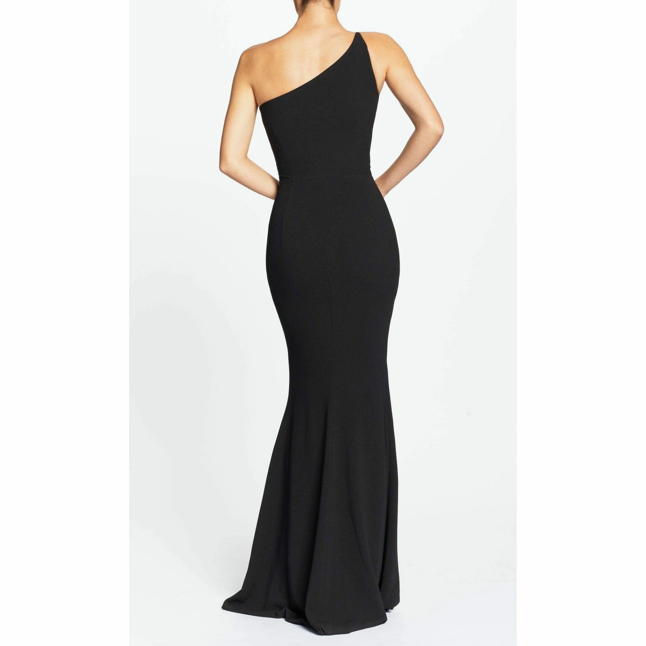 The Amy is a body-hugging floor-length gown made of classic Black crepe. This elegant gown features an asymmetrical neckline that highlights the shoulders and decolletage. The long trumpet skirt and fitted bodice, which hugs the bust, waist, and hips, helps to create a gorgeous hourglass shape. This gown is flattering and versatile for any formal event.