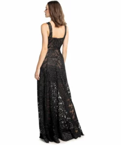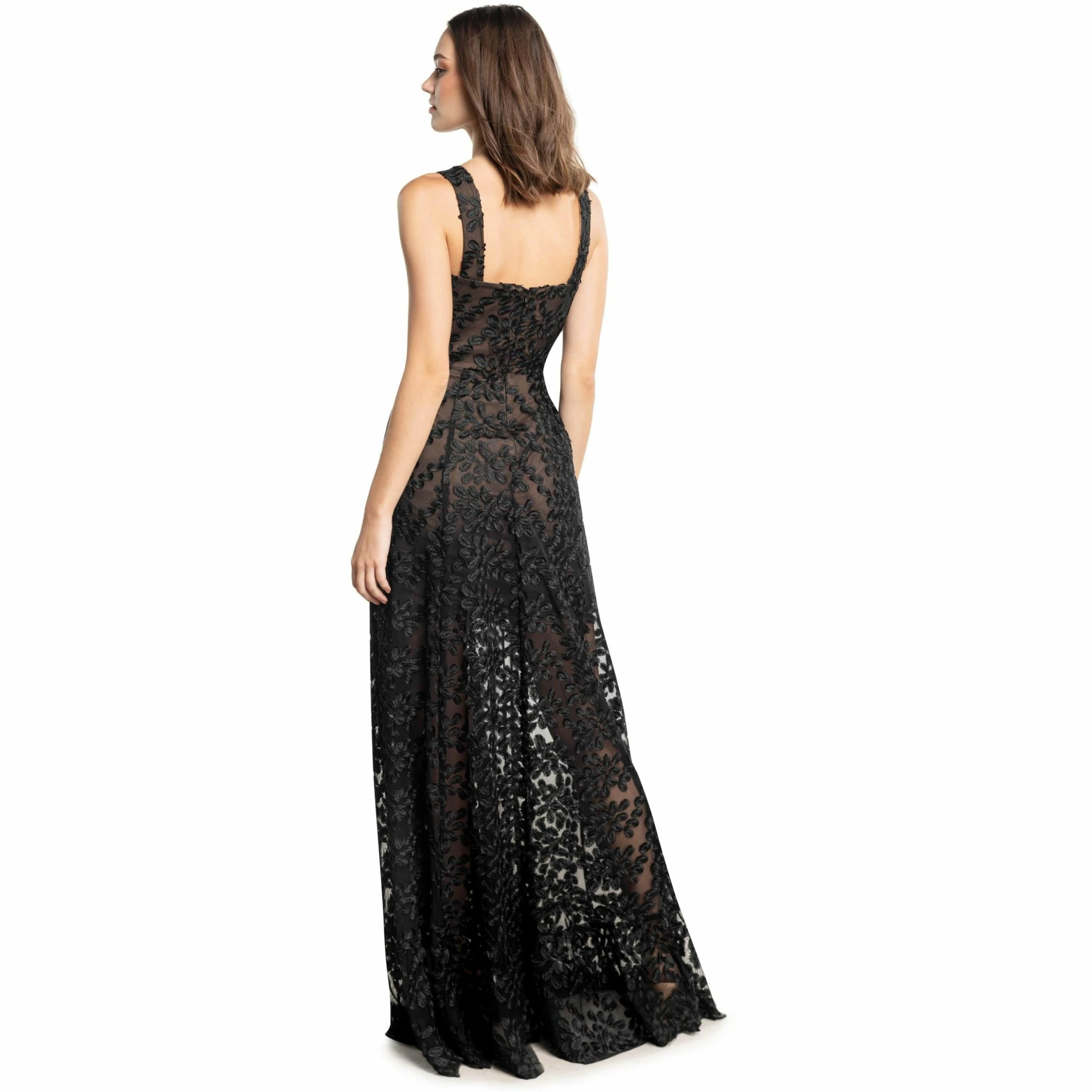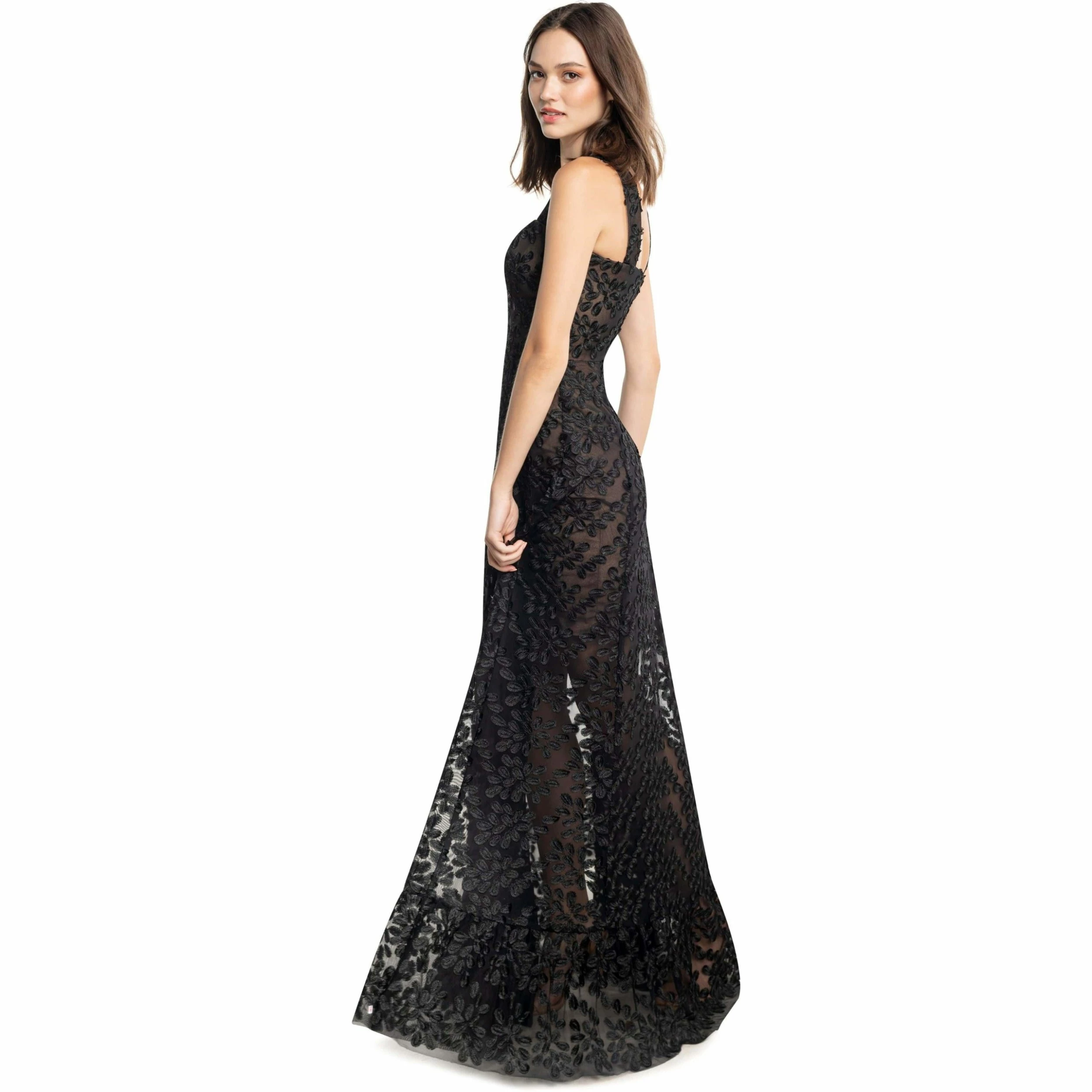 The stunning and sophisticated Anabel in black features a sweetheart neckline atop a fit and flare gown. A 3 d floral embroidery adds flare while a short-lined ruffled hem skirt dresses up this maxi-length dress.