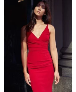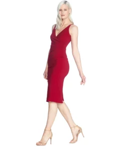 A perfect wardrobe staple, the Anita dress is a flattering style with a timeless silhouette. This sleeveless sheath design reveals just the right amount of skin with a deep v-neckline and low v-back. A faux wrap bodice with a ruched side has a slimming effect and elongates the body. The fitted knee-length pencil skirt makes this Garnet red crepe dress as versatile as it is irresistible.