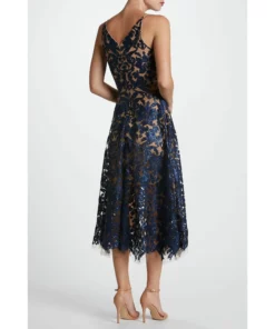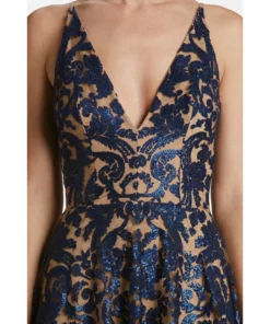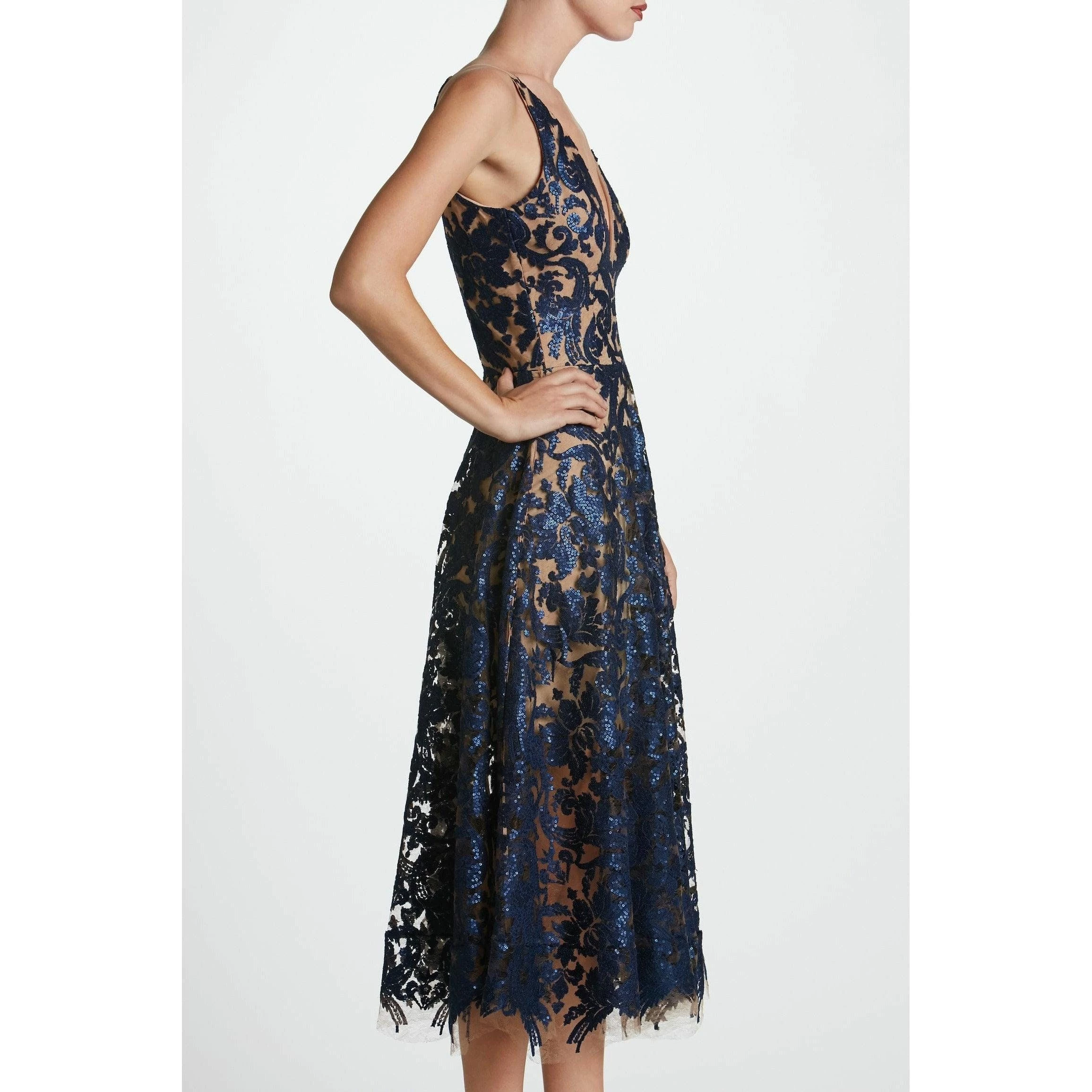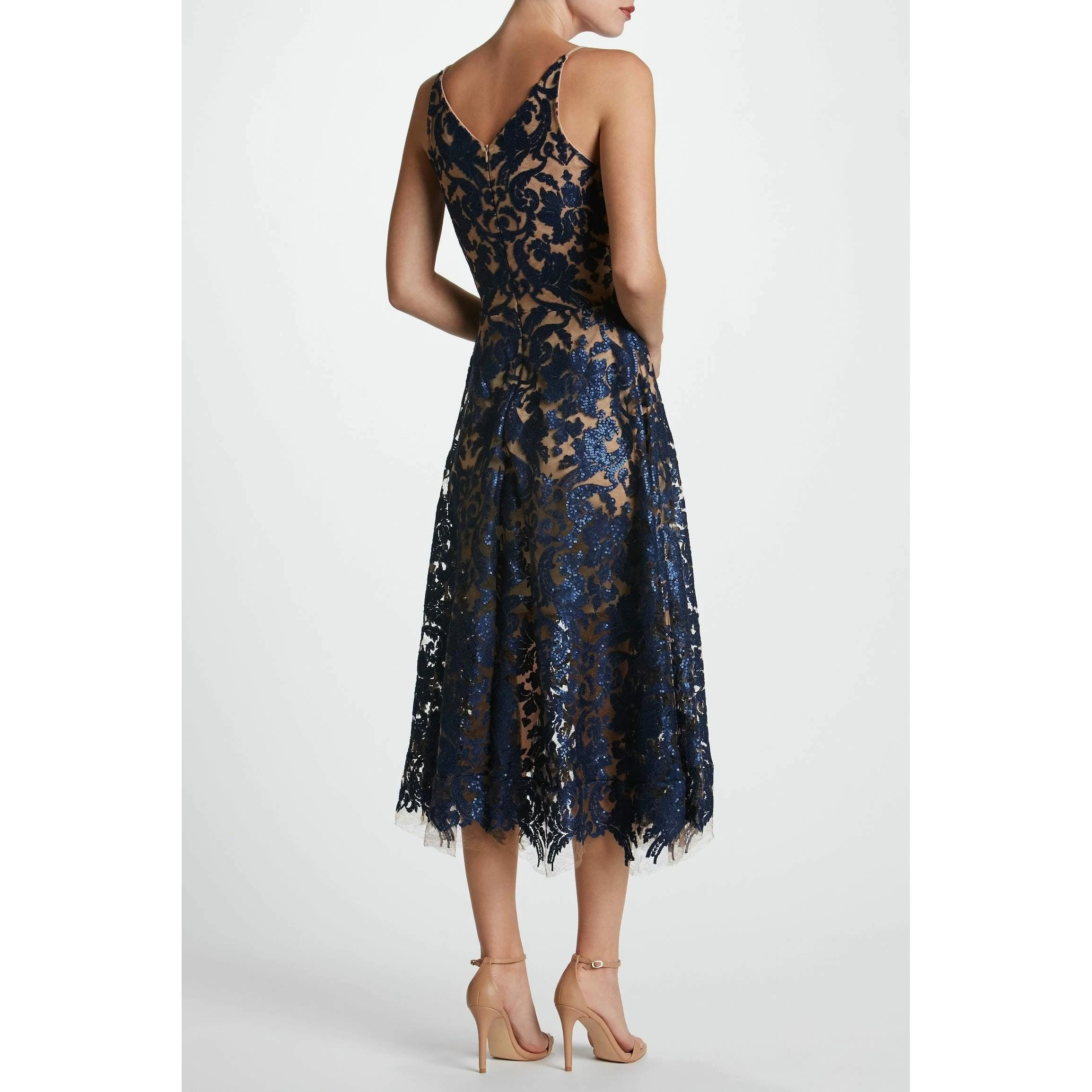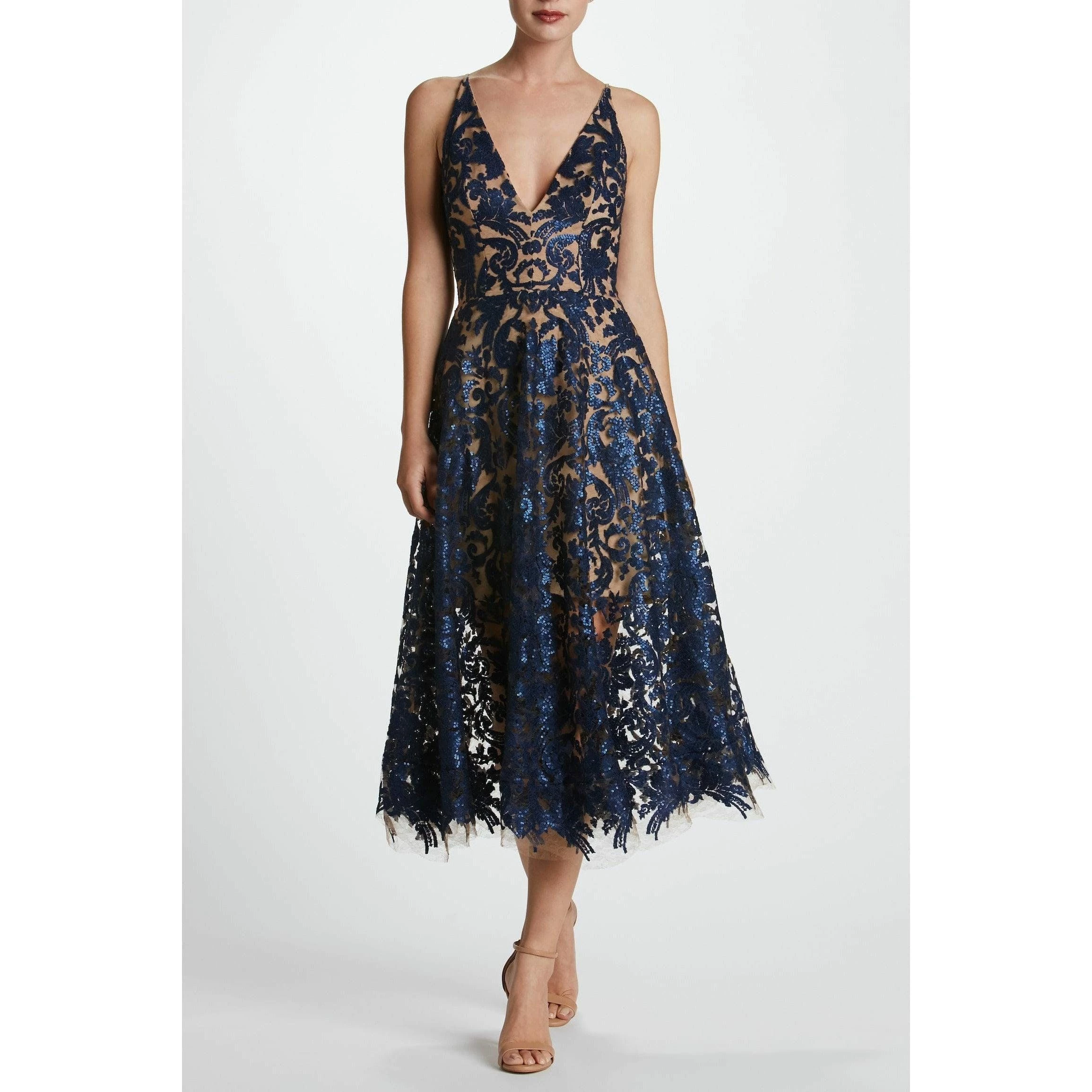 Chic and feminine. The navy floral lace overlay rests on embroidered, beige, mesh lace detailing. Tiny sequins add a subtle glimmer to the flattering classic silhouette. Delicate straps and a plunging neckline in the front are complemented by a curved v-neckline in the back, giving this sleeveless dress a flirty but sophisticated edge.
