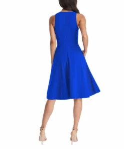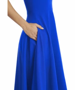 The catalina is a crepe cocktail dress with a fit and flare silhouette and a v-neckline that flatters all body shapes. The bodice is fitted and tapers in to hug the waist, and the knee-length skirt is playful but polished. This electric blue sleeveless dress has modest straps wide enough to cover the shoulders and two side pockets.