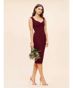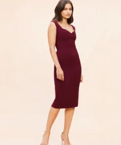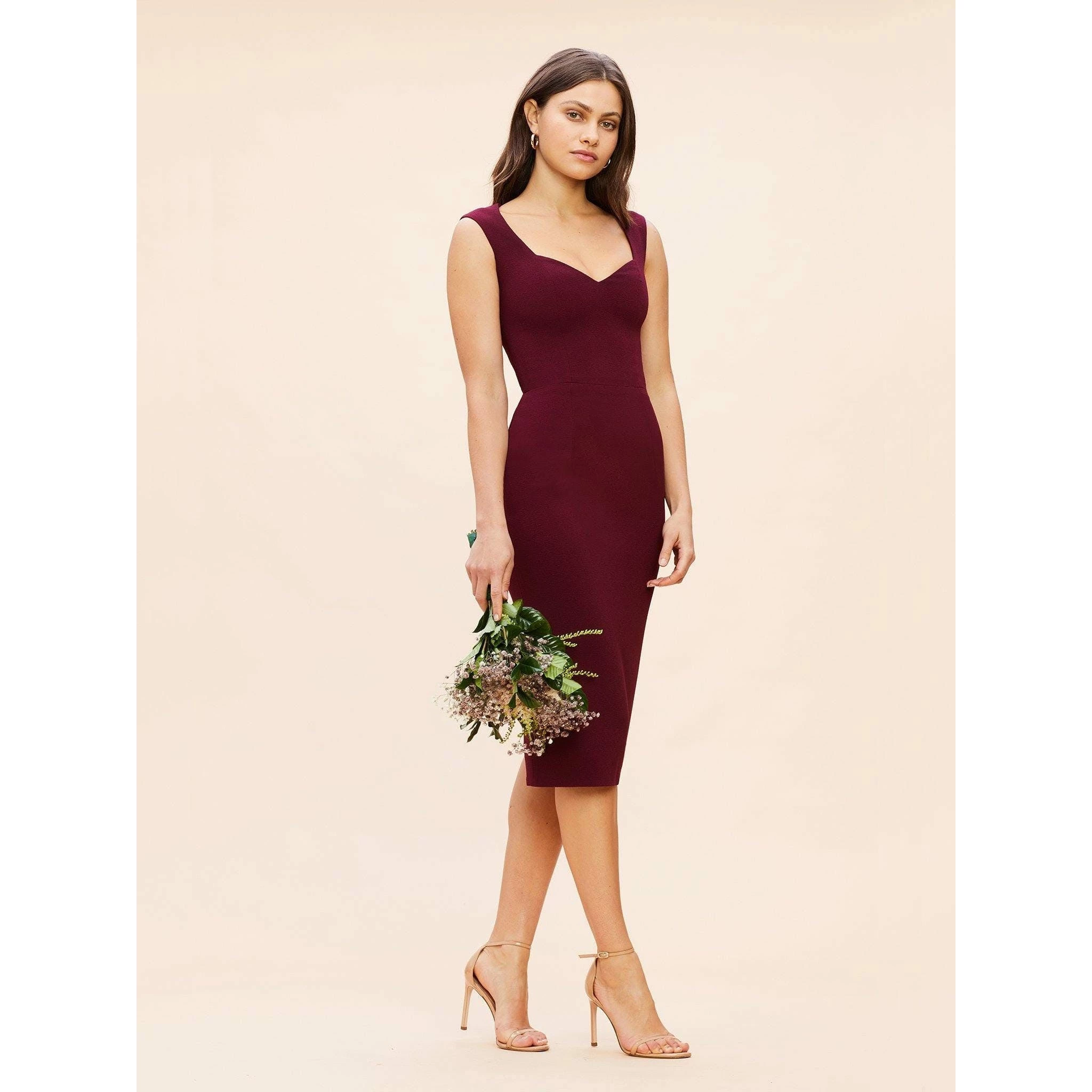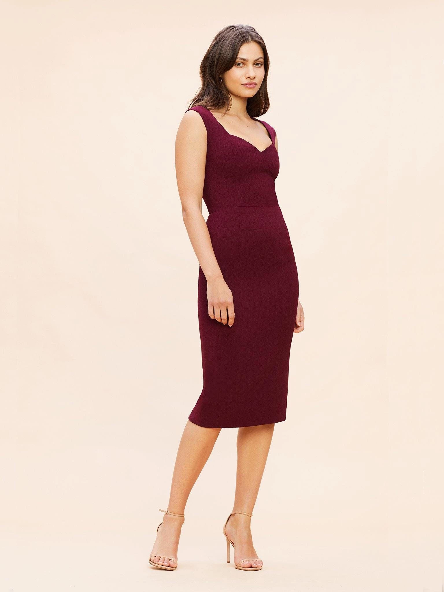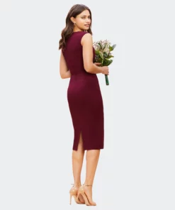 Chic is an understatement when it comes to the Elle dress. A modernized Queen Anne neckline sets the tone on this sleek and sophisticated sheath that hits just past the knee. She is designed with a form flattering finish in Burgundy and a modestly elegant tone.