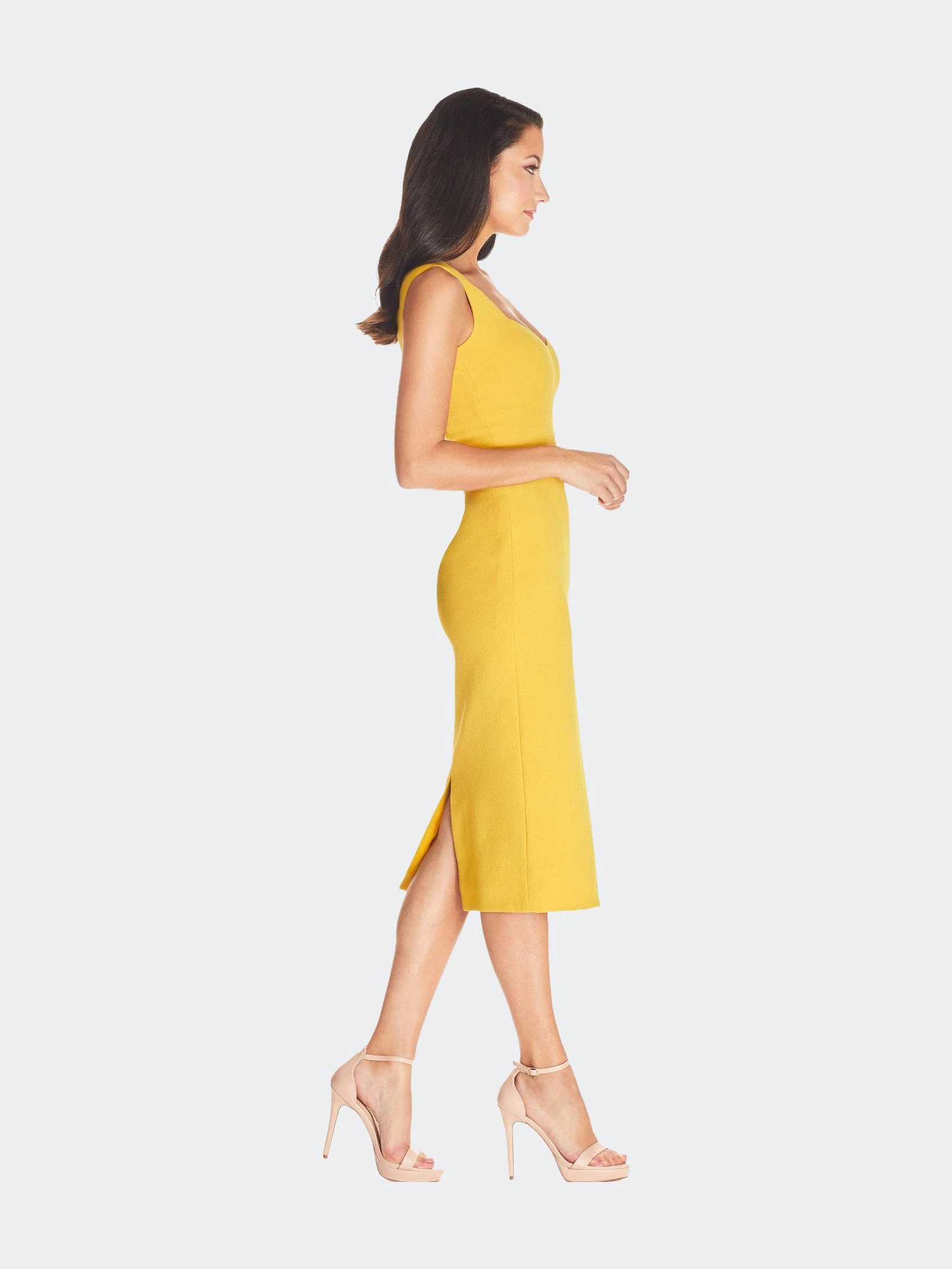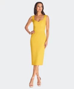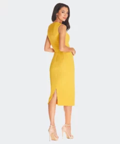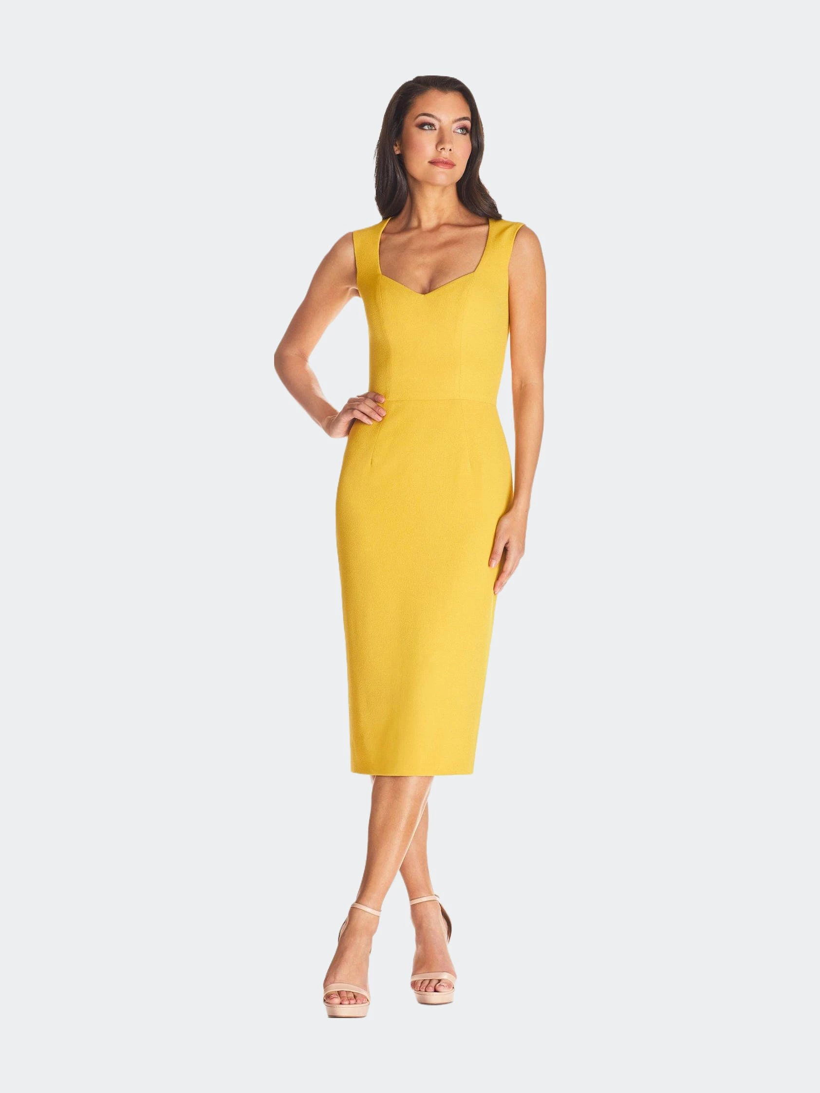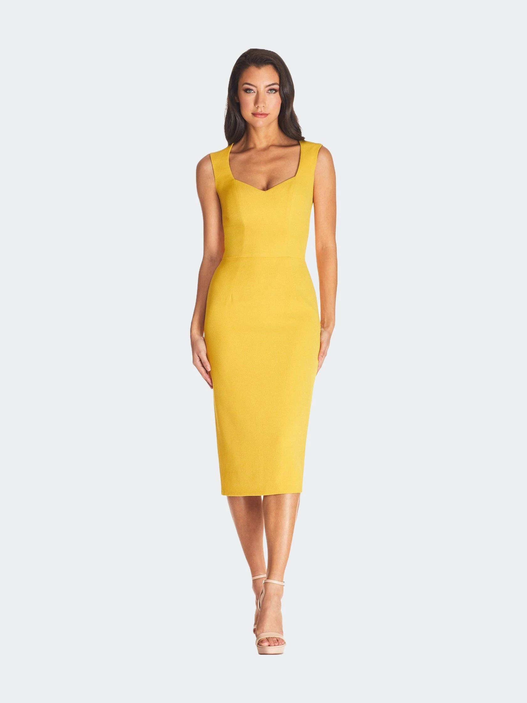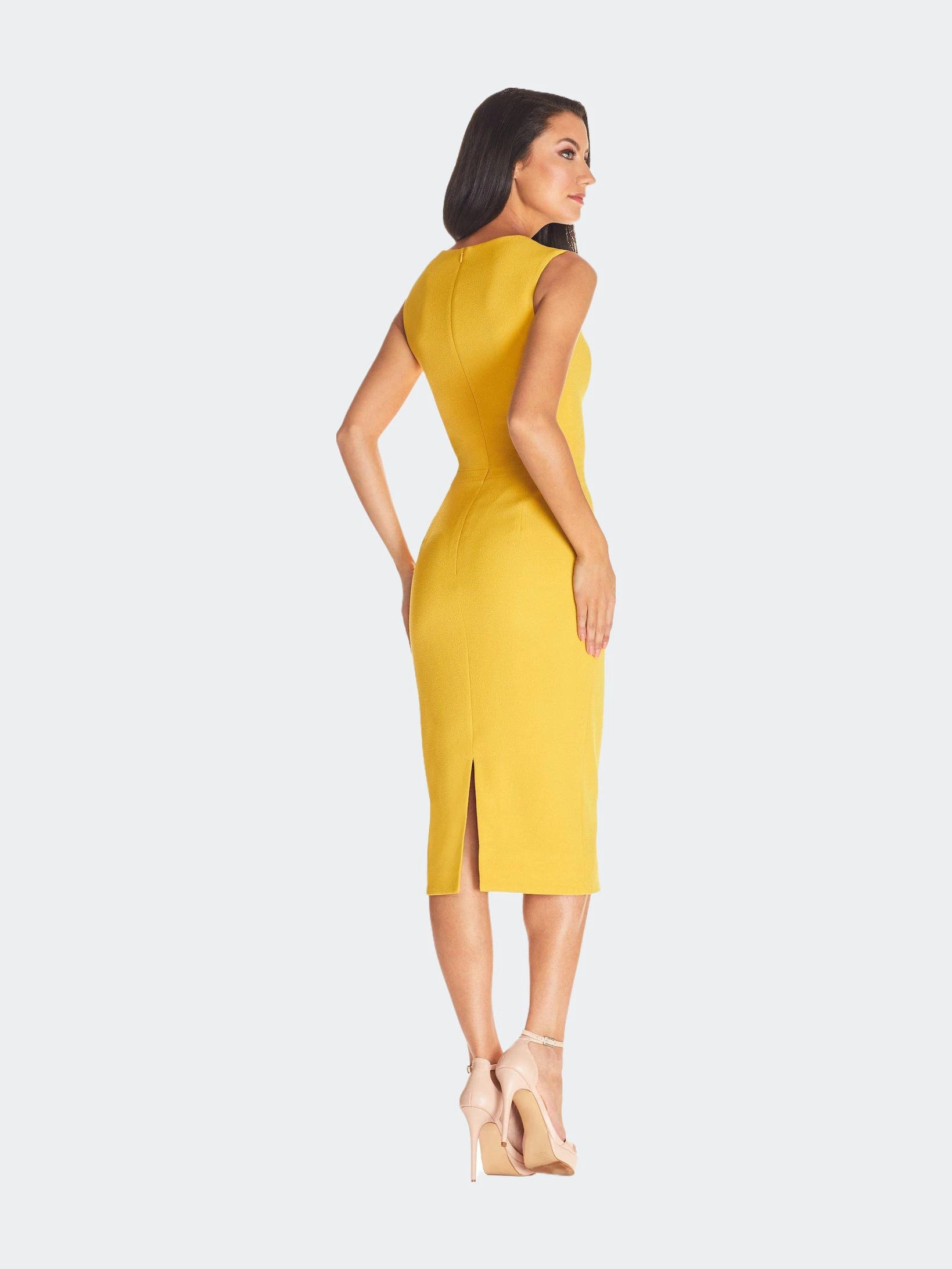Chic is an understatement when it comes to the Elle dress. A modernized Queen Anne neckline sets the tone on this sleek and sophisticated sheath that hits just past the knee. She is designed with a form flattering finish in Marigold and a modestly elegant tone.