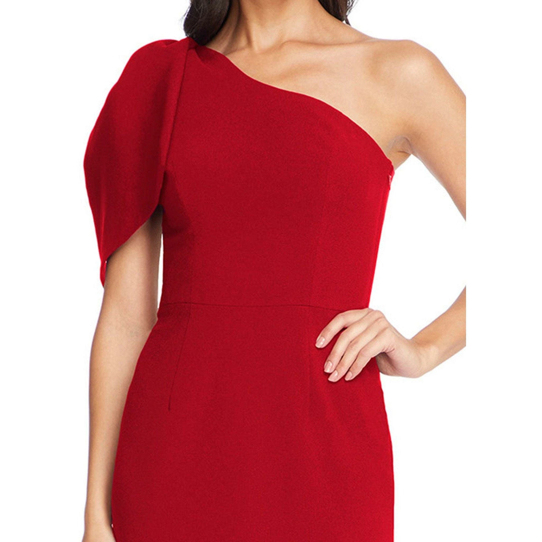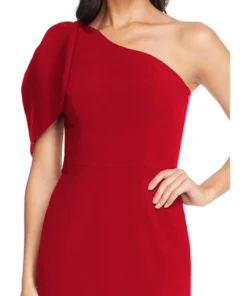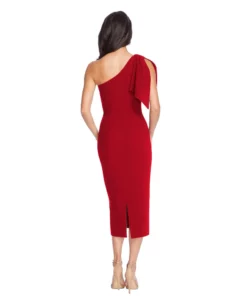 The Tiffany is an elegant asymmetrical dress made in our stretch crepe material in Garnet. A large bow drapes over the single shoulder strap. The form-fitting silhouette has a straight, midi-length skirt that tapers in at the waist completed with a back slit.An elegant one-shoulder neckline and figure-hugging silhouette style a sophisticated midi dress with two panels that cascade over the single shoulder.