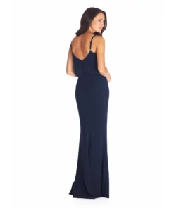 A touch of sophistication, and a touch of sexy our Gracelyn dress in Midnight Blue has it all. She features both graceful drape, a high waist silhouette, and finishes with an always alluring thigh-high slit in the gently flared floor sweeping skirt.
