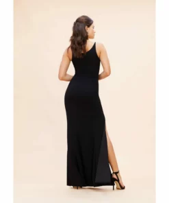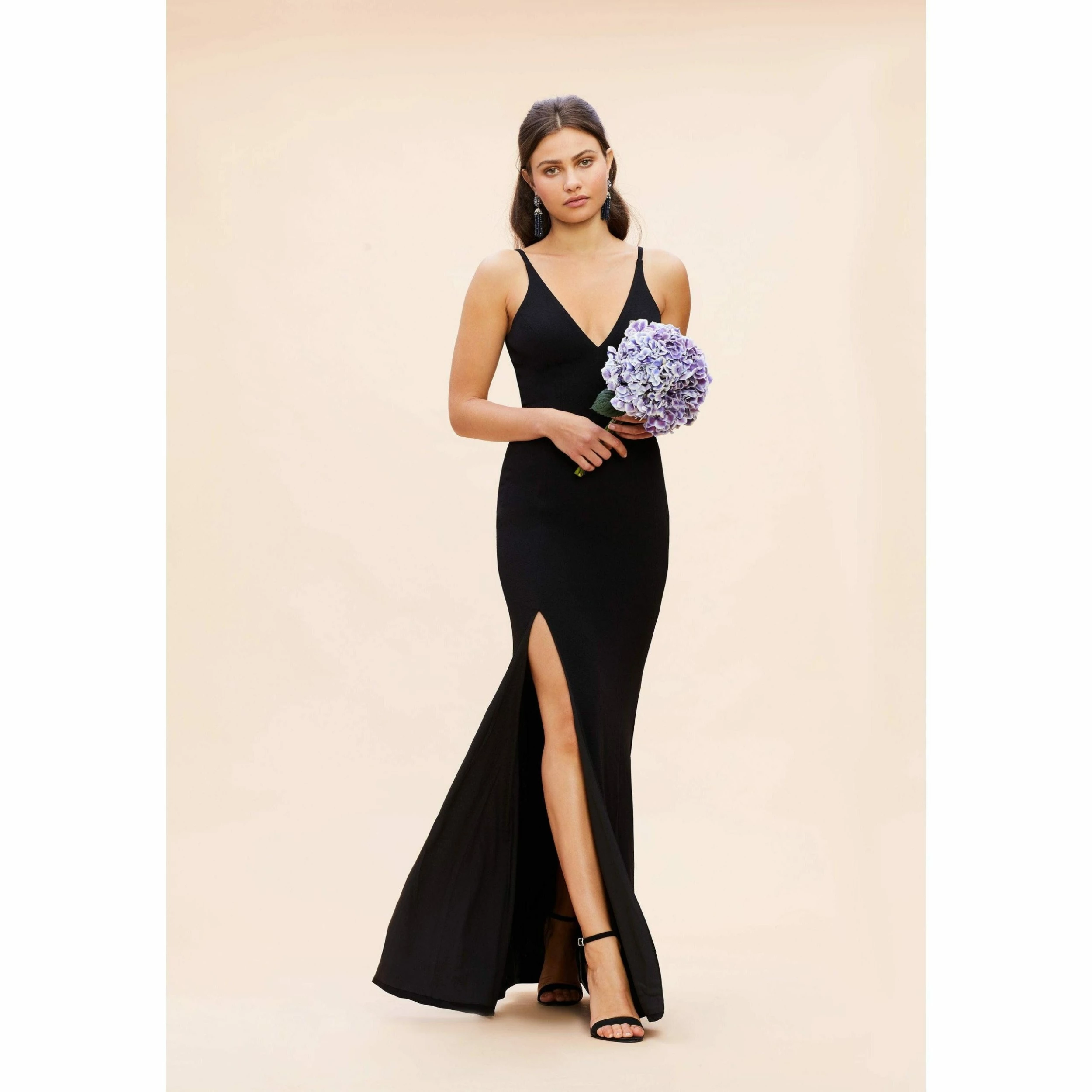The Iris crepe gown is a body-hugging, floor-length dress with a thigh-high side slit. This sleeveless black gown features thin shoulder straps to highlight a plunging neckline and a deep v-back. The slim gown fits snuggly through the bodice and hips.