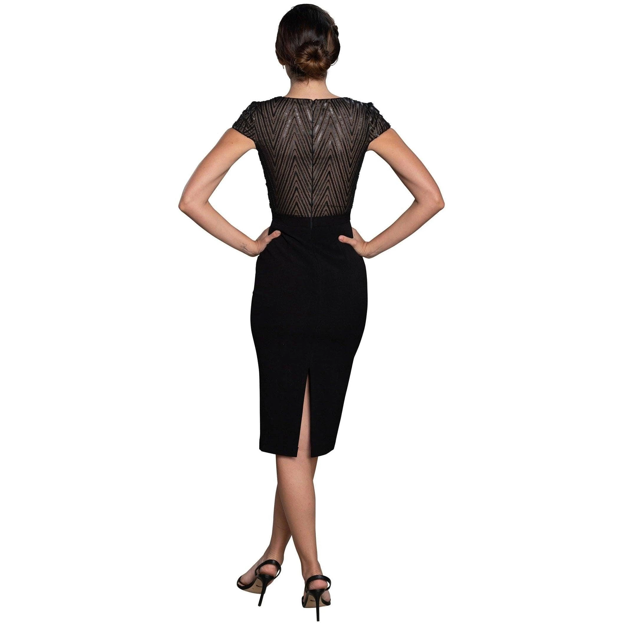 Cap Sleeve mix media deep v neck bodycon midi dress. With a beaded top bodice and a crepe skirt.