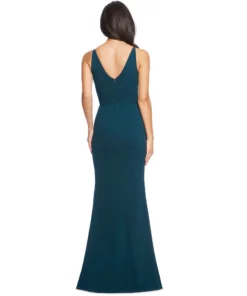 Figure-flattering ruching adds rich texture through the waist and hips on this chic and alluring gown in Pine styled with low-cut necklines and a high-cut slit.