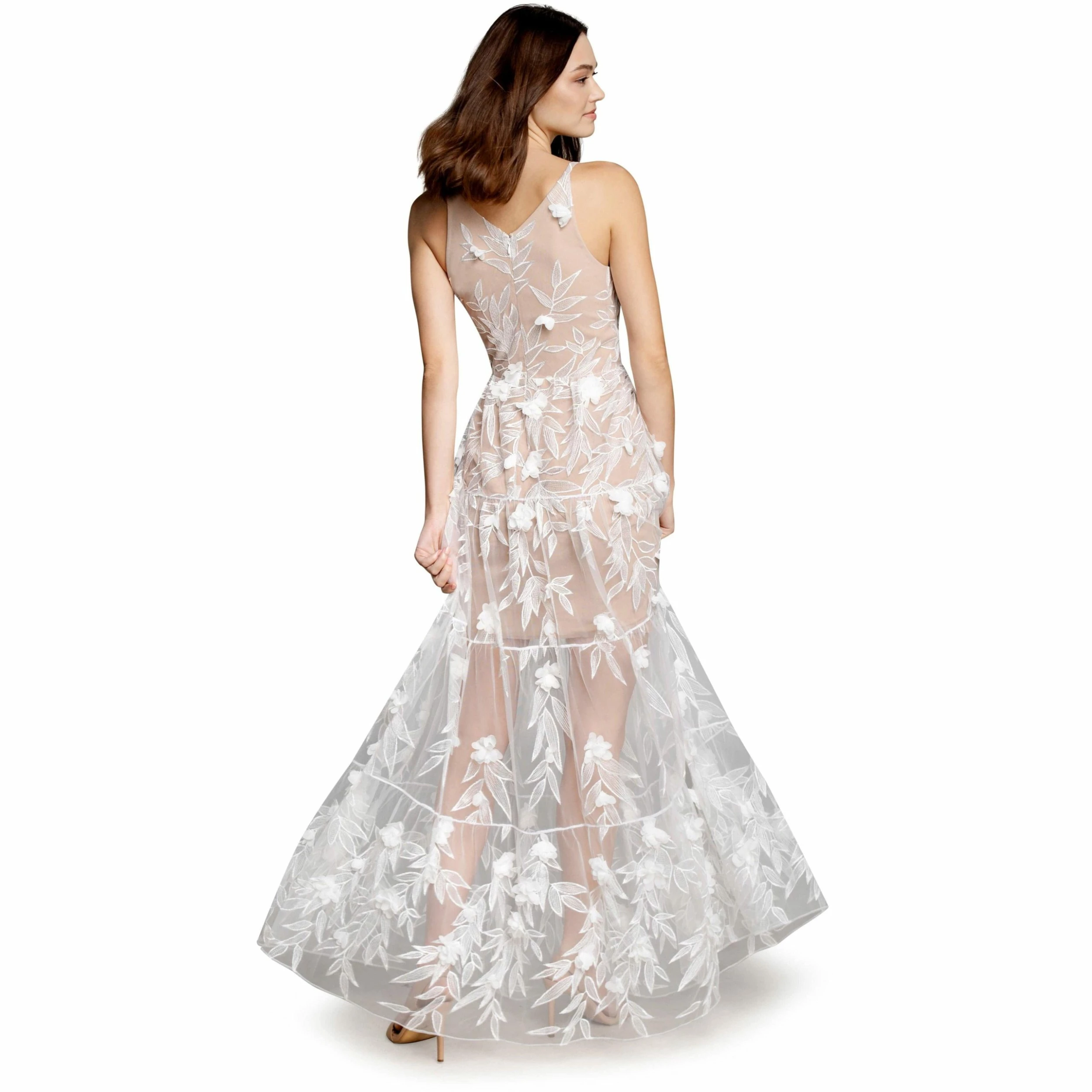 3D floral sleeveless plunge neckline tiered skirt fit and flare maxi dress.