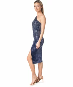 The Palmer in Navy pairs stunning sequins with an ombre effect. A one-shoulder asymmetrical neckline adds coverage to balance the front slit in the midi-length skirt. Featuring a fully lined bodice with a side zipper.