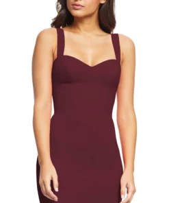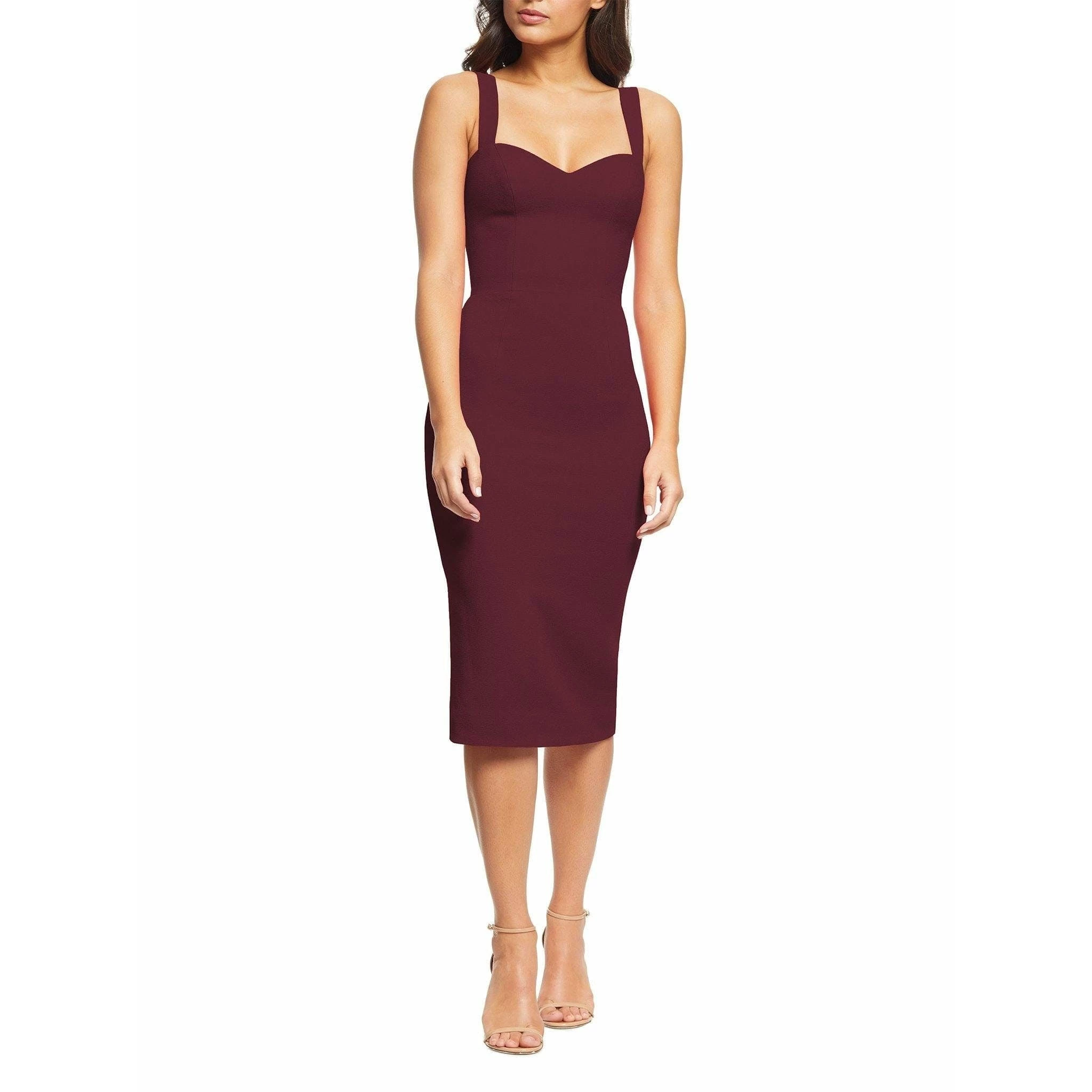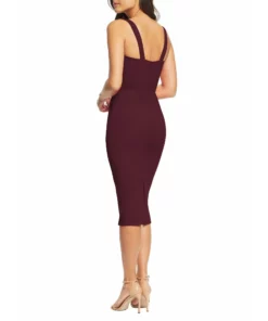 The nicole sheath cocktail dress stuns every time. This fitted sleeveless dress has a modern silhouette that features a sweetheart neckline, square back, and a slit in the back of the cocktail-length skirt. It’s made of flattering crepe fabric with little to no stretch in Burgundy.