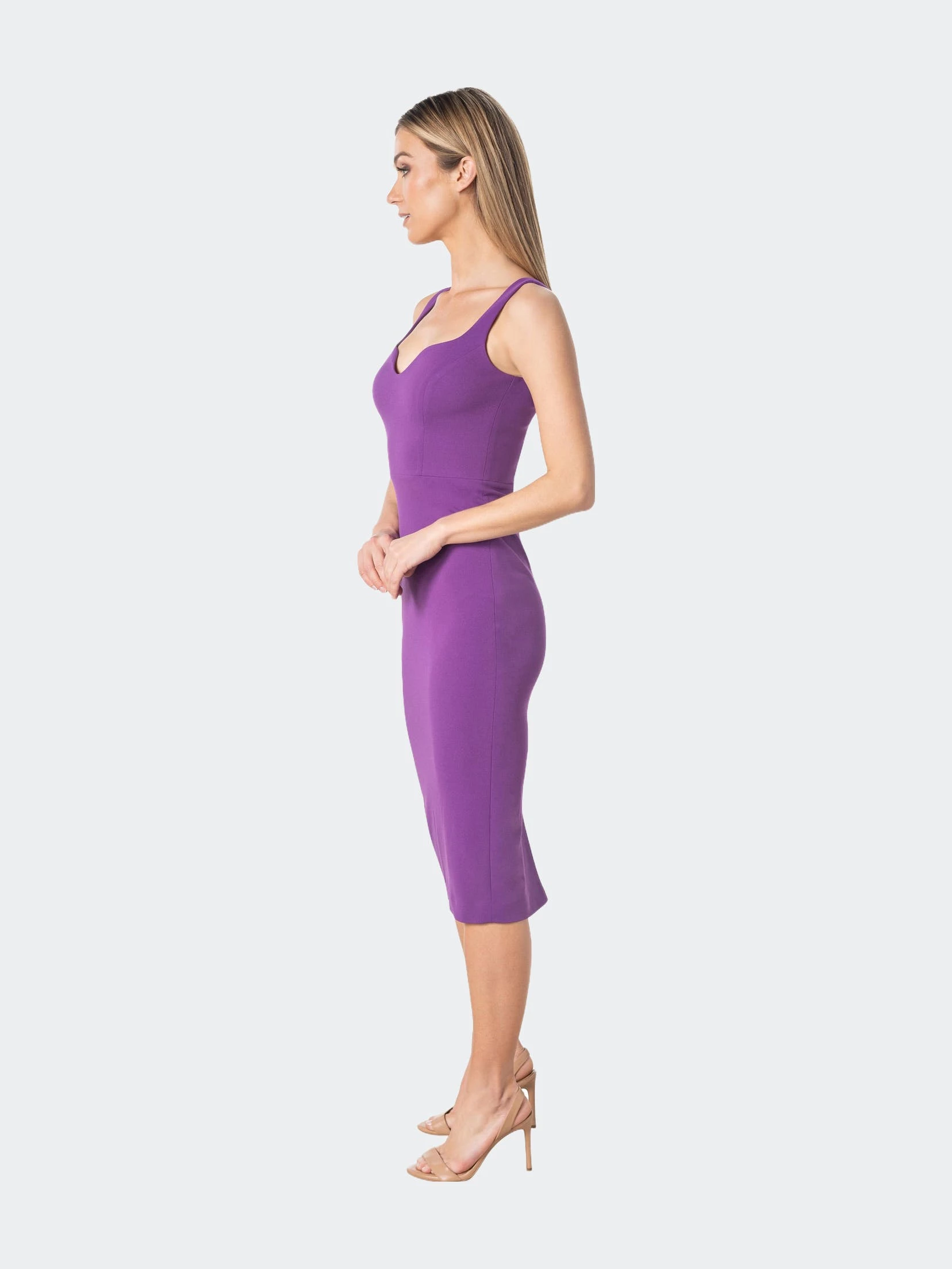 You’ll be sure to impress in this sleek bodycon midi dress, featuring a unique sweetheart neckline and back slit.