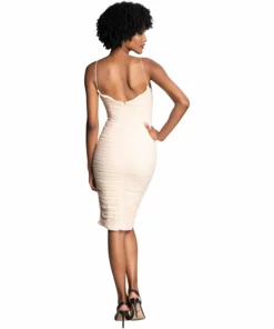 – Form-fitting- Knee-length- Sleeveless- Ruched accents