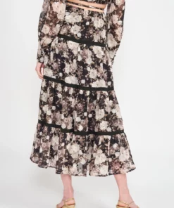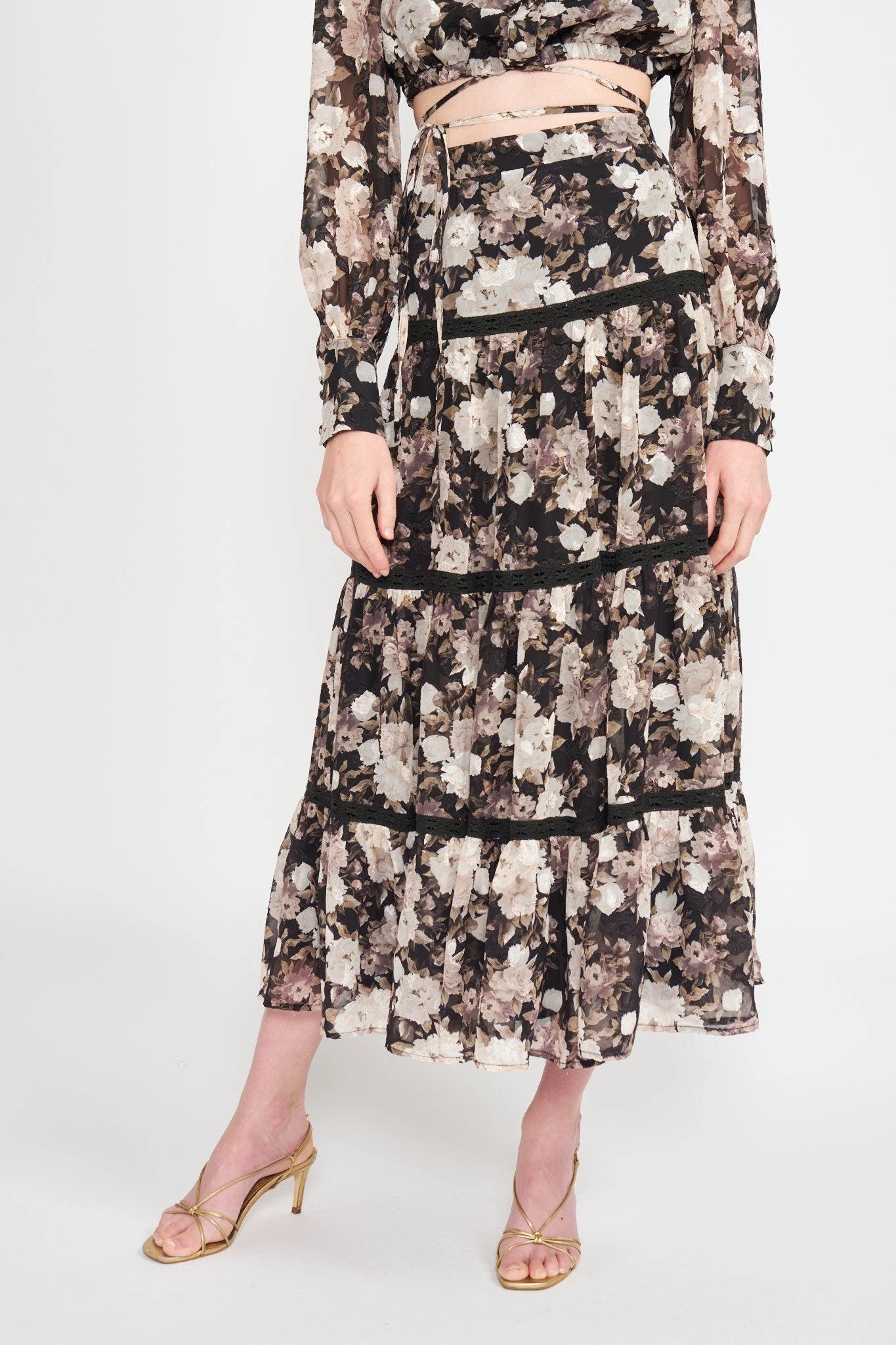 – Printed tiered midi skirt- Matching set with rena blouse- Model is 5’9 and wears size small