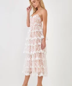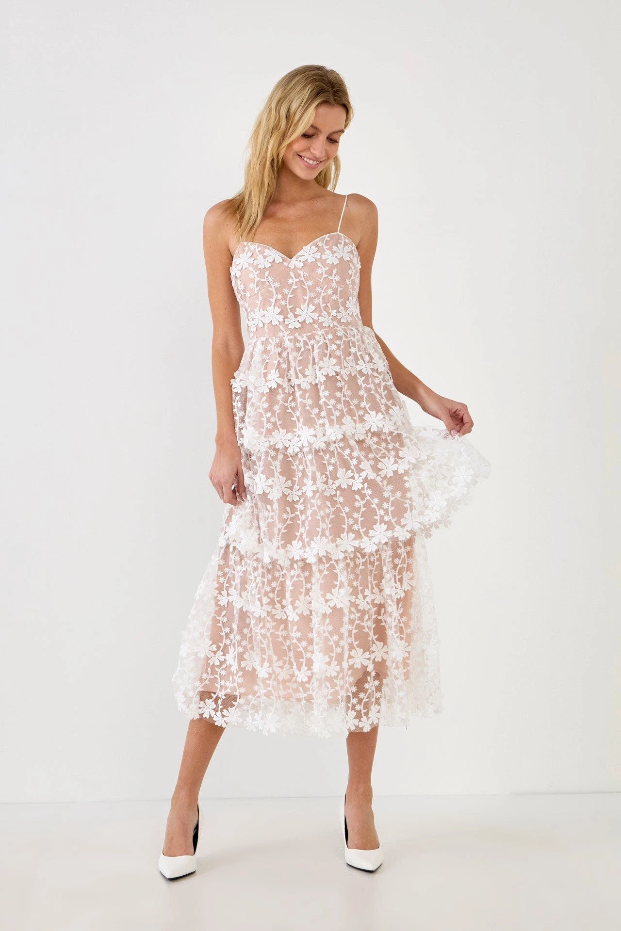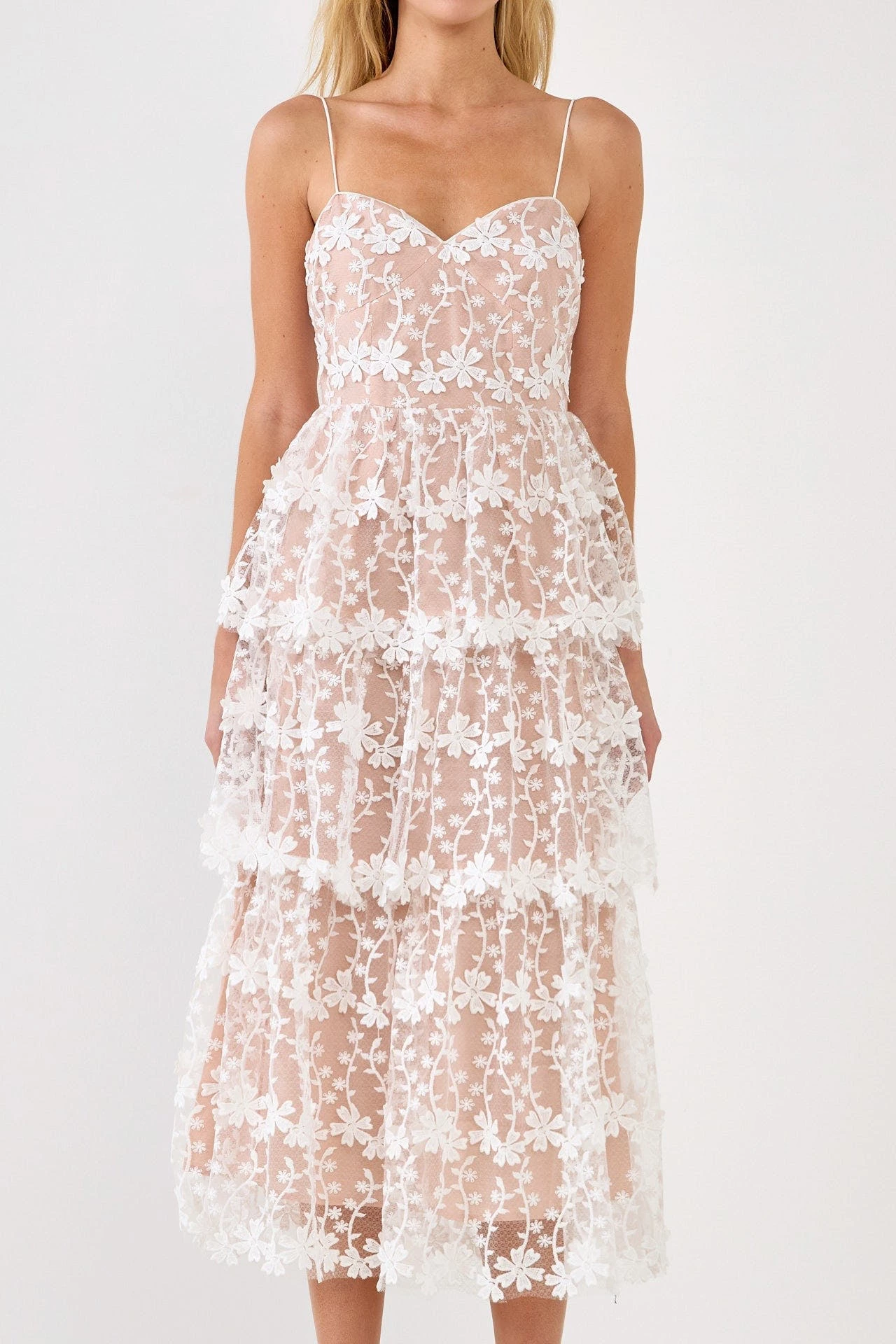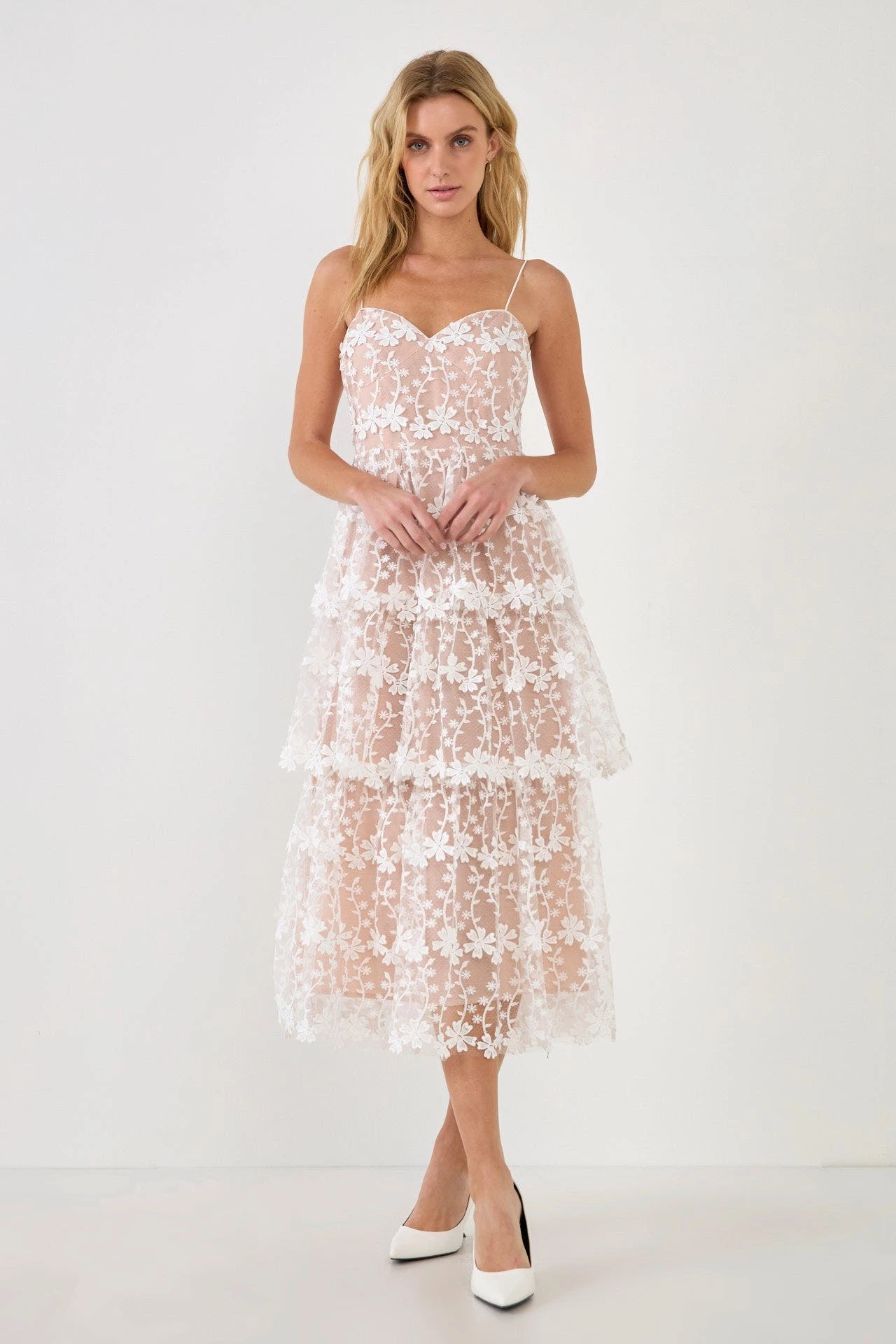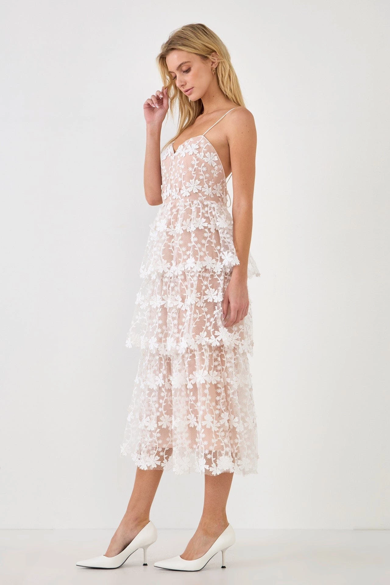 Add a touch of sweetness to your style with this crochet midi dress. This delicate dress features sheer lace fabric with a matching lining. The thin spaghetti straps and back tie detail add a touch of elegance, while the tiered skirt gives it a playful touch. Perfect for any special occasion, this pretty crochet midi dress is sure to turn heads.