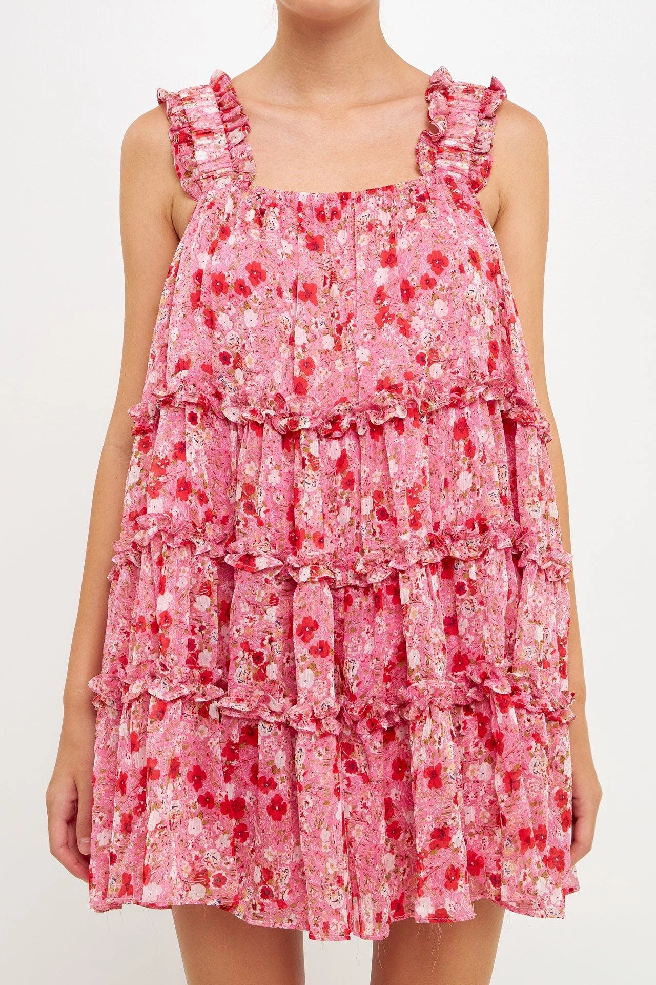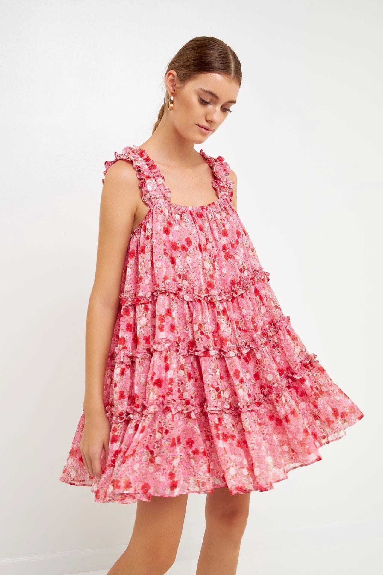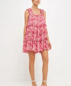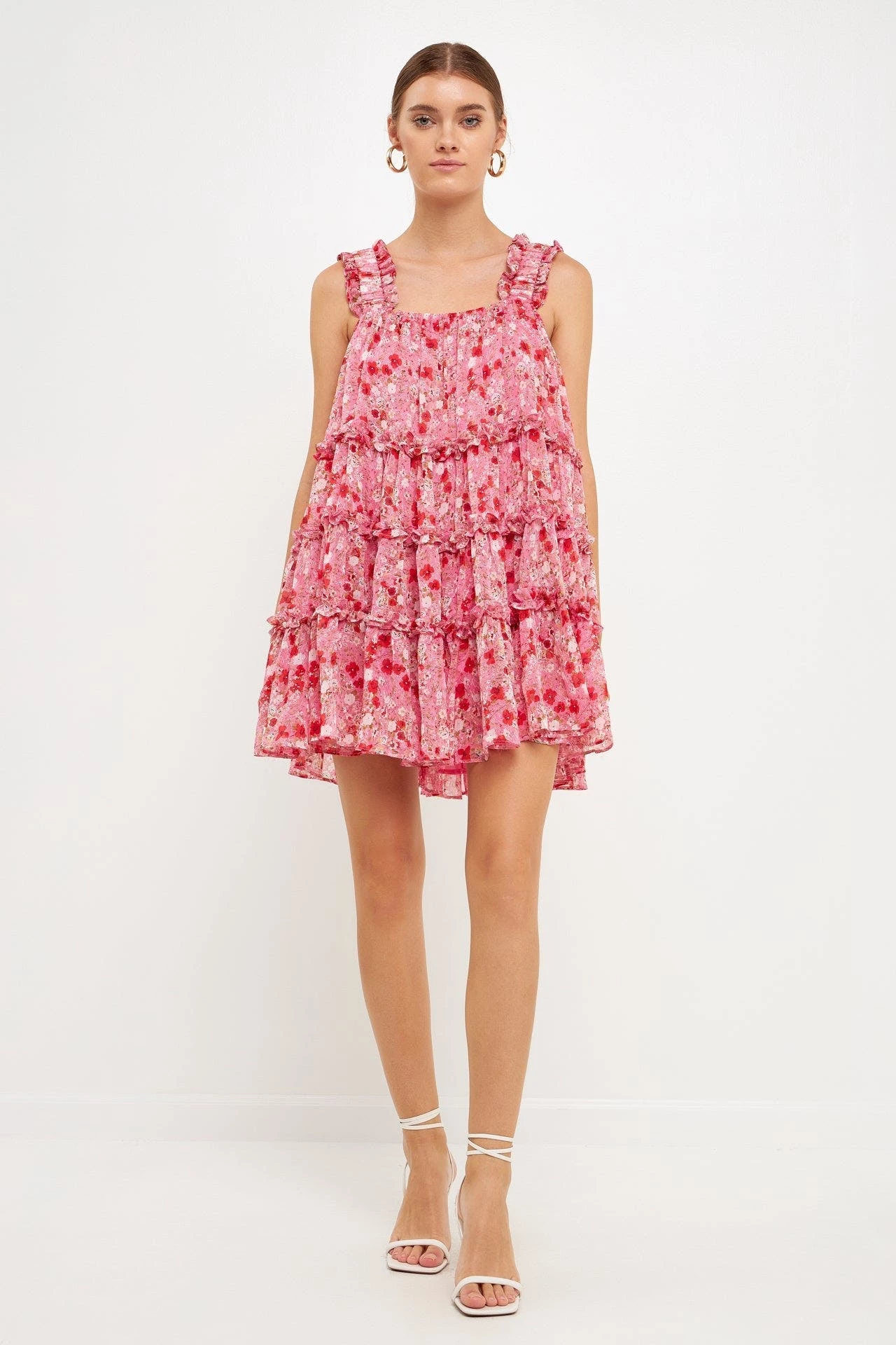 Made from lightweight chiffon fabric this mini dress features an intricate floral pattern and has ruffle trim throughout. This dress is also fully lined for optimal comfort.