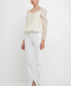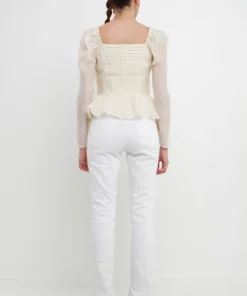 This top is the perfect way to add some elegance to your wardrobe. The pleated fabric peplum hem and button accents on the sleeves create a timeless and graceful piece. Pair with your favorite trousers for work or a mini skirt for a night out.Long sheer sleeves with elastic at shoulders.