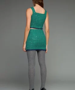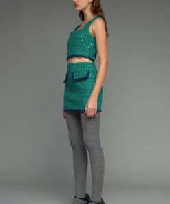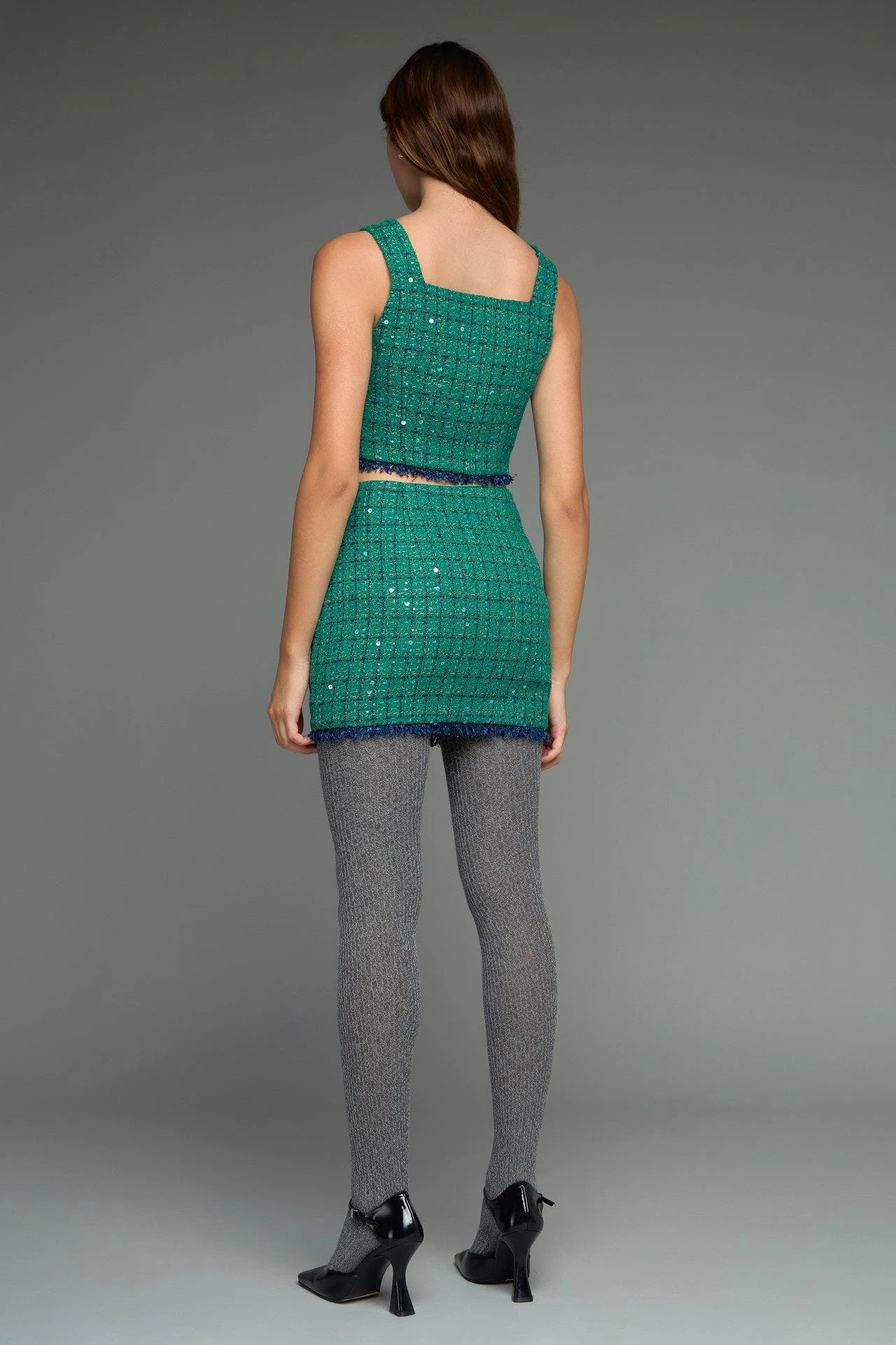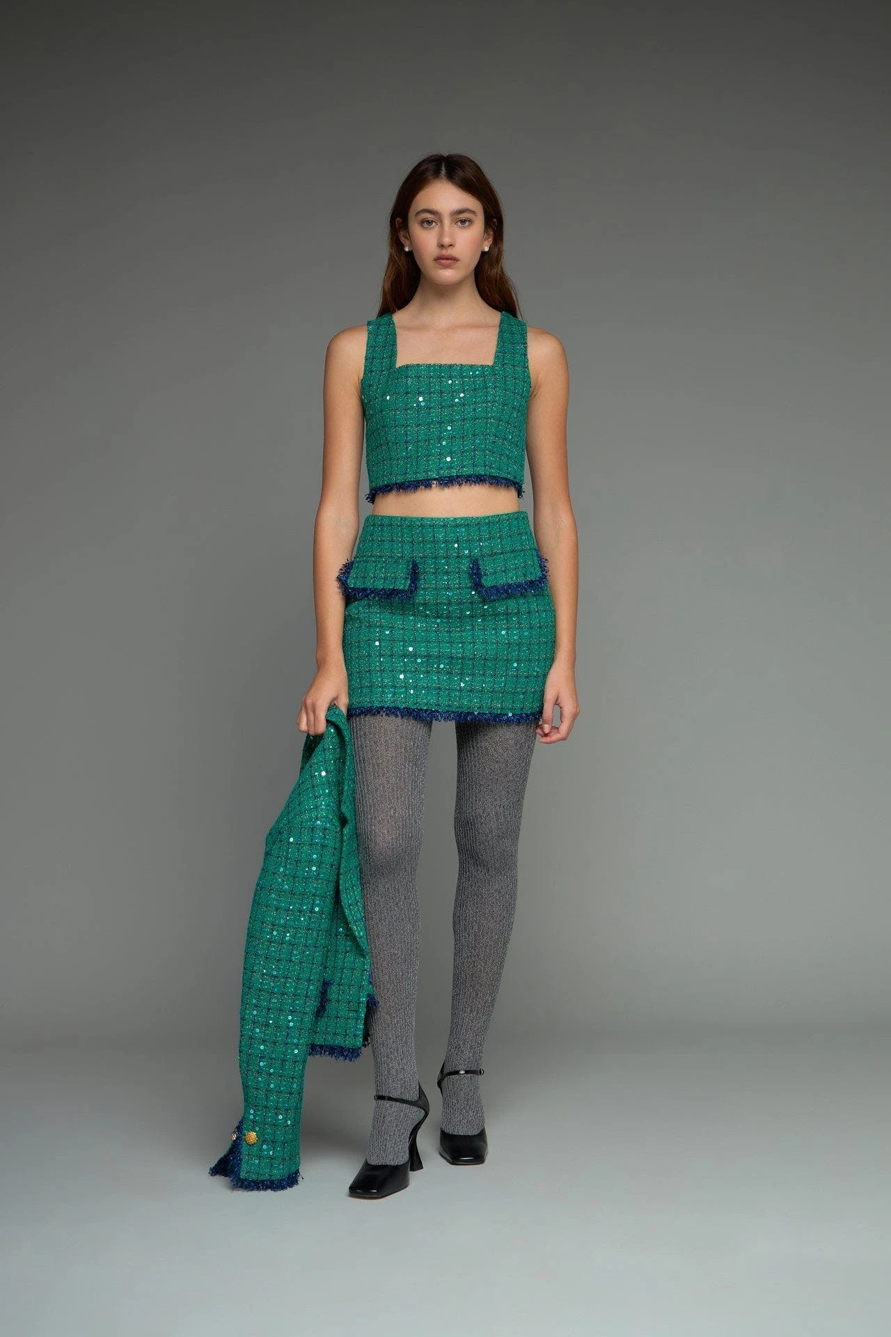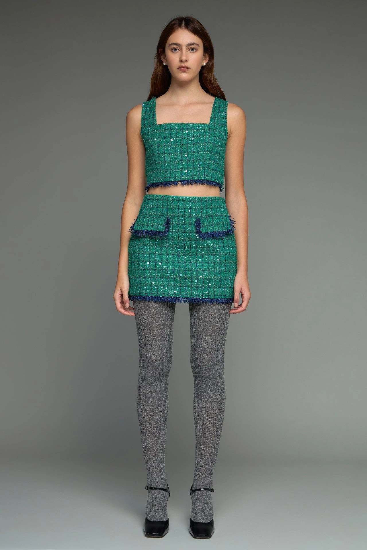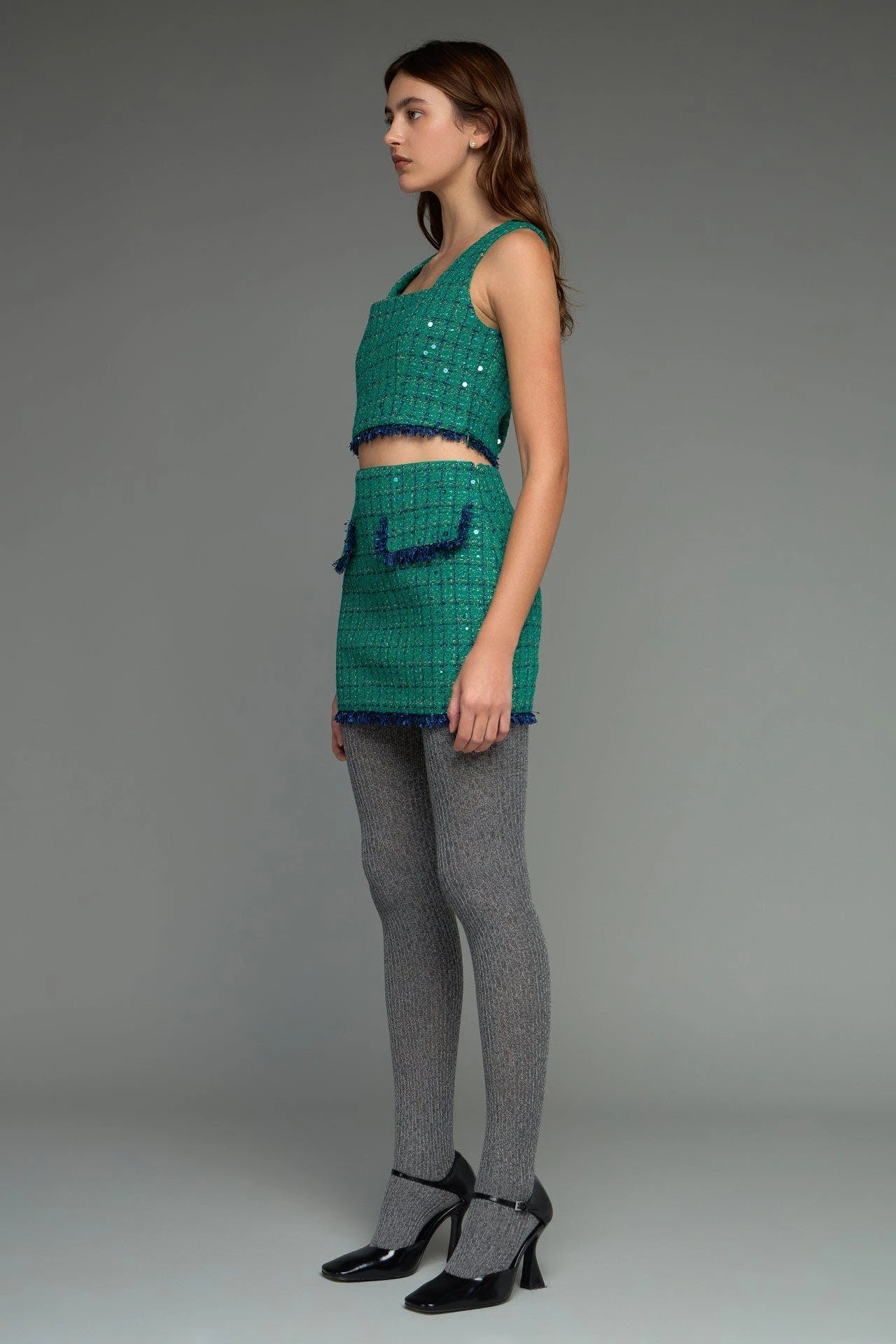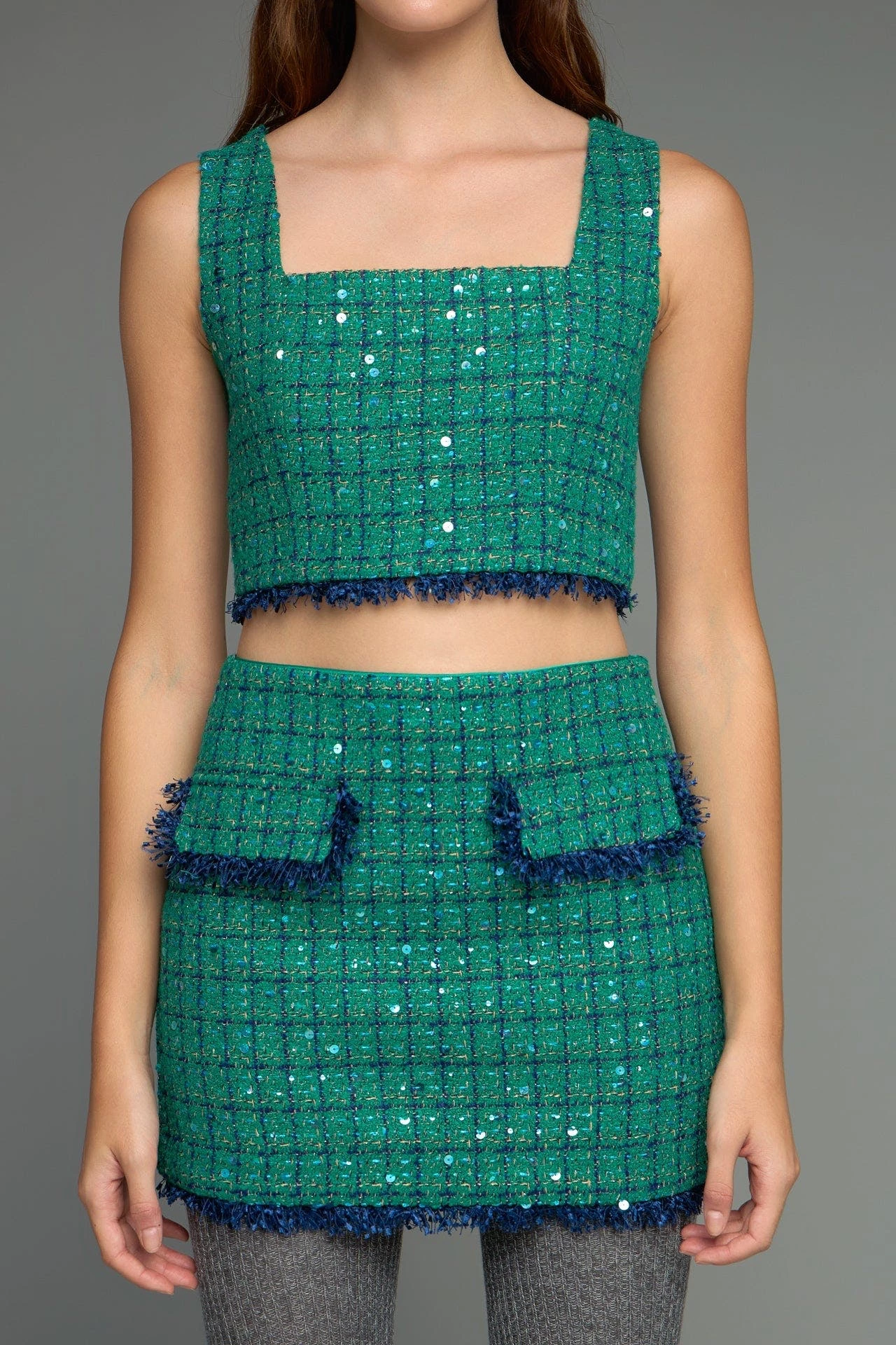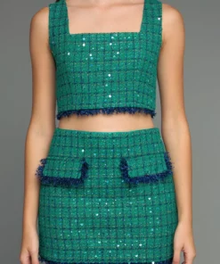 This cropped tweed top is sassy, yet sophisticated. It features sequin tweed and beautiful fringe trim that make it one-of-a-kind. In addition, the square neckline offers a classic and flattering silhouette while the lining ensures optimal comfort.