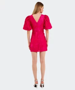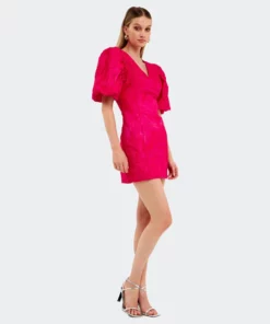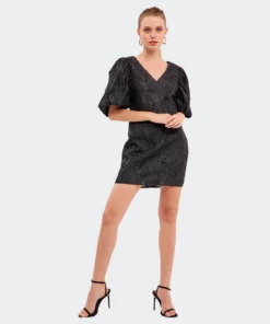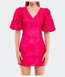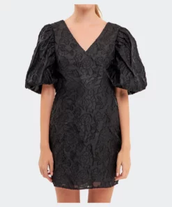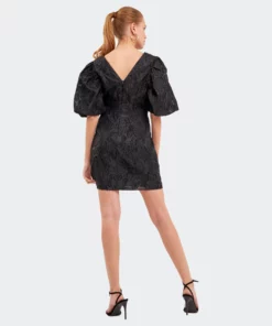 This mini dress is perfect for a special occasion. The floral sheen jacquard fabric is beautiful and the puff sleeves add a touch of femininity. The V neckline is flattering and the back zipper makes it easy to put on. The lining ensures that the dress is not see-through and the mini length is perfect for showing off your legs. The fitted silhouette is very flattering and makes this dress a great choice for any woman.