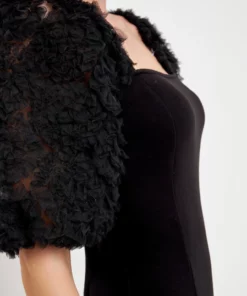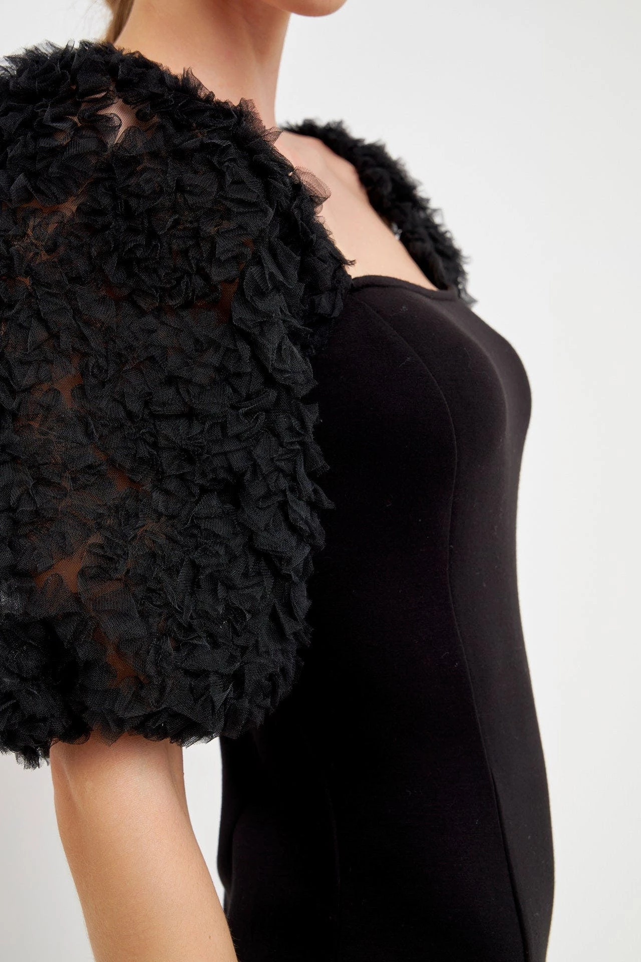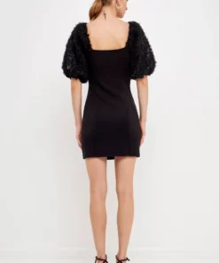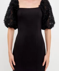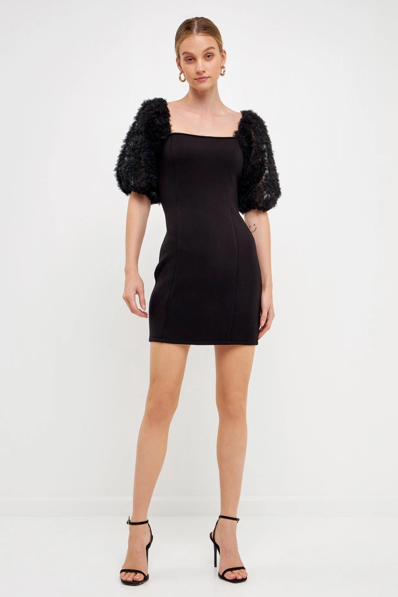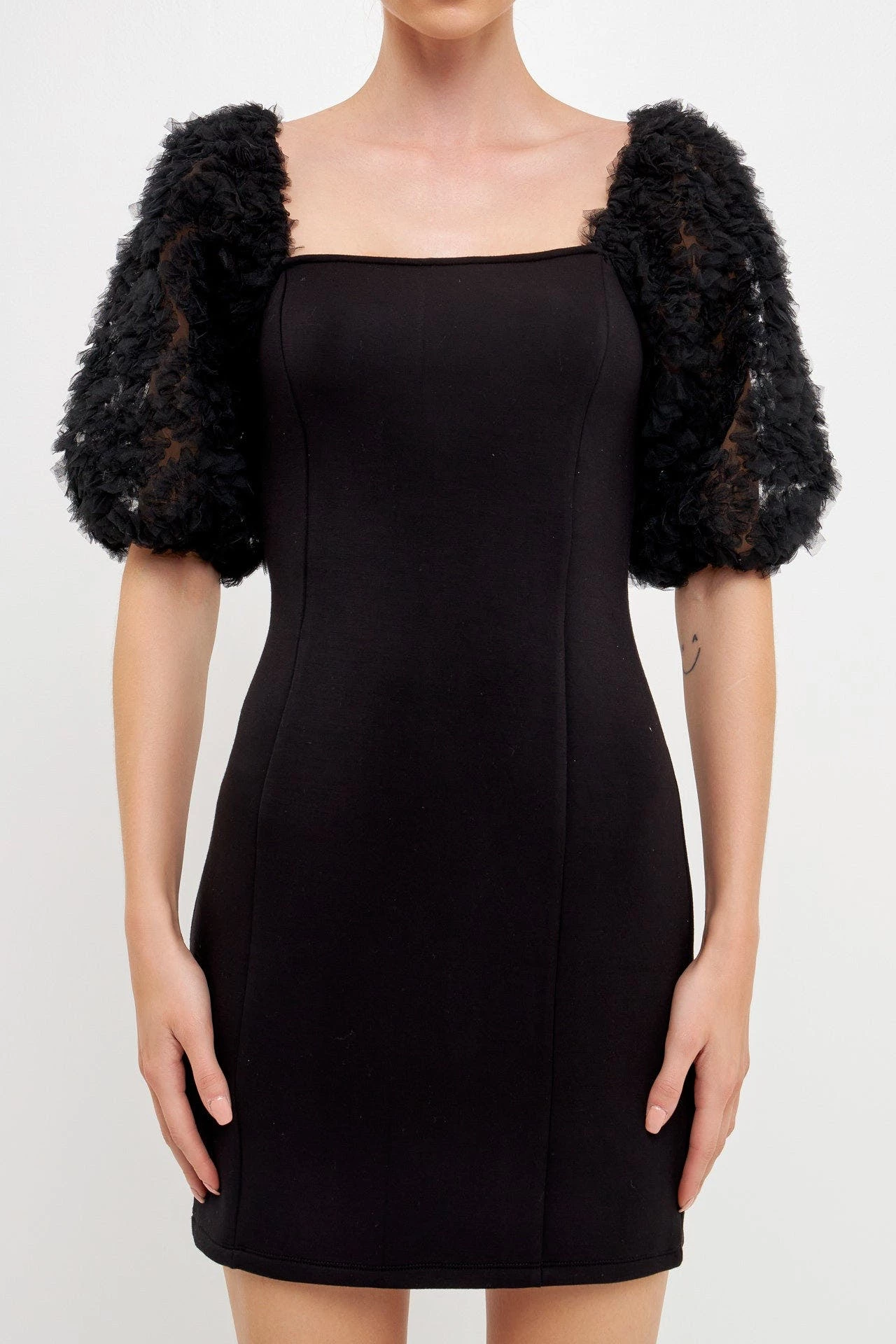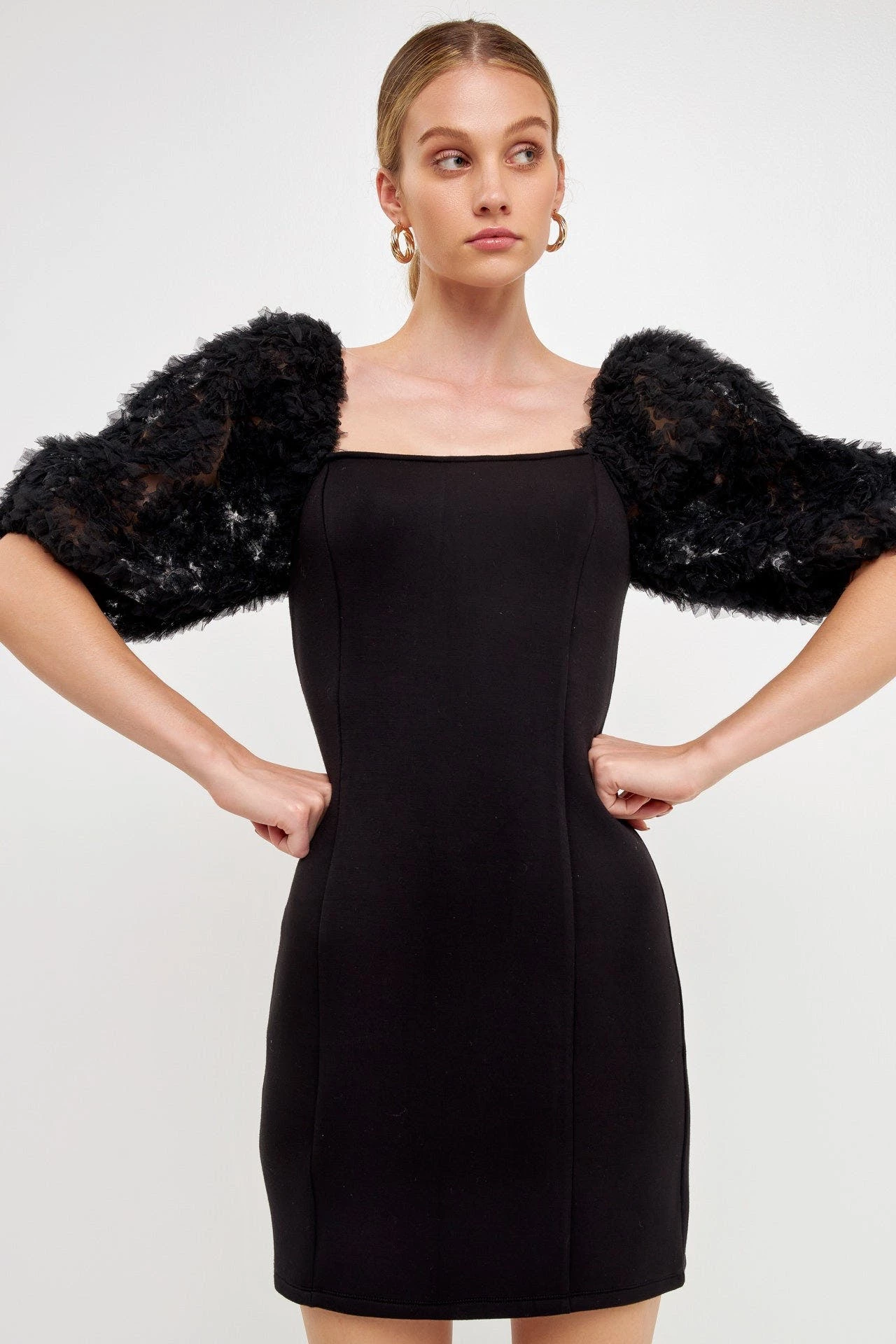 This mini dress has tulle puffy sleeves and a body made from stretchy scuba knit fabric. The fitted silhouette features an elegant square neckline.