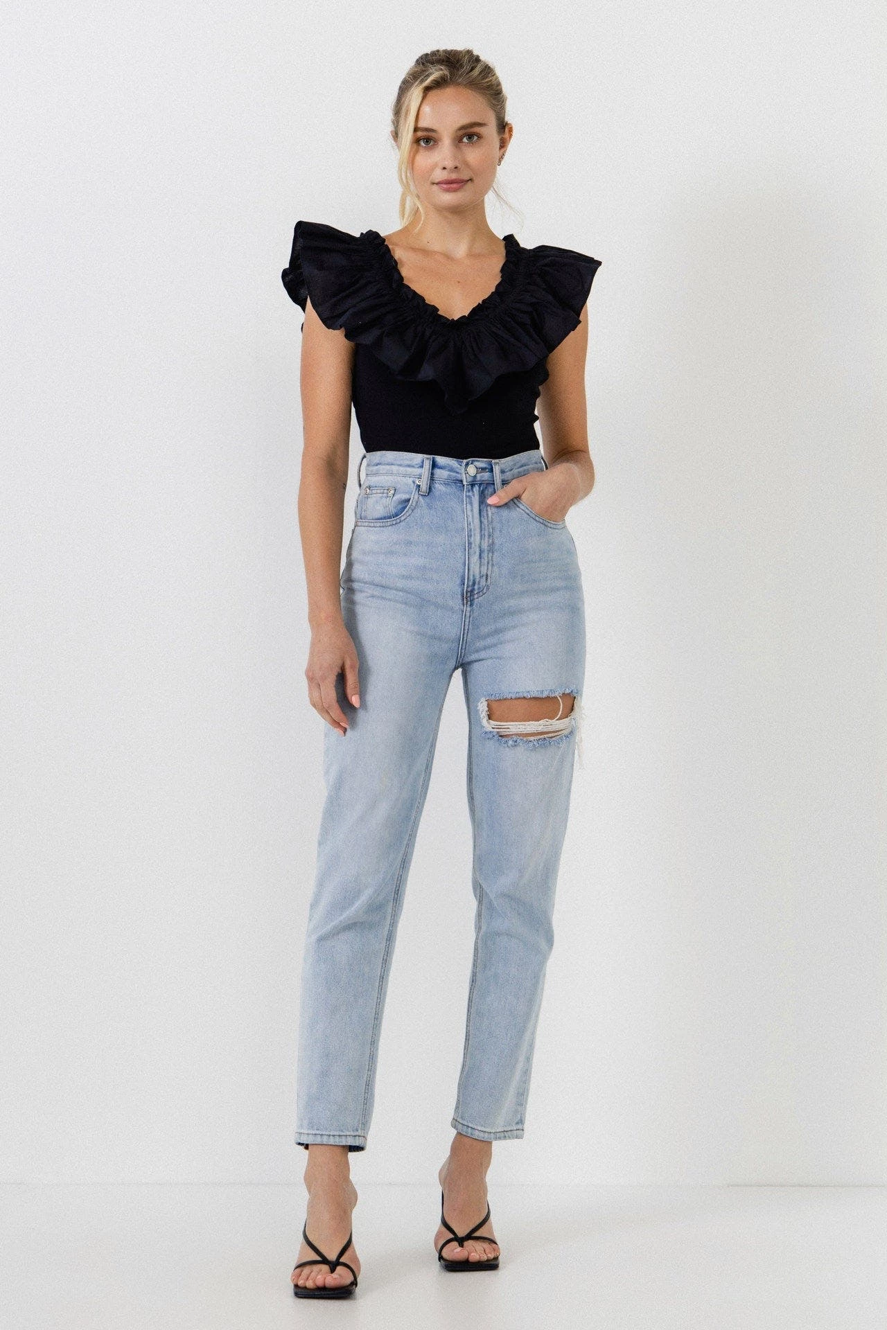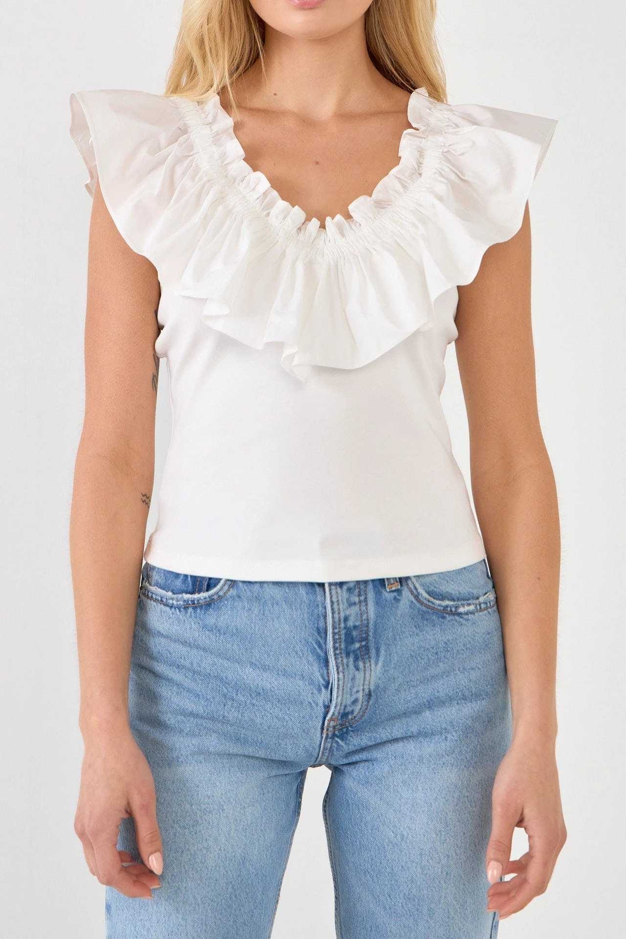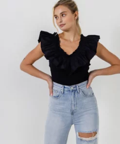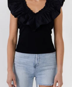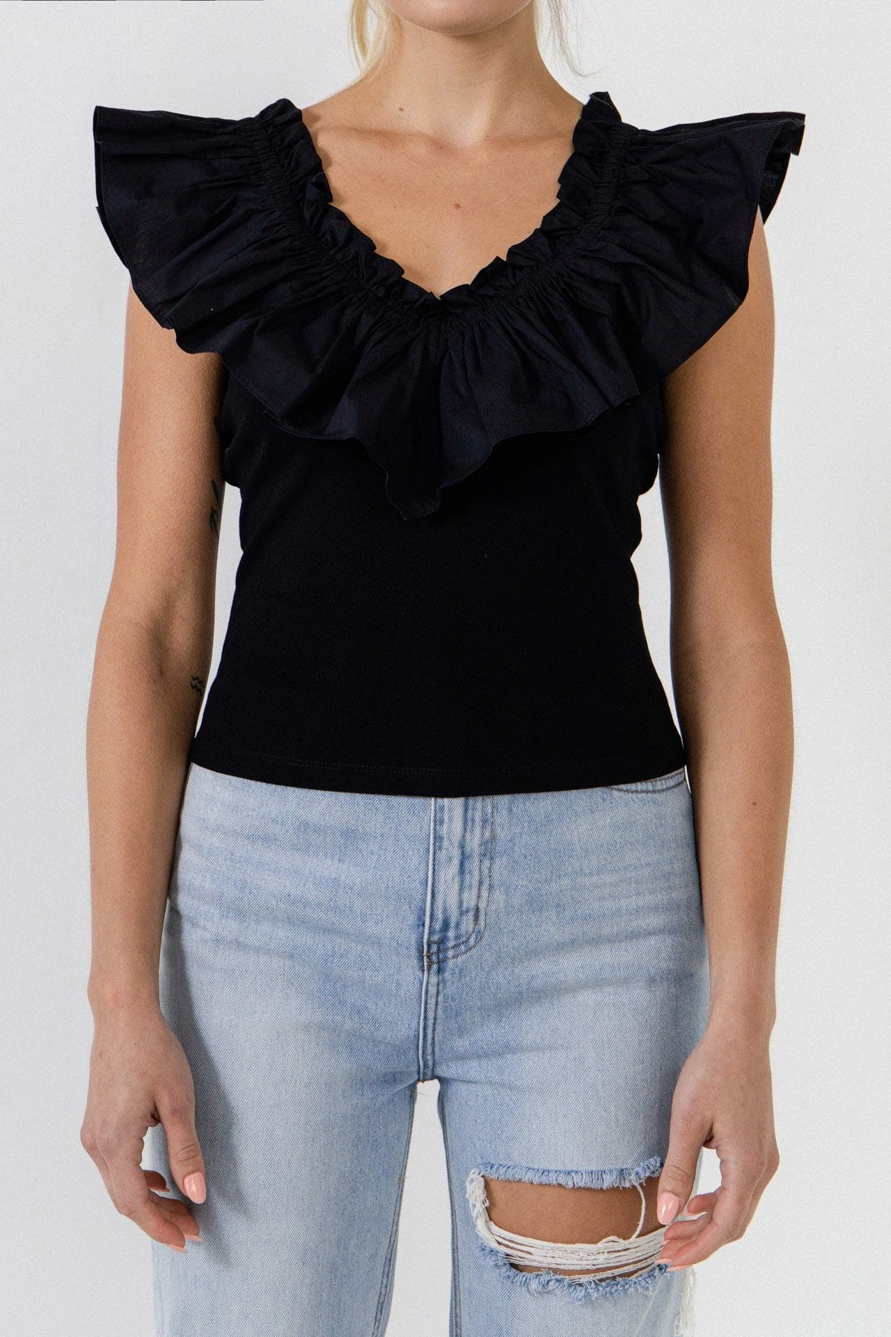 Elevate your everyday style with this pretty tank top. Feminine and flowy, this tank top features a playful ruffle detail at the neckline. With its mixed media design, it’s perfect for dressing up or down. Wear it with jeans and sandals for a casual day out or dress it up with trousers and heels for a night on the town. No matter how you style it, this tank top is sure to turn heads.