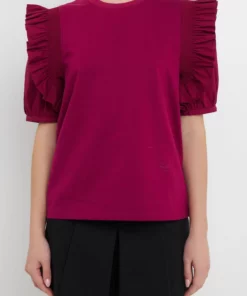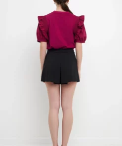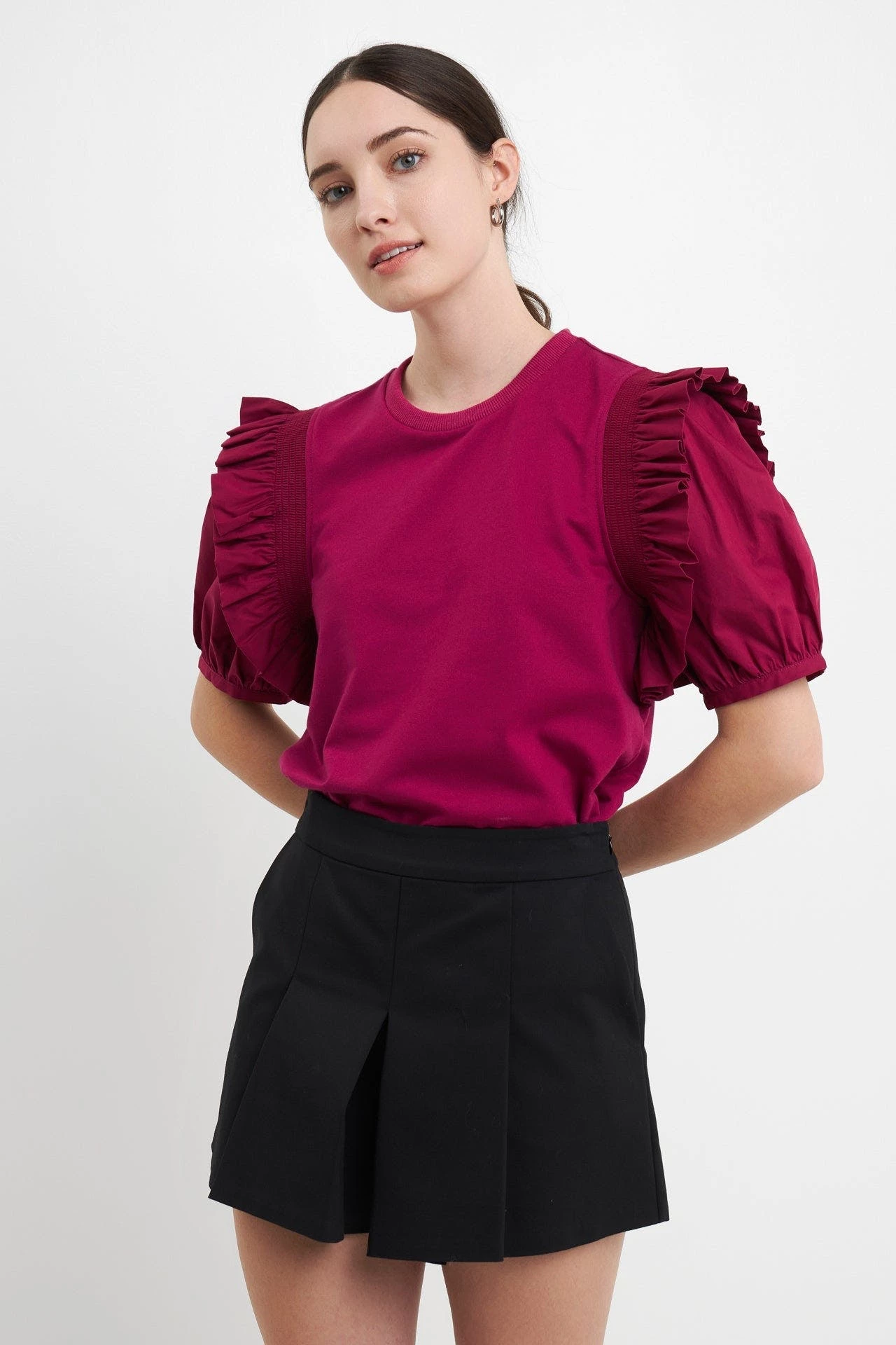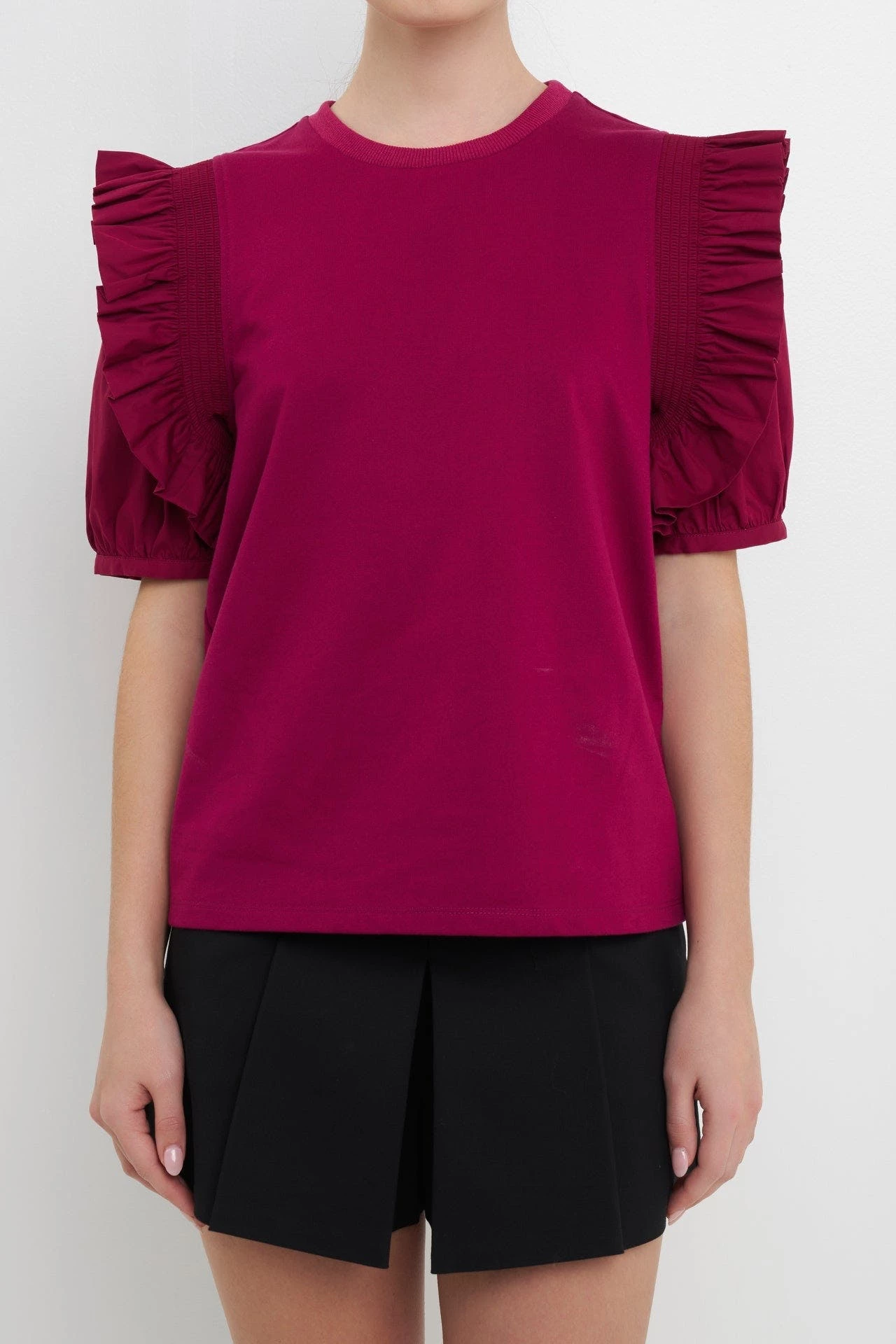 This ruffle sleeve t-shirt can pair with all of your favorite bottoms. The classic t-shirt you know and love is elevated with puffy sleeves that feature a prominent ruffle detail. Dress casually by styling this top with a pair of jeans and sneakers or dress this top up with a fun mini skirt and heels.
