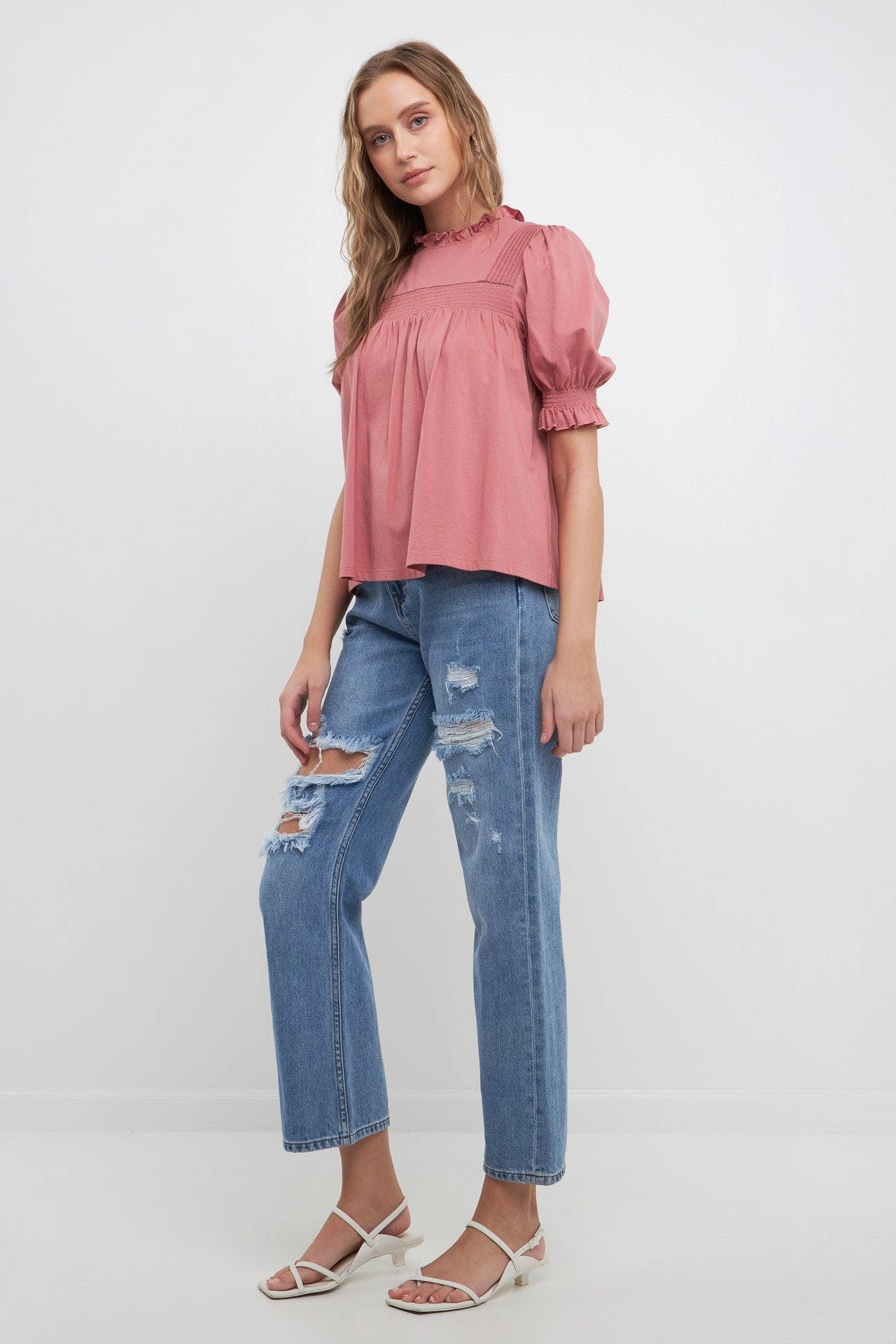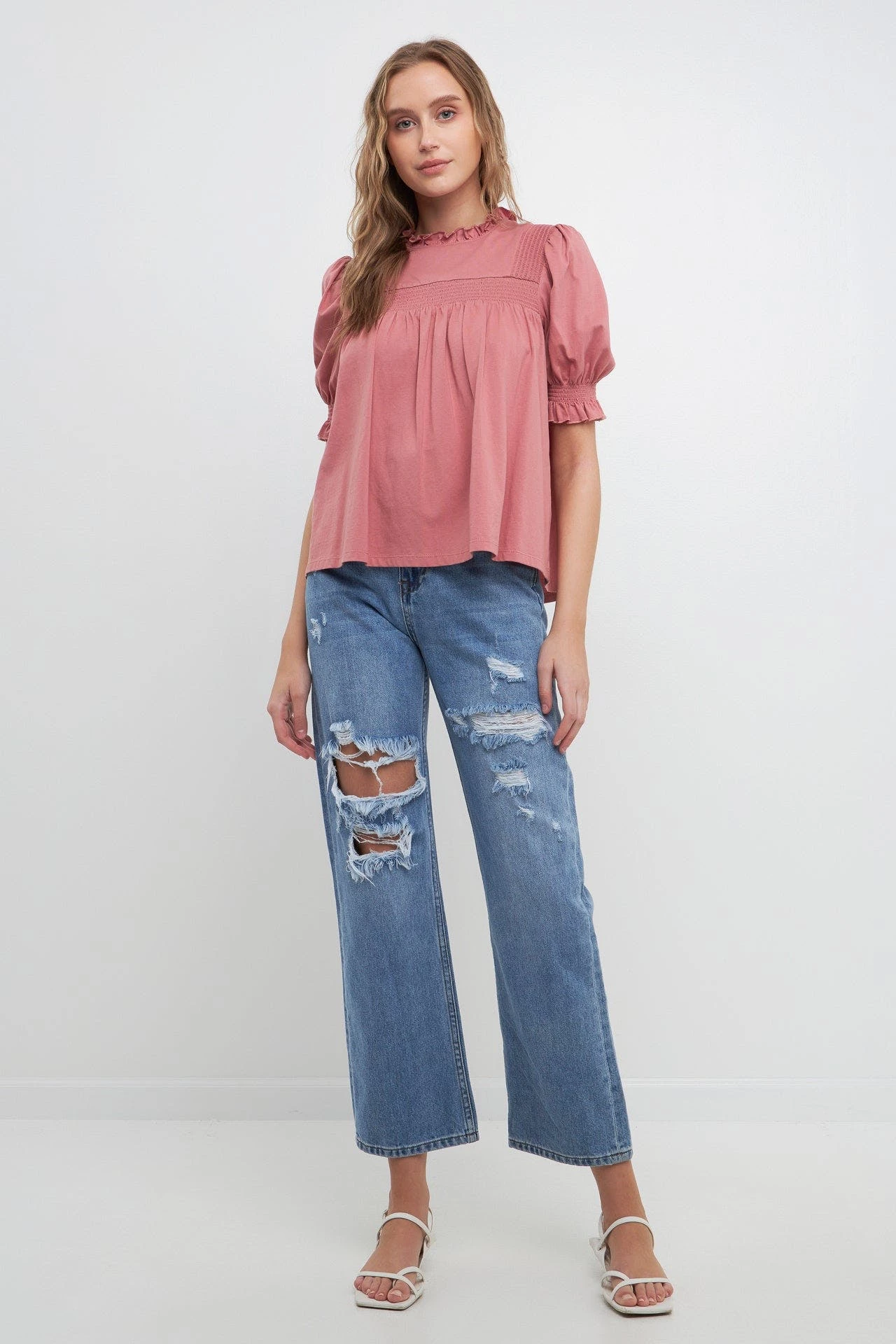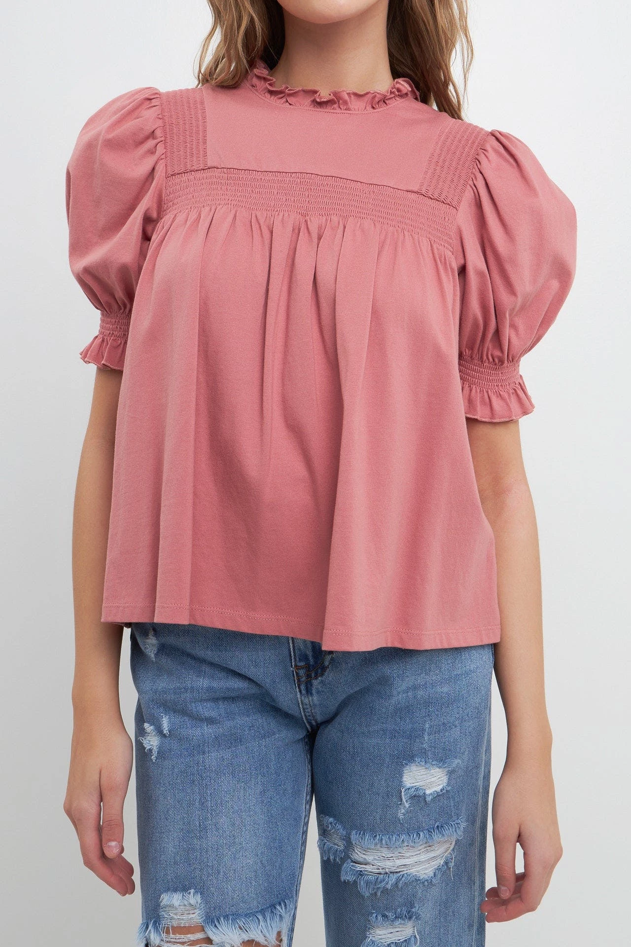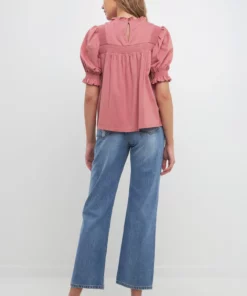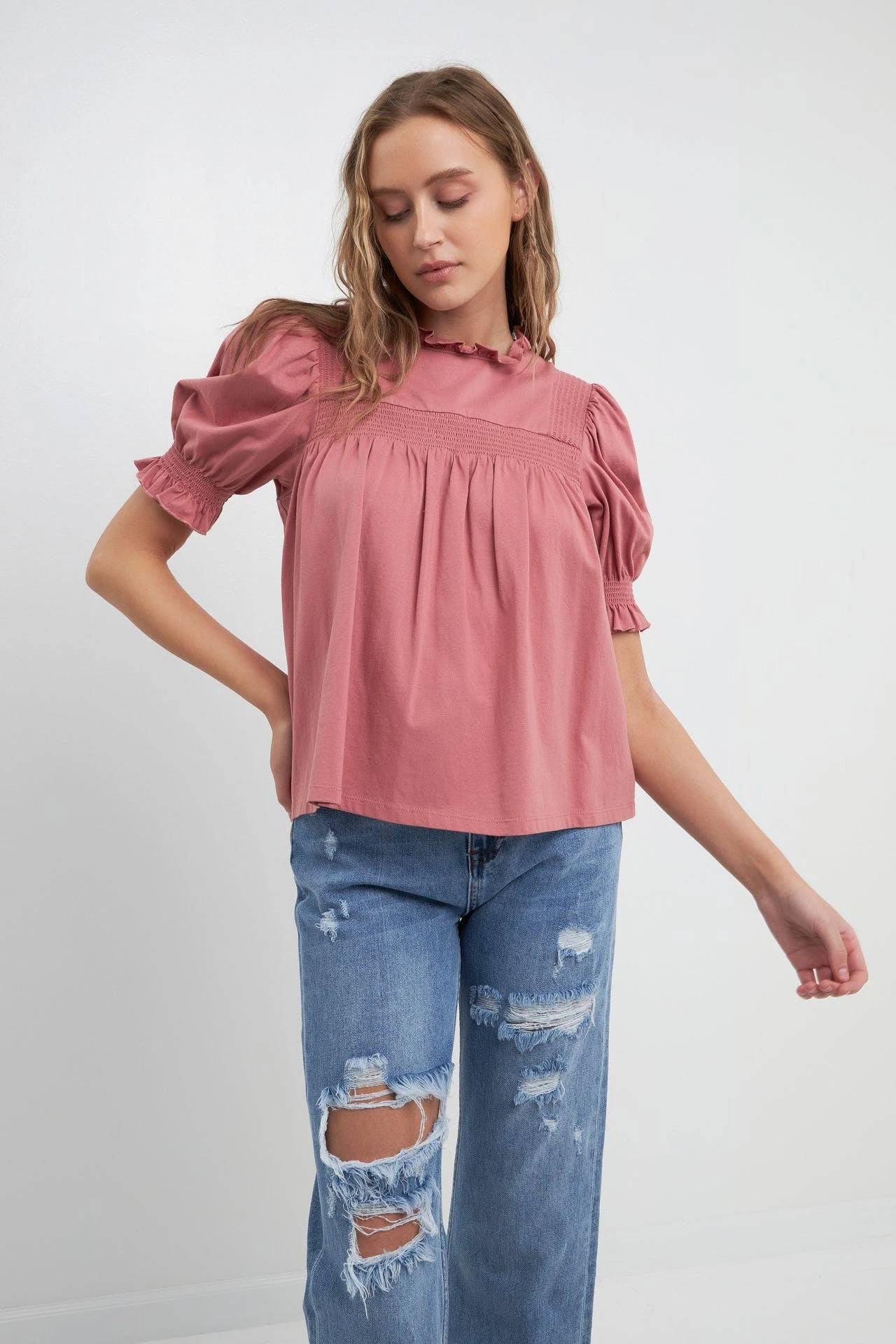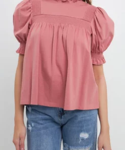 – Puff short sleeve- Smocking details at yoke & sleeve hem- Center back keyhole & button opening- Hand wash cold- Do not bleach- Do not tumble dry- Iron low- Shell: 100% cotton- Exclusive of elastic- Imported, china- Xs- Height 5’10”(178cm) / bust 32”(81cm) / waist 25”(64cm) / hip 34”(86cm)- Total length: 23.75″, bust: 37″