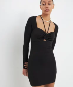 Create an edgy look with this fitted mini dress. With its spaghetti tie and cut out details, this mini gives you a modern and chic look. The ruched halter neckline also adds a touch of glamor. Pair this mini with some sexy heels and you’re ready to party.