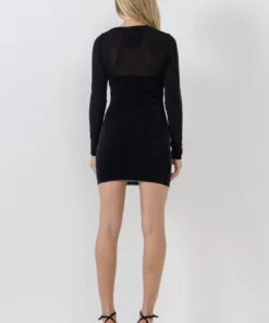 – Mini length- Stretchy shimmering mesh fabric- Sheer- Long sleeves- Tight fit- Detachable lining dress included- Total length: 32.50″, Bust: 30.50″