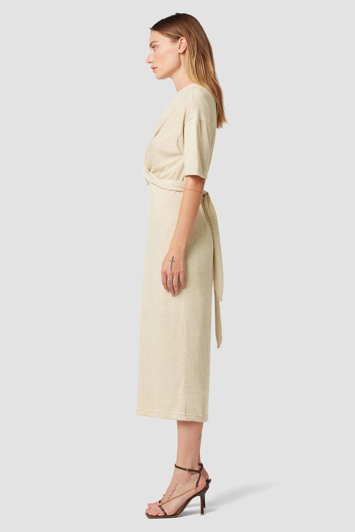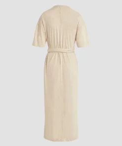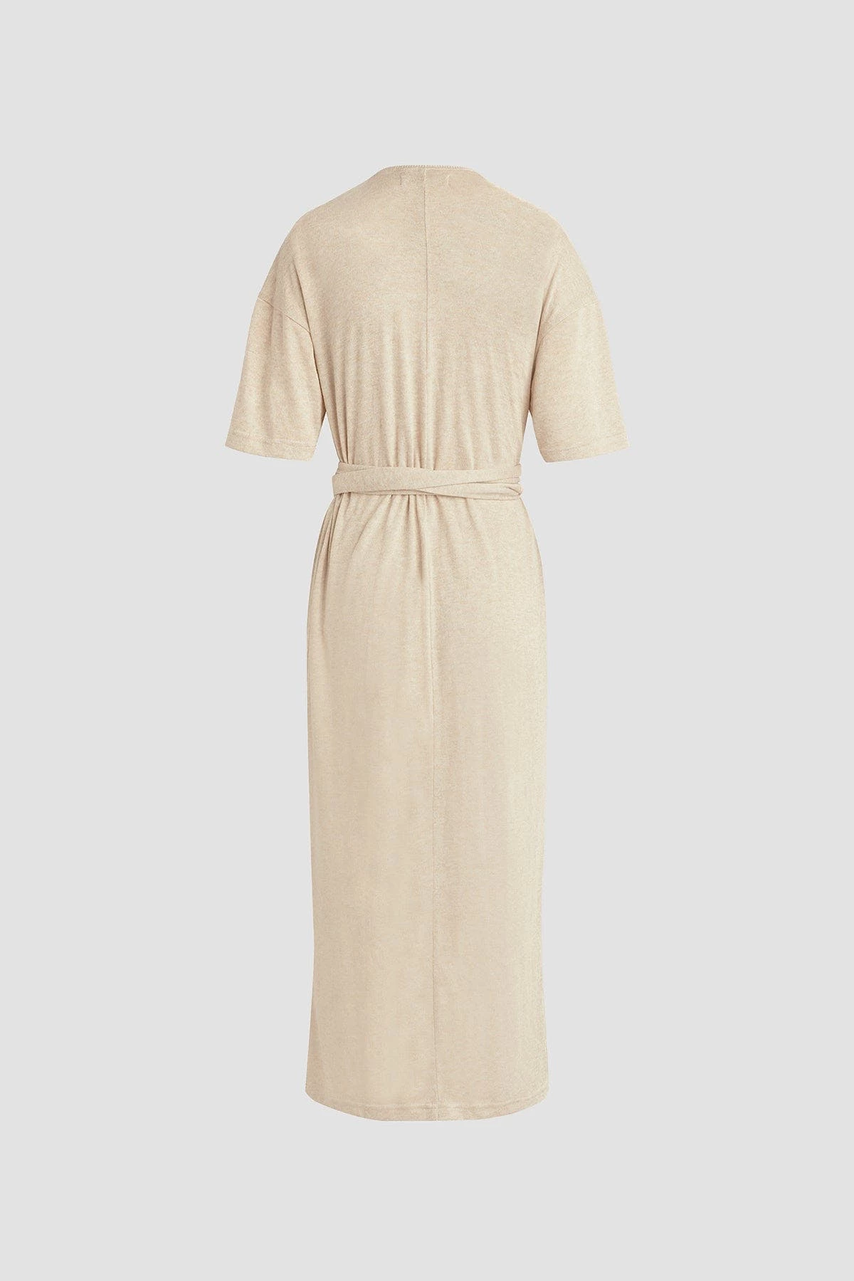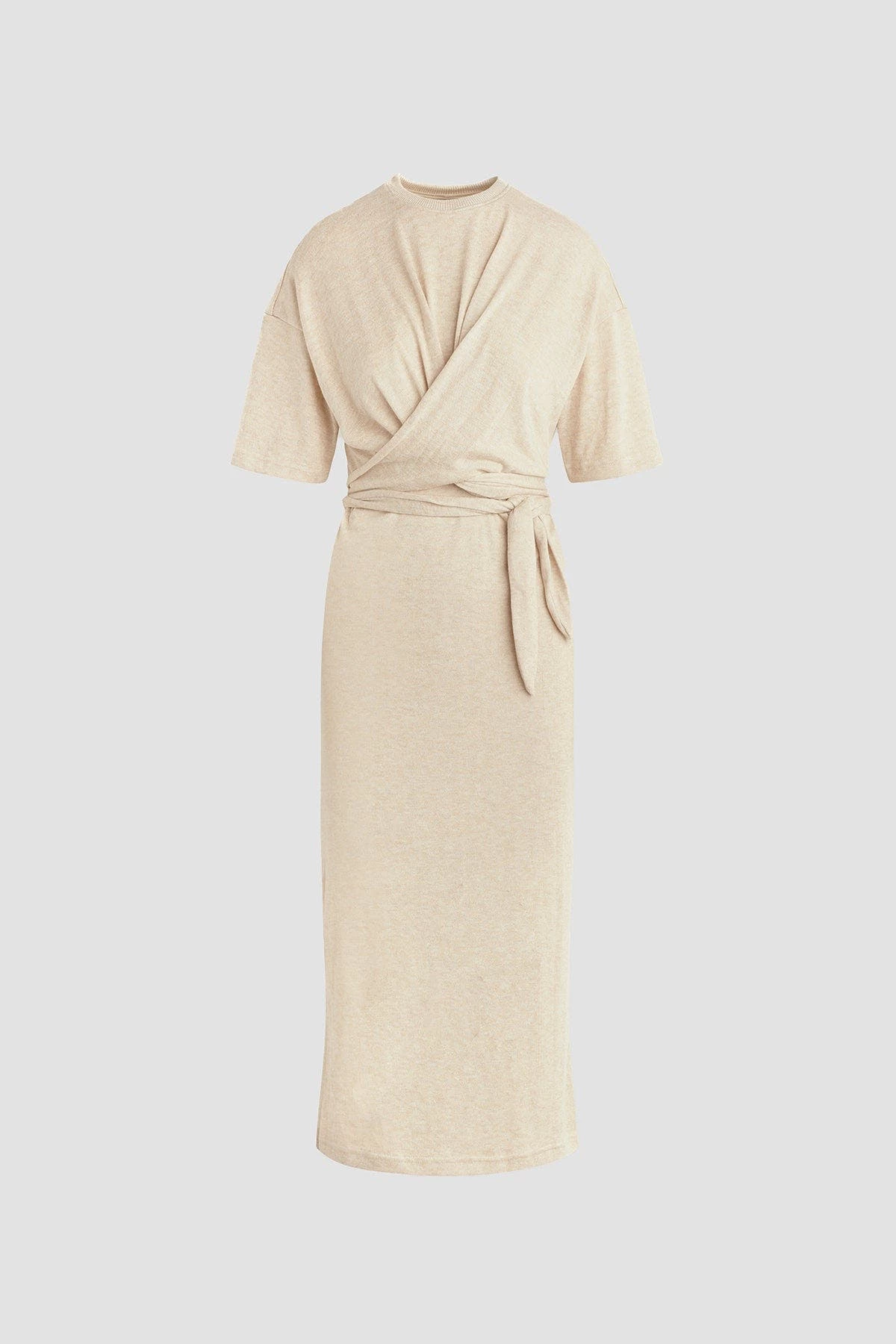 Our wrap short sleeve sweater dress in warm sand is cut from a soft and stretchy knit with a tie waist and side slit.