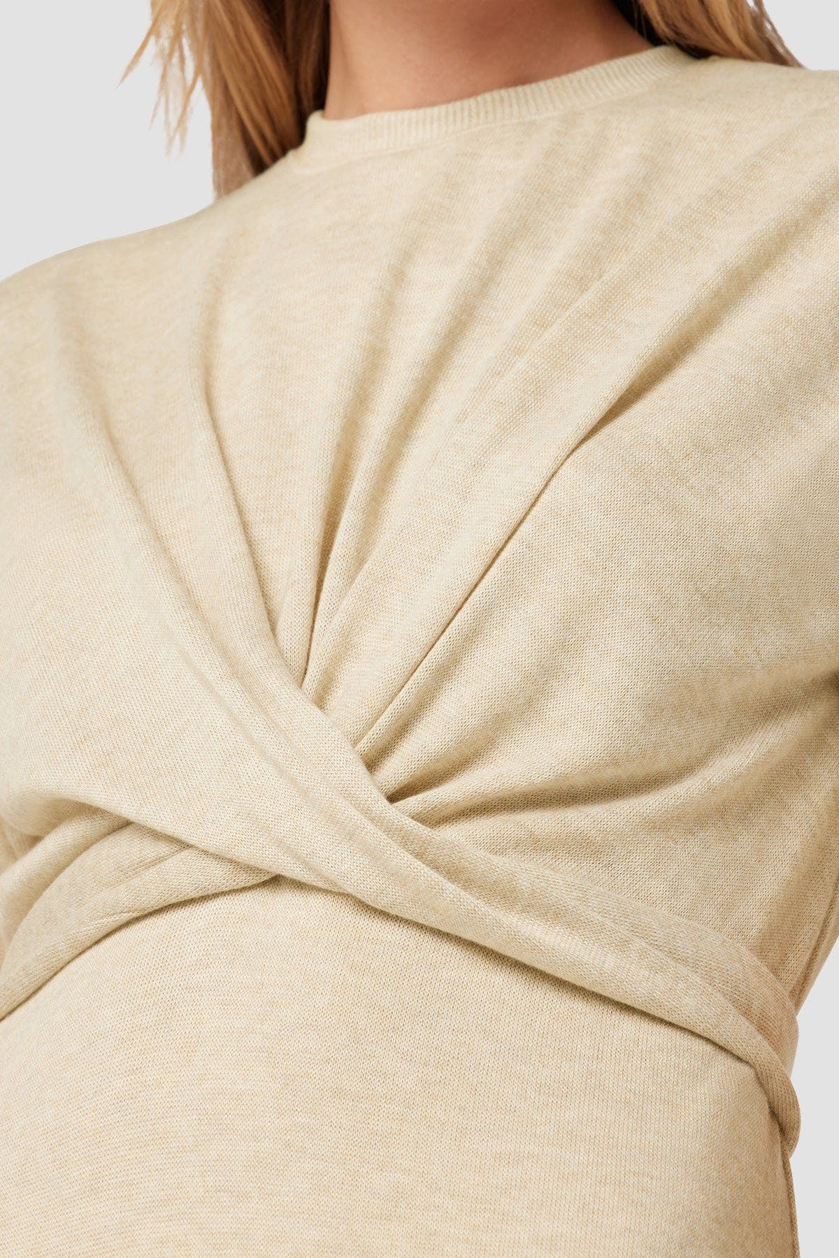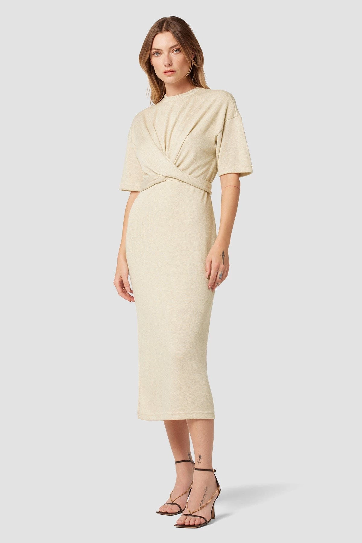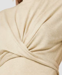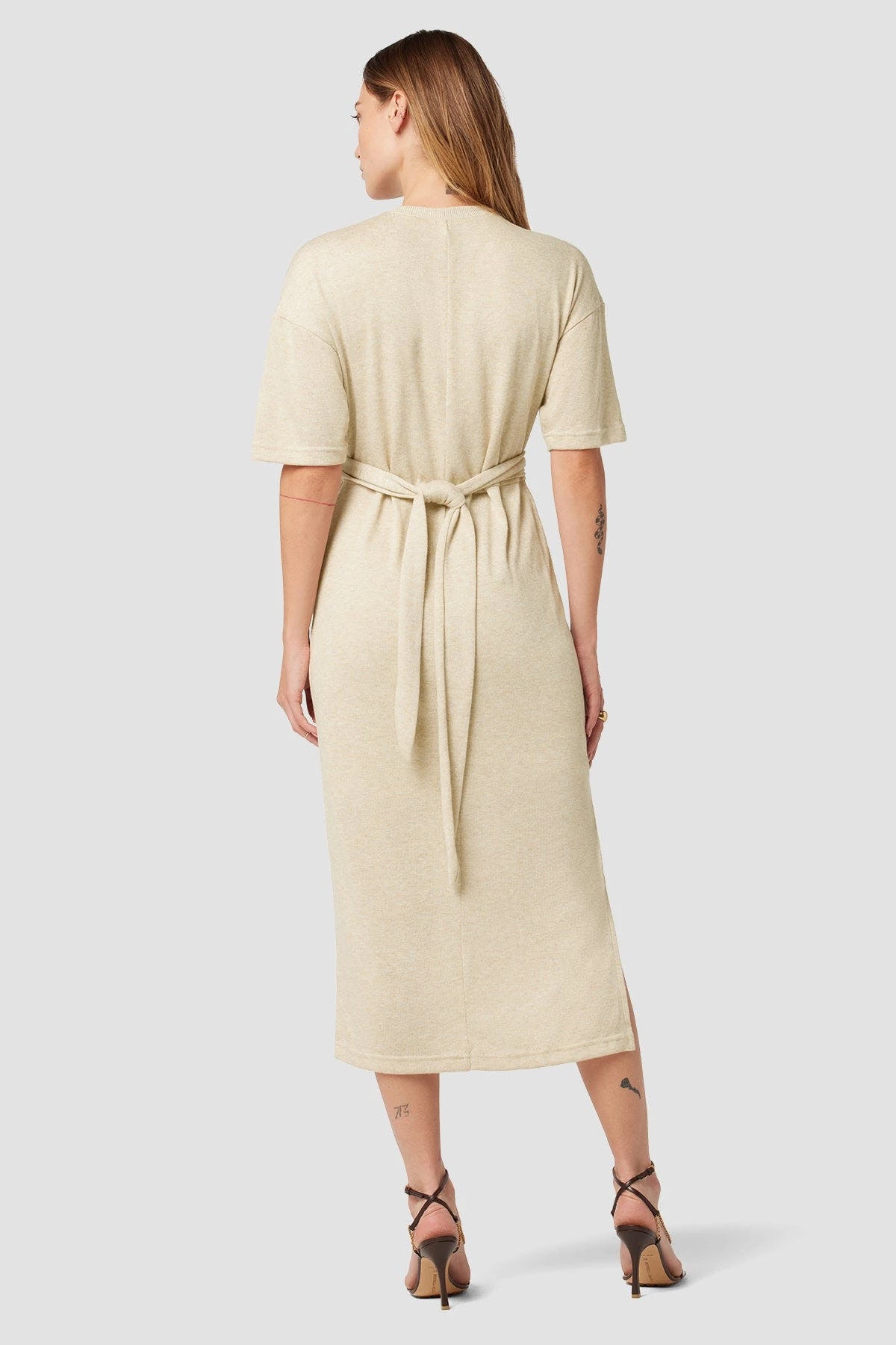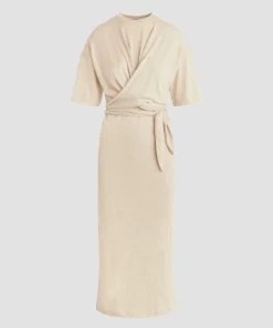 Our wrap short sleeve sweater dress in warm sand is cut from a soft and stretchy knit with a tie waist and side slit.