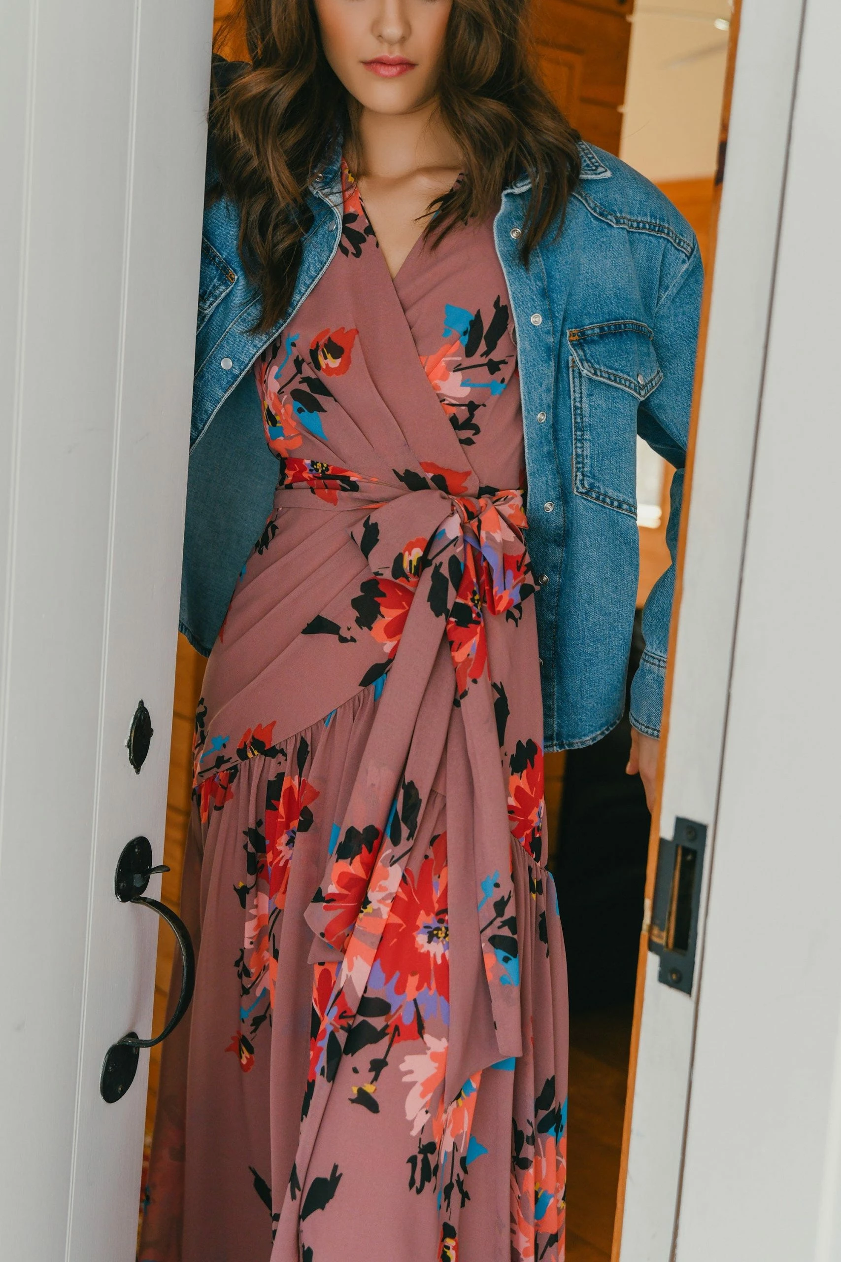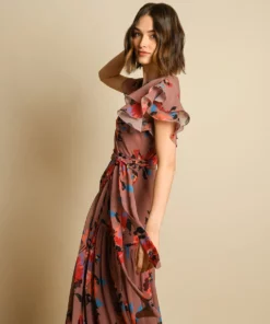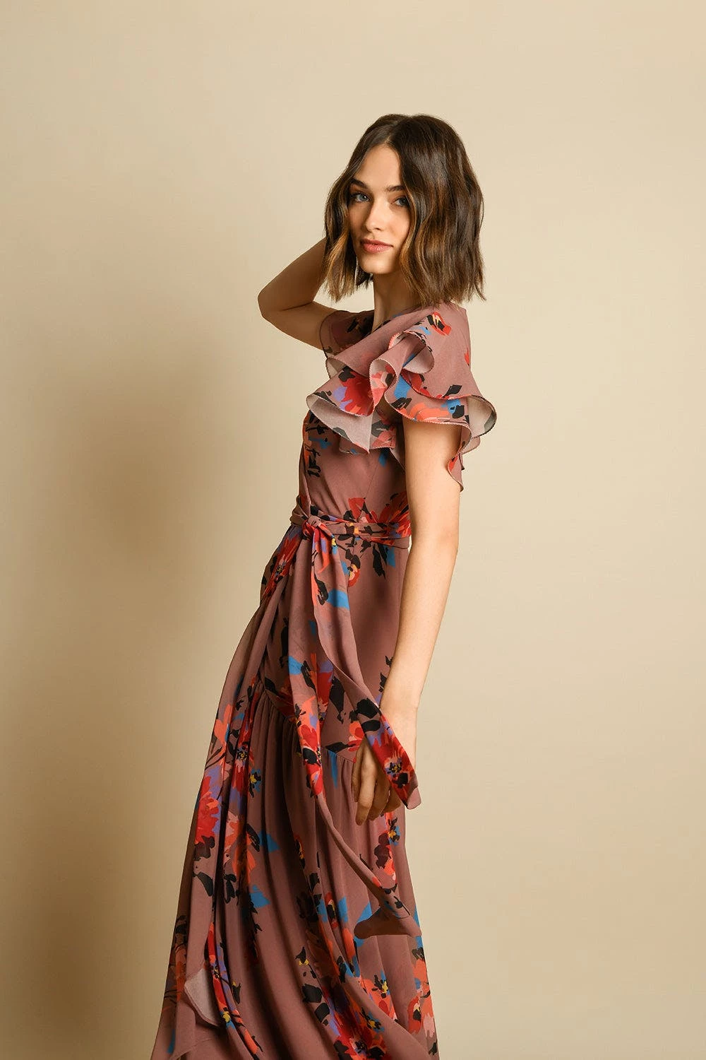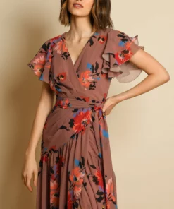 – Ruffle sheer sleeve wrap dress- Ruffle High low hem wrap silhouette- Self tie belt at waist- Taupe dramatic floral print- 46″ from HPS