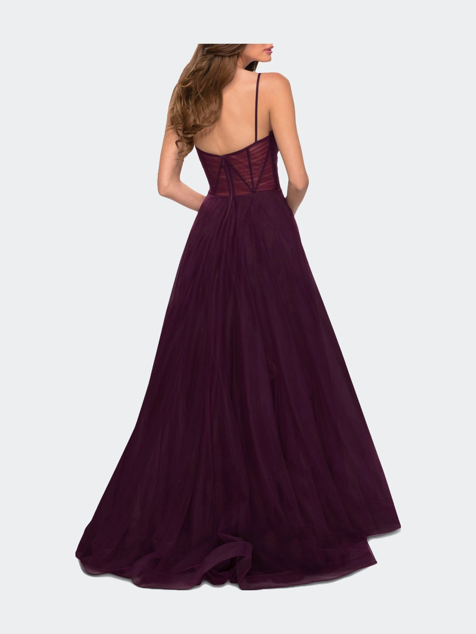 A line tulle gown with illusion bodice and back. V neckline, slit and pockets. Back zipper closure.