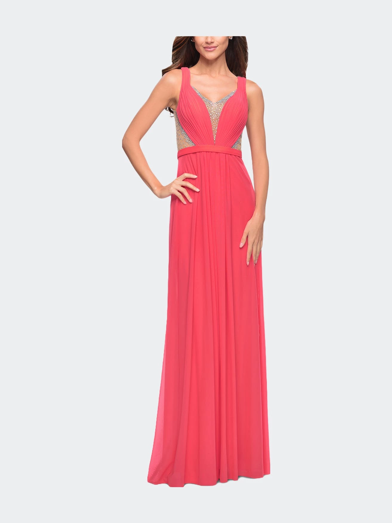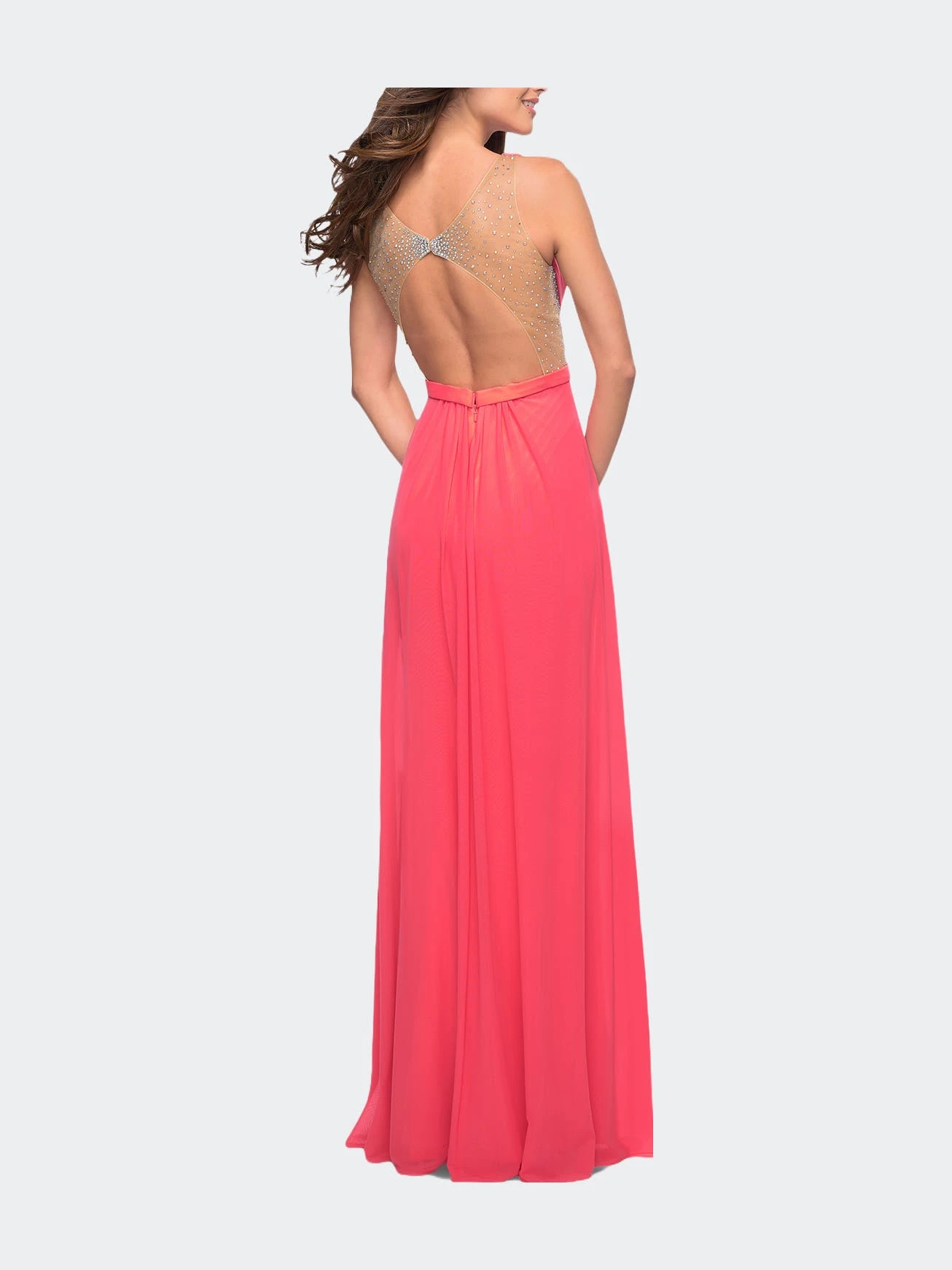 Alluring net gown with a plunging neckline and open back. The gown features sheer “V” neck, sides, and back that are embellished with scattered rhinestones. Back zipper closure.