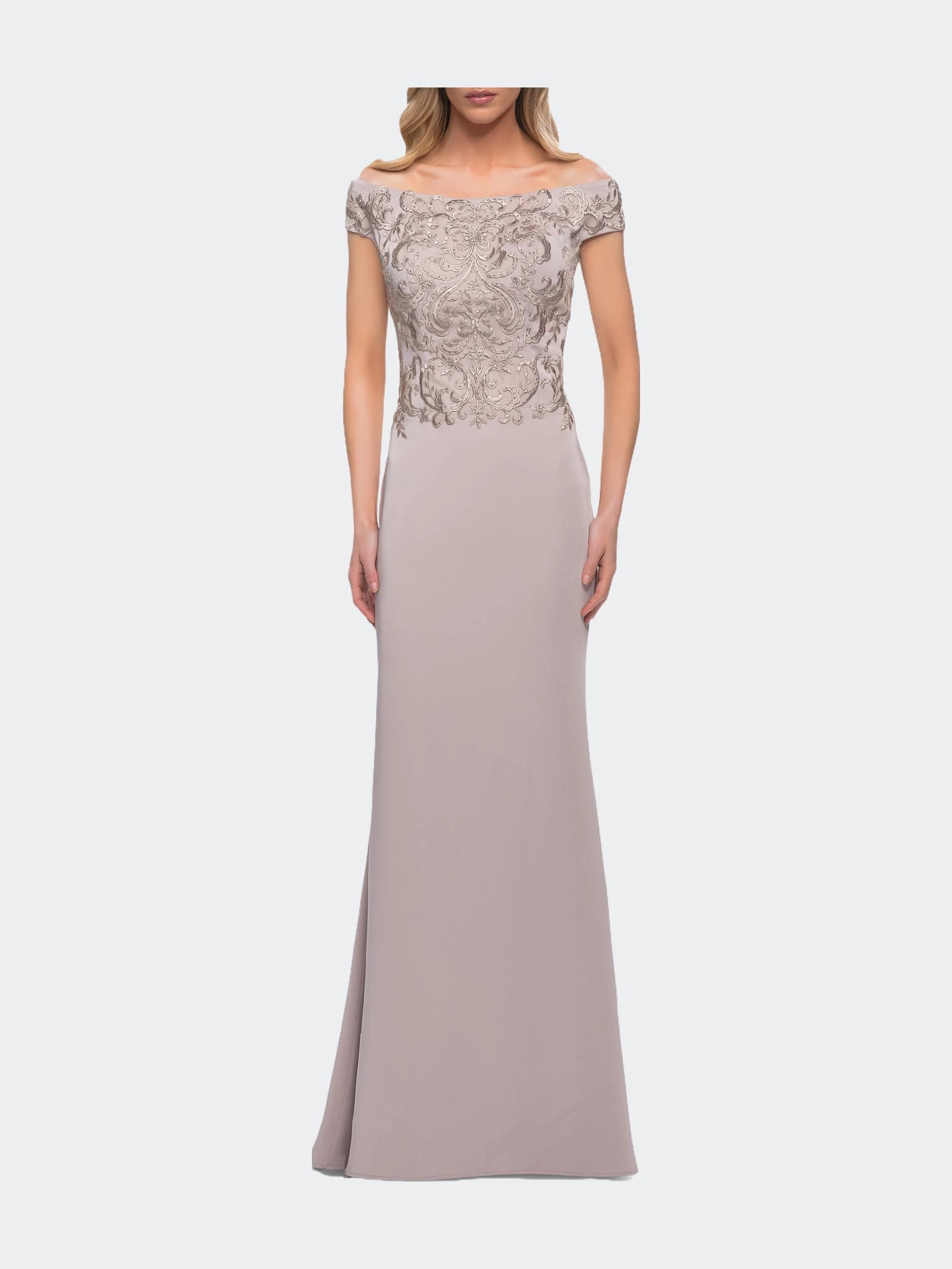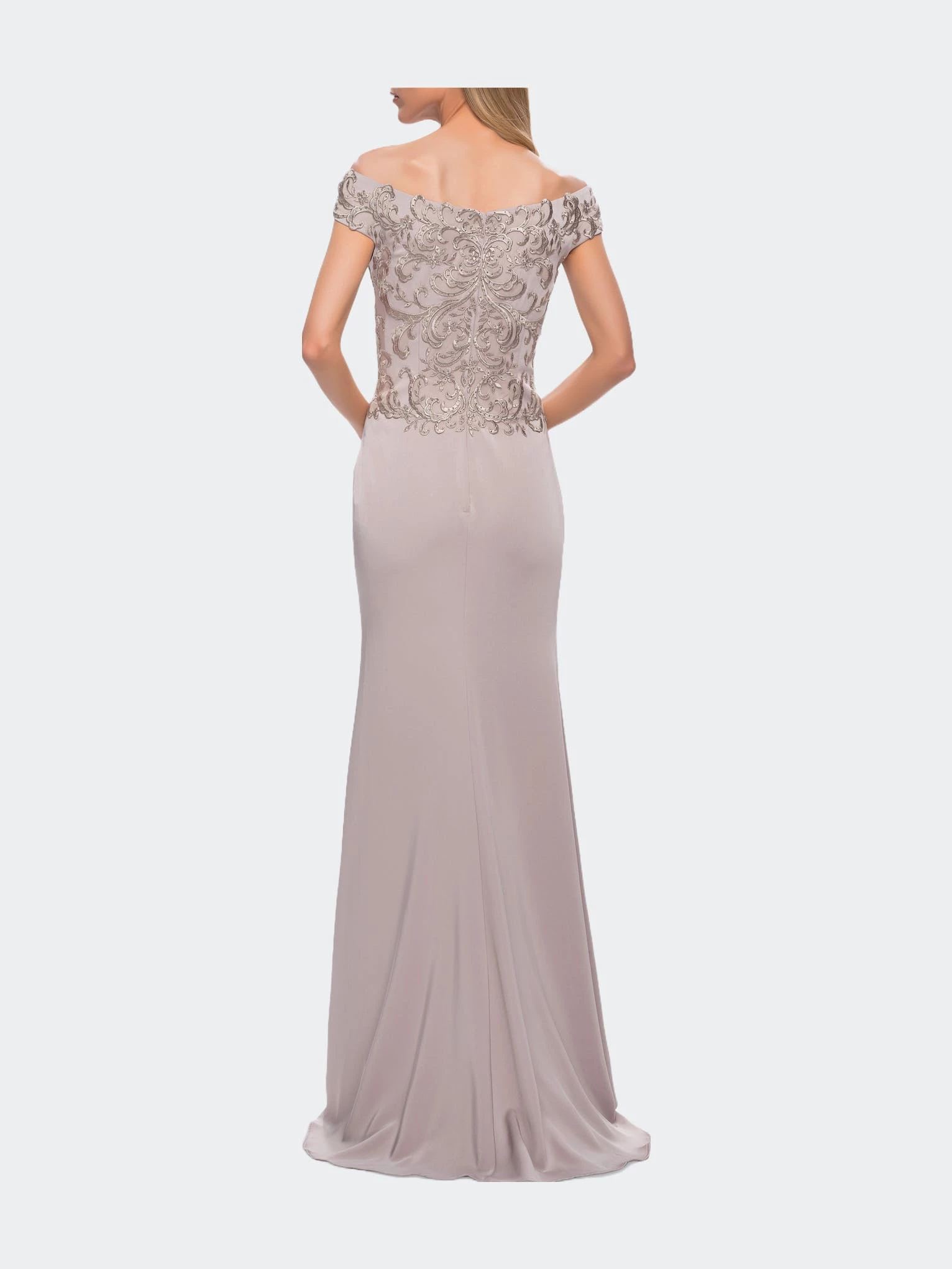 Off the shoulder jersey gown with embroidered design on bodice and sleeve. Back zipper closure.