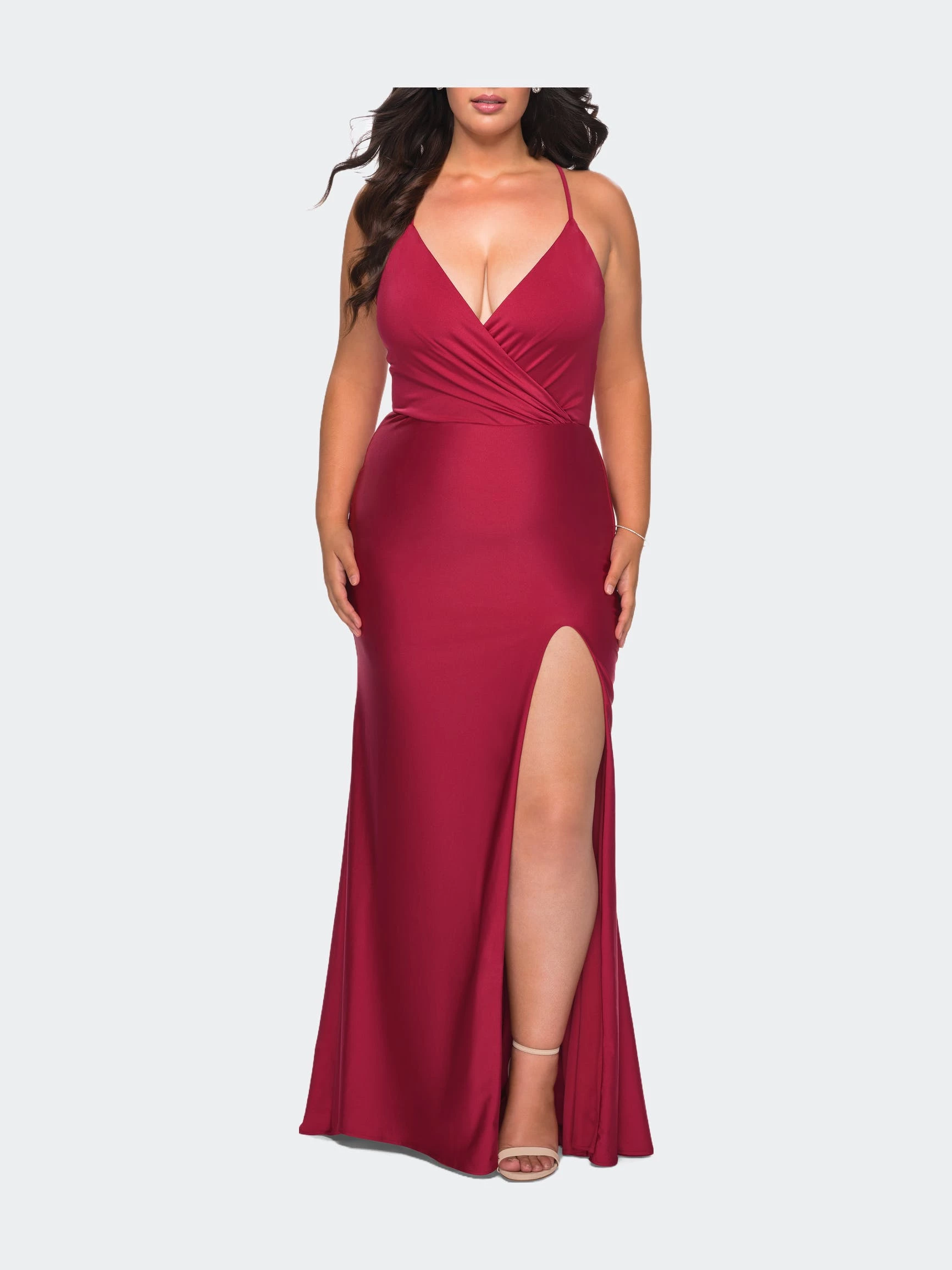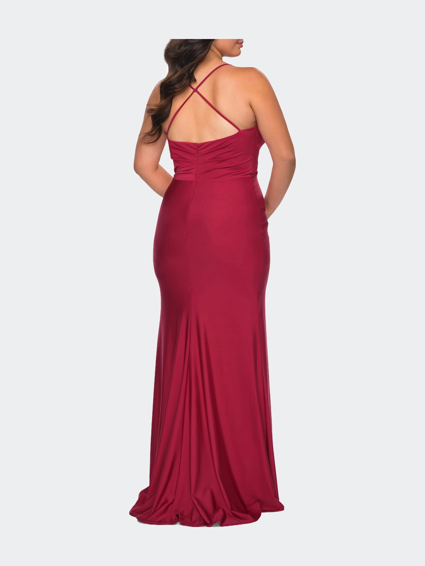 Flattering jersey plus size dress with stretch and a ruched bodice for a perfect fit. This design has a plunging V-neckline and side leg slit. A high criss cross back completes the look. Back zipper closure.