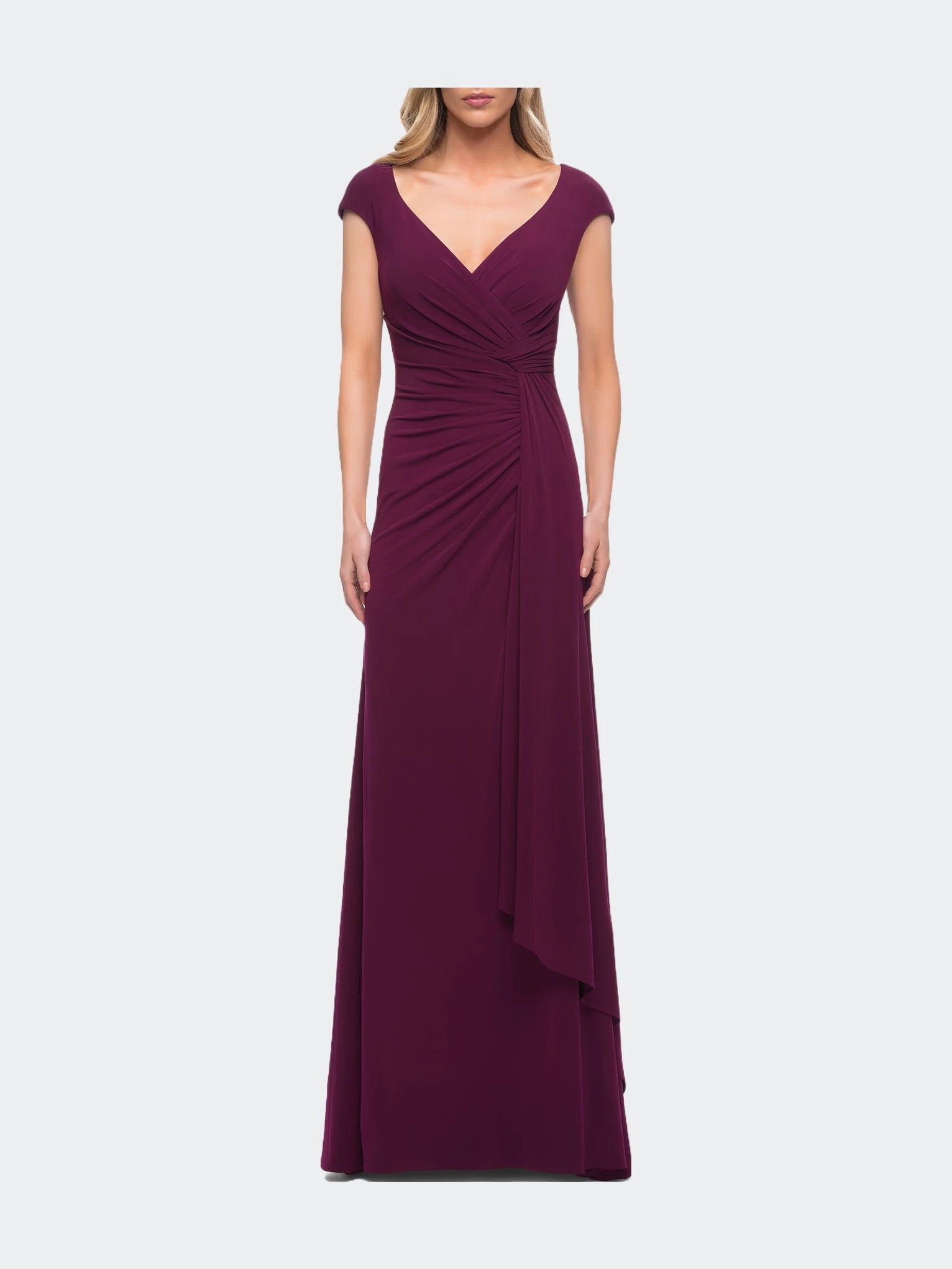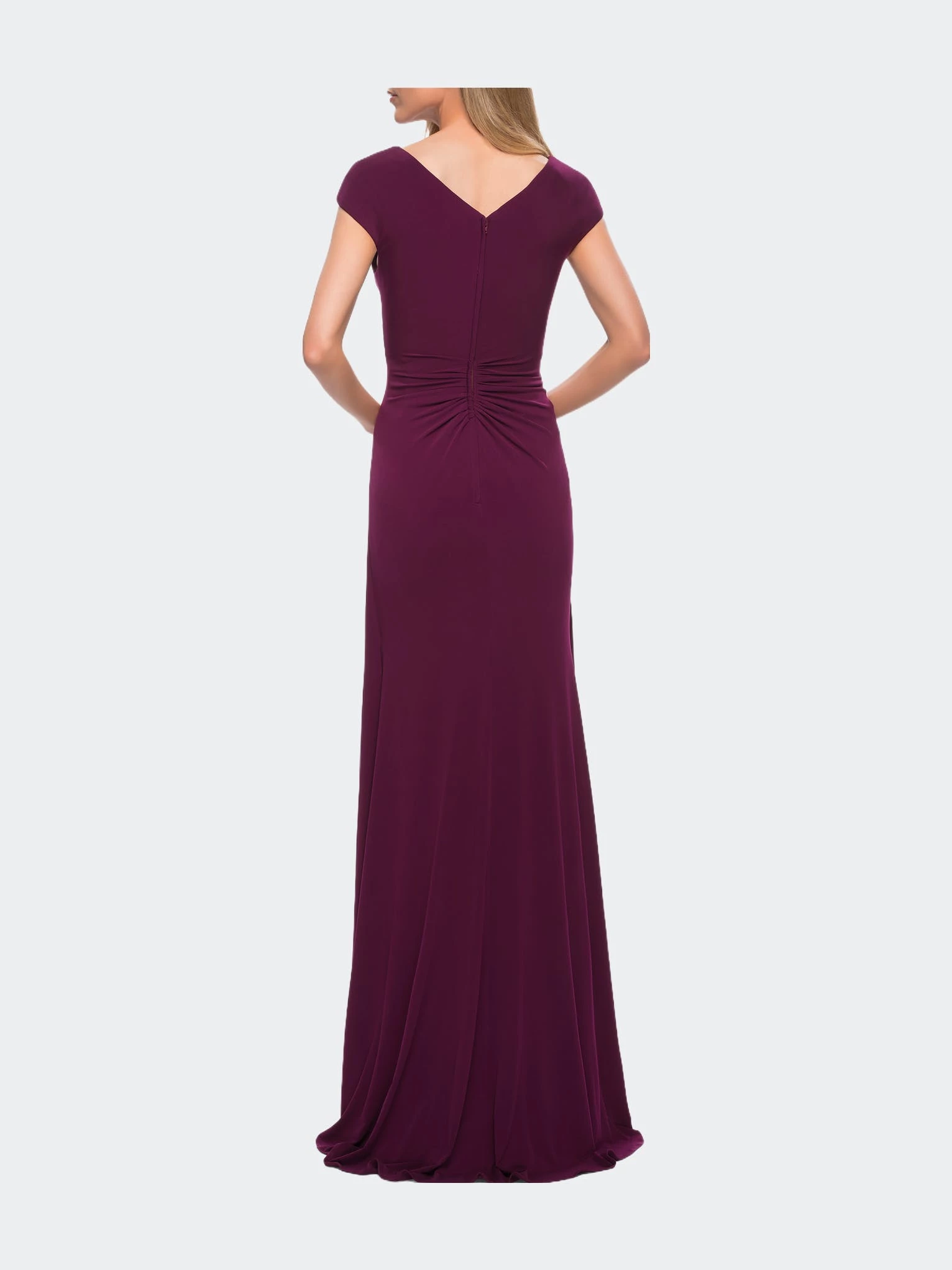 Jersey long dress with cap sleeves and V neckline. Flattering ruching criss-cross design at waist. Back zipper closure.