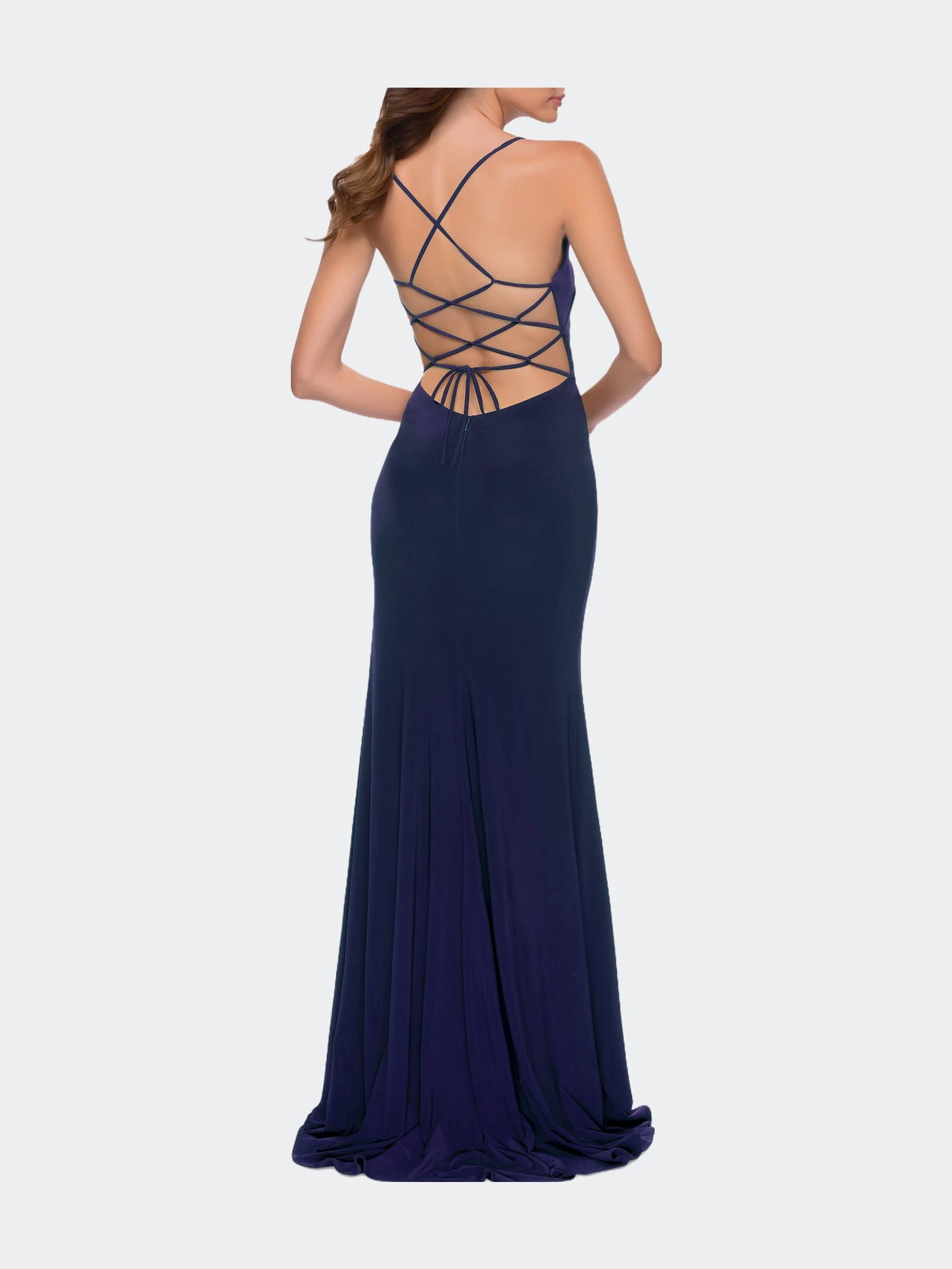 Matte jersey gown with square neckline and lace up strappy back. Skirt features a small ruffle on top of slit. Back zipper closure.