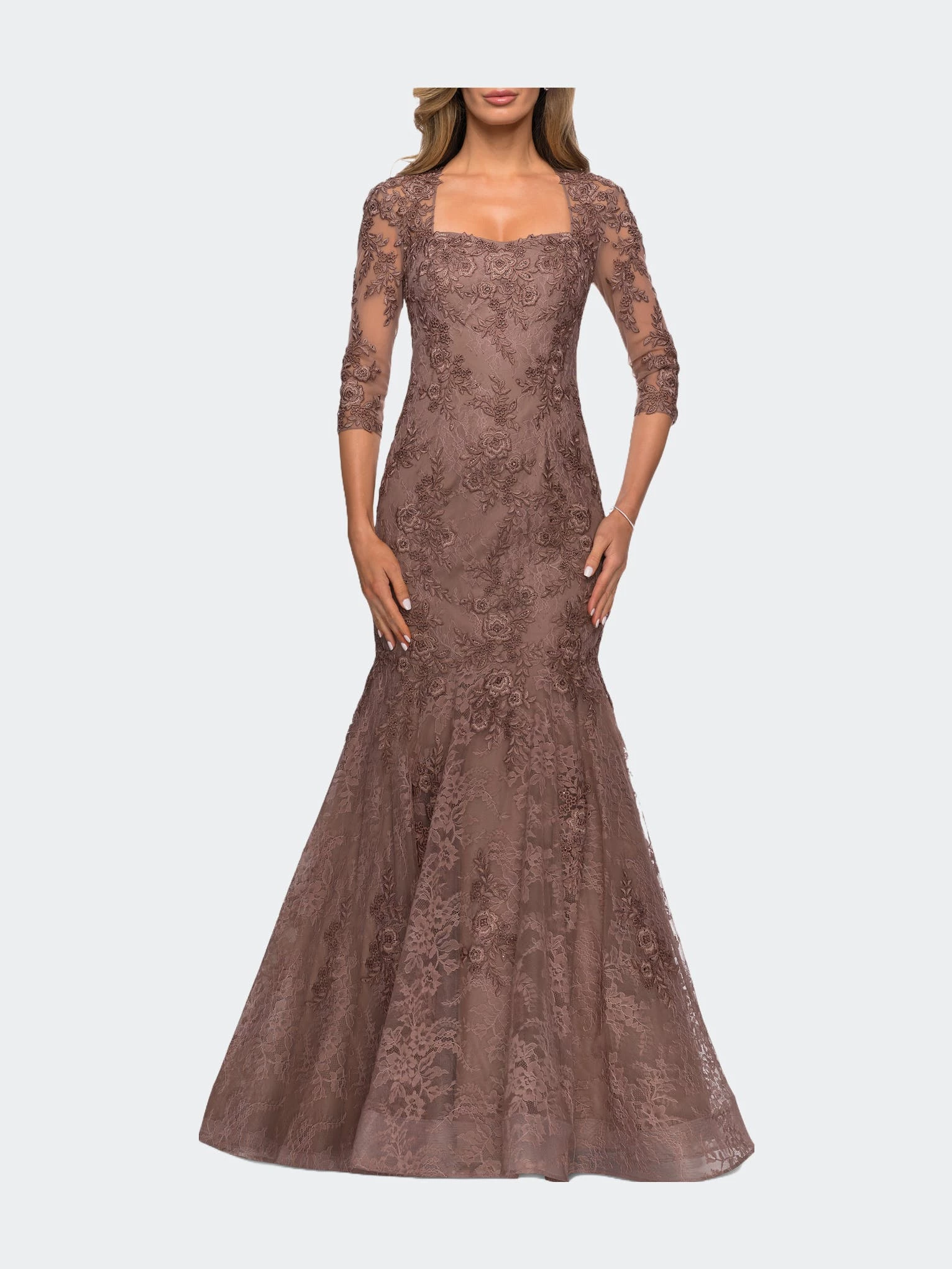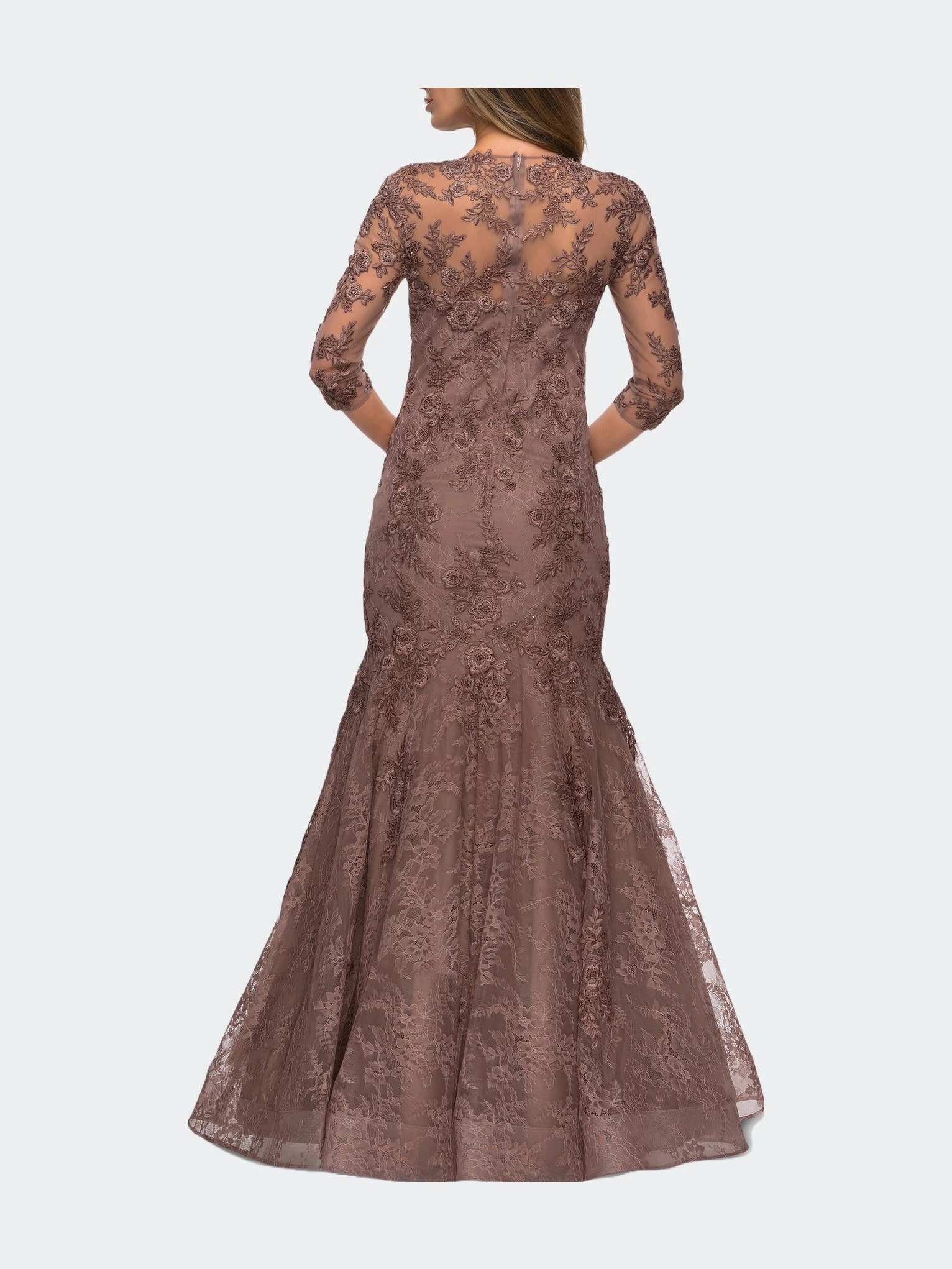 Long lace mermaid gown with three-quarter sleeves and sheer back. Back zipper closure.