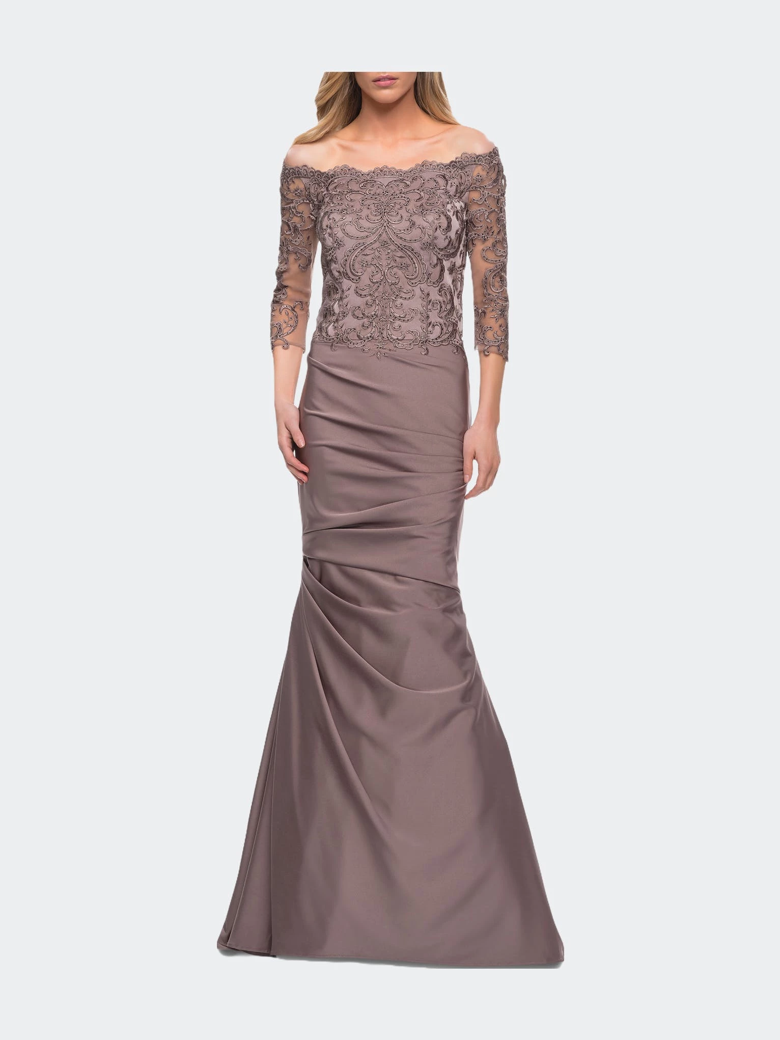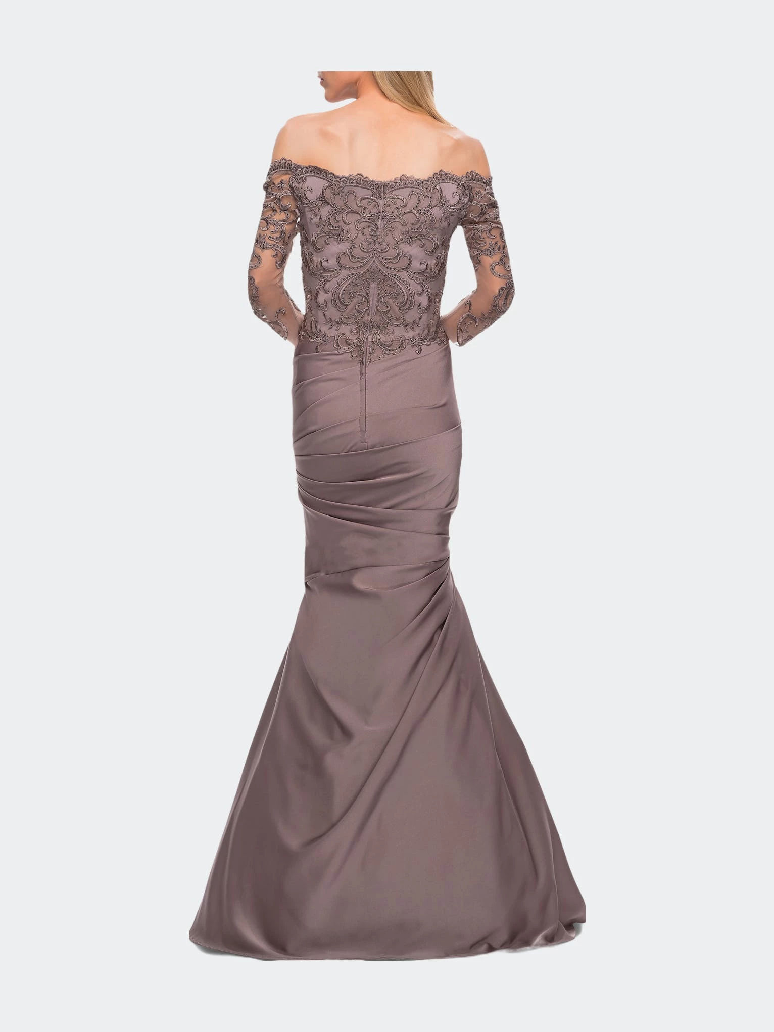 Long mermaid gown with jersey skirt and flattering pleating throughout. Bodice features embroidered lace and scallop detailing on neckline. Sheer three quarter sleeves. Back zipper closure.