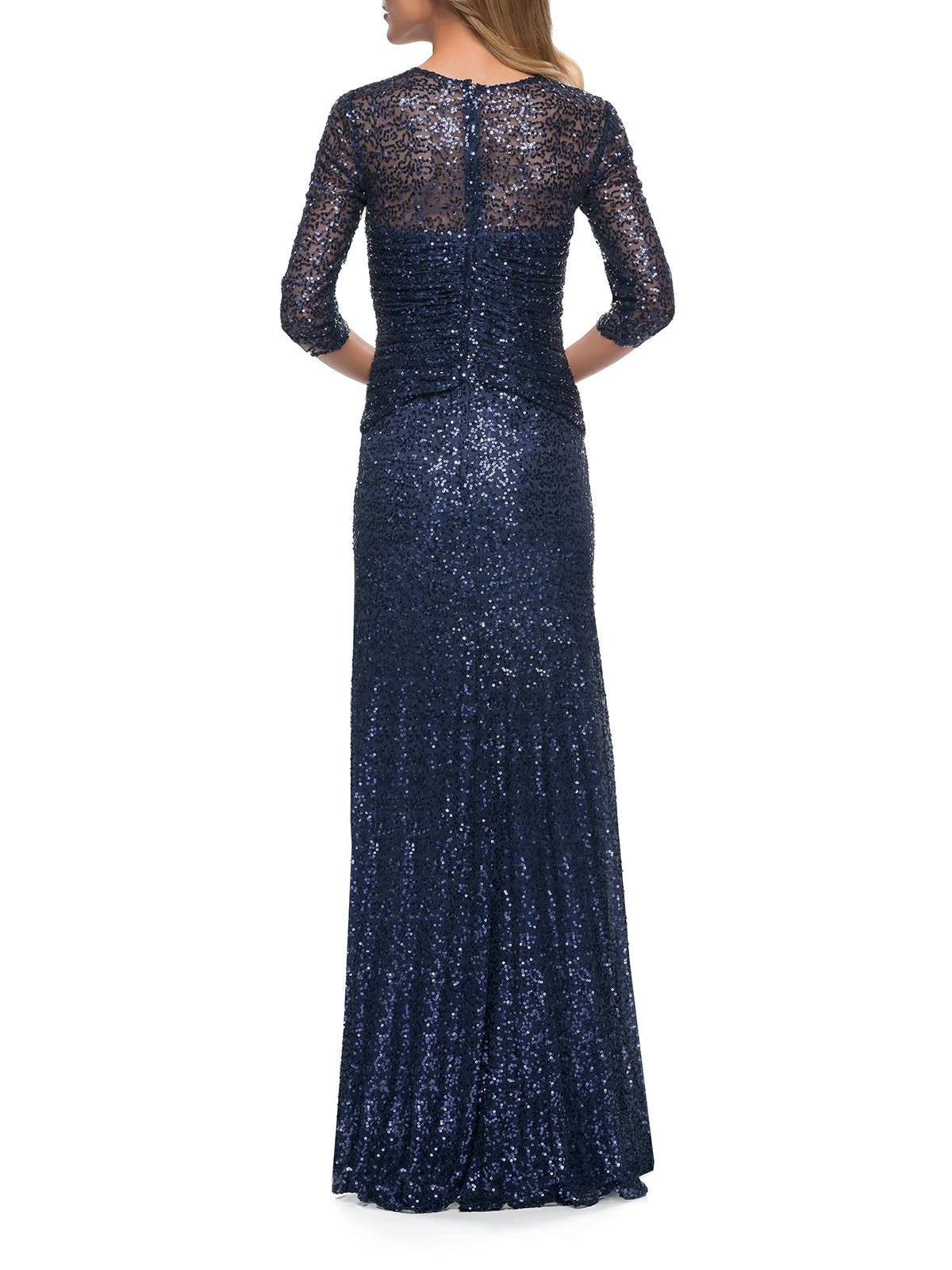 Floor length evening gown in sequin fabric with sheer three quarter sleeves. V neckline and knot at the waist. Back zipper closure.