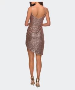 Asymmetrical short sequined homecoming dress with thin straps and a simple scoop back. back zipper closure.