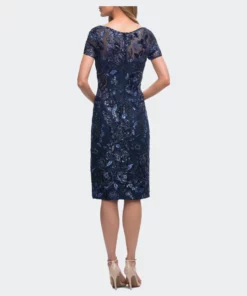 Gorgeous beaded floral design knee length dress with sheer high neckline and short sleeves. Back zipper closure.