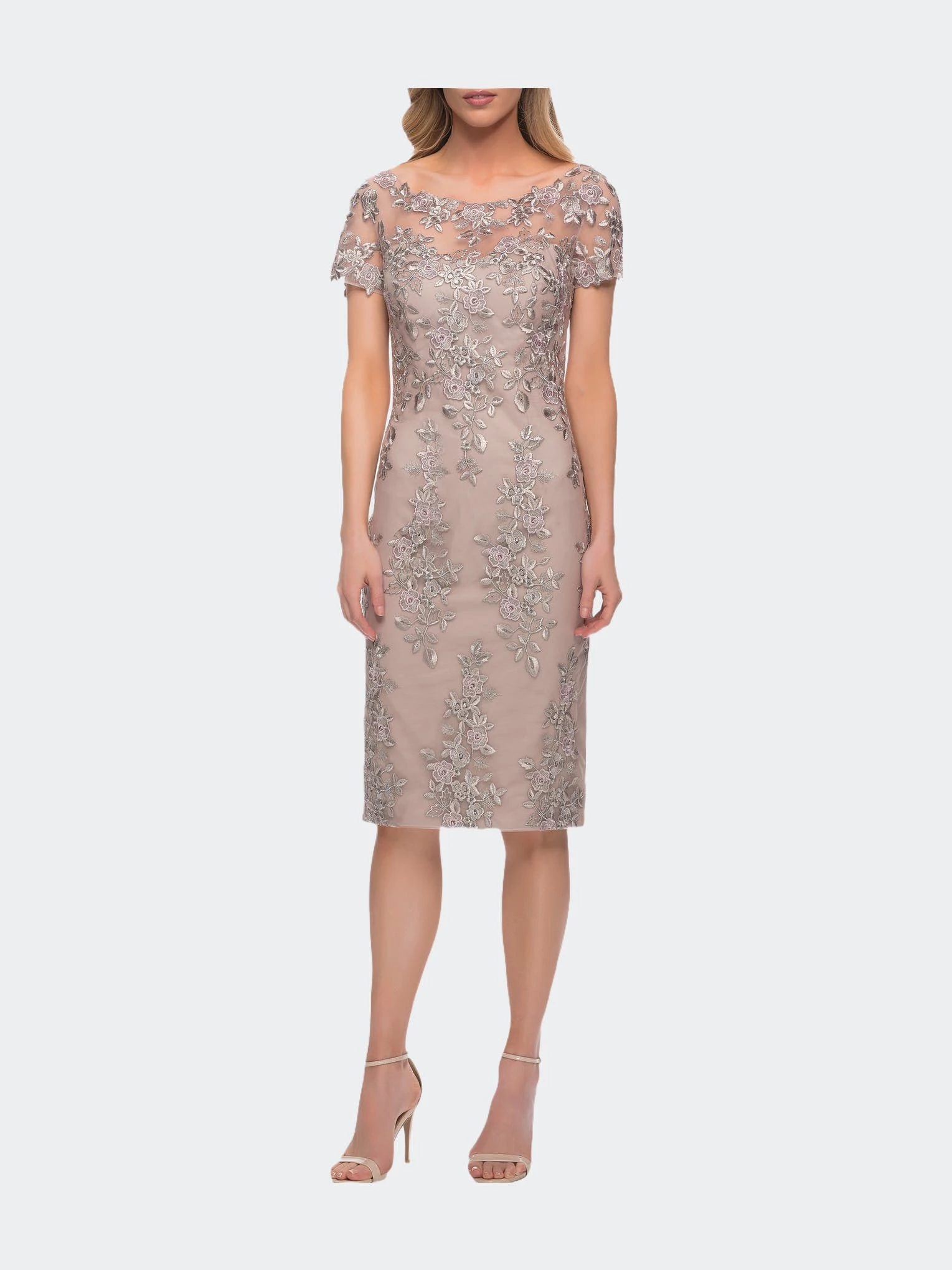 – Knee length dress with beautiful lace appliques throughout- Sheer high neckline- Short sleeves- Back zipper closure