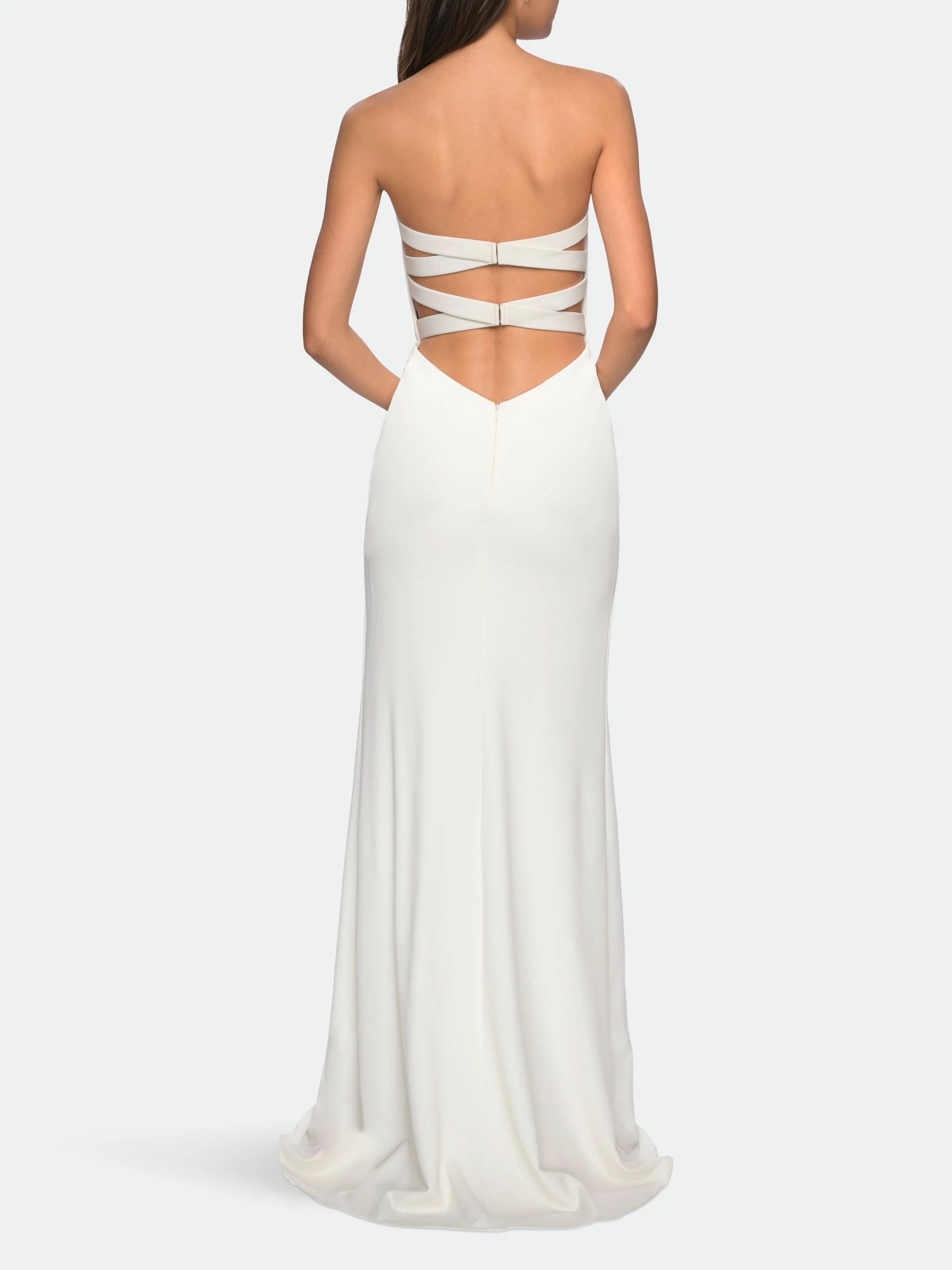 Form fitting strapless dress with cross over skirt. A front slit completes the look. Back zipper closure.