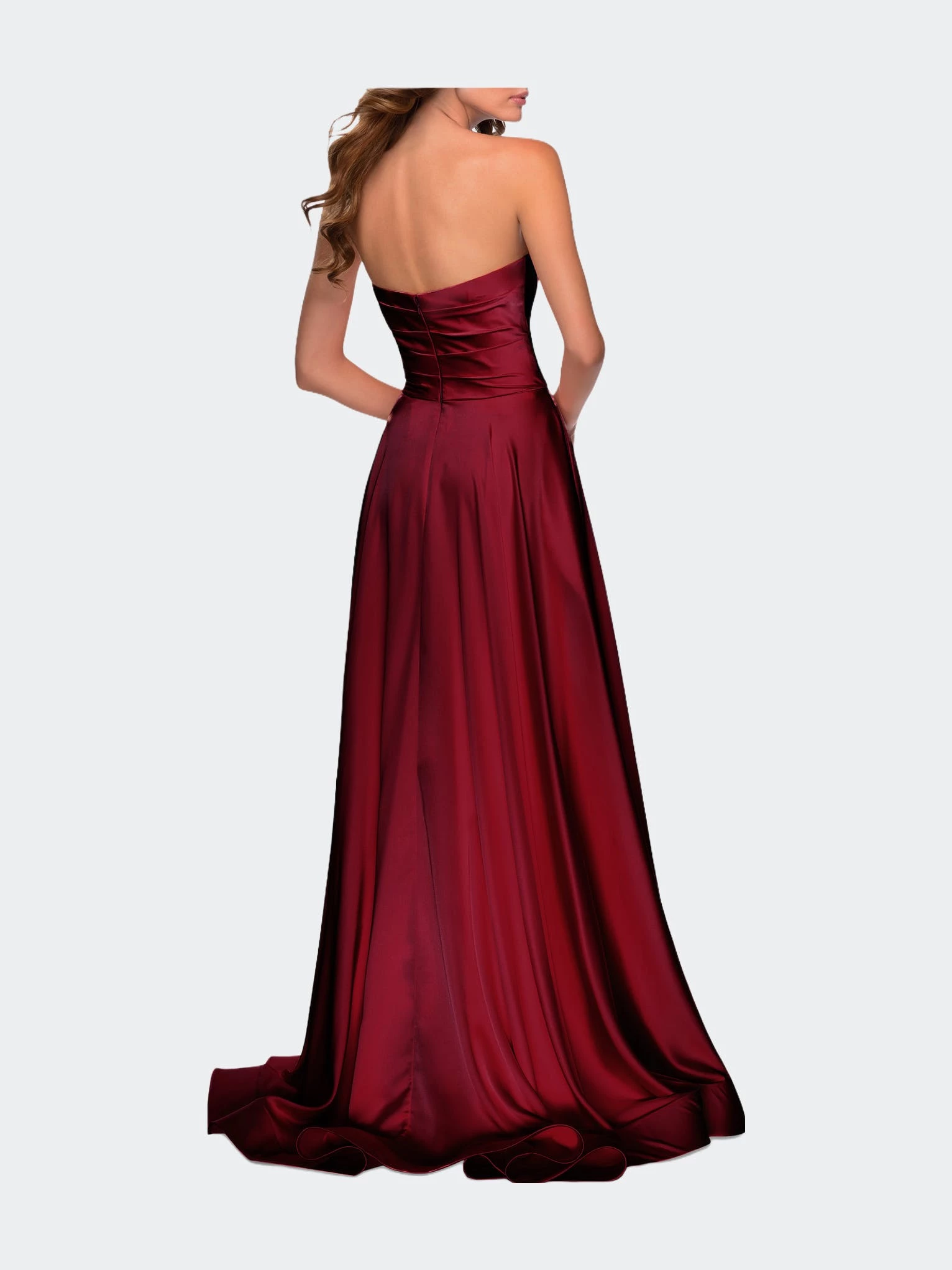 Long chic satin gown with pleated strapless bodice. This timeless look includes a full back, sweetheart neckline, and pockets. Back zipper closure.